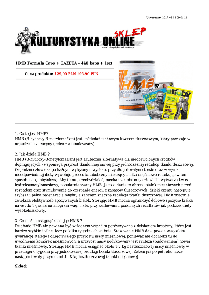 Utworzono: 2017-03-08 09:04:16 HMB Formula Caps + GAZETA - 440 kaps + 1szt Cena produktu: 129,00 PLN 105,90 PLN 1. Co to jest HMB? HMB (B-hydroxy-B-metylomaślan) jest krótkołańcuchowym kwasem tłuszczowym, który powstaje w organizmie z leucyny (jeden z aminokwasów). 2. Jak działa HMB ? HMB (B-hydroxy-B-metylomaślan) jest skuteczną alternatywą dla niedozwolonych środków dopingujących - wspomaga przyrost tkanki mięśniowej przy jednoczesnej redukcji tkanki tłuszczowej. Organizm człowieka po każdym wytężonym wysiłku, przy długotrwałym stresie oraz w wyniku nieodpowiedniej diety wywołuje proces kataboliczny niszczący białka mięśniowe redukując w ten sposób masę mięśniową. Aby temu przeciwdziałać, mechanizm obronny człowieka wytwarza kwas hydroksymetylomasłowy, popularnie zwany HMB. Jego zadanie to obrona białek mięśniowych przed rozpadem oraz stymulowanie do czerpania energii z zapasów tłuszczowych, dzięki czemu następuje szybsza i pełna regeneracja mięśni, a zarazem znaczna redukcja tkanki tłuszczowej. HMB znacznie zwiększa efektywność spożywanych białek. Stosując HMB można ograniczyć dobowe spożycie białka nawet do 1 grama na kilogram wagi ciała, przy zachowaniu podobnych rezultatów jak podczas diety wysokobiałkowej. 3. Co można osiągnąć stosując HMB ? Działanie HMB nie powinno być w żadnym wypadku porównywane z działaniem kreatyny, które jest bardzo szybkie i silne, lecz po kilku tygodniach słabnie. Stosowanie HMB daje przede wszystkim gwarancję stałego i długotrwałego przyrostu masy mięśniowej, ponieważ nie dochodzi tu do uwodnienia komórek mięśniowych, a przyrost masy podyktowany jest syntezą (budowaniem) nowej tkanki mięśniowej. Stosując HMB można osiągnąć około 1-2 kg beztłuszczowej masy mięśniowej w przeciągu 6 tygodni przy jednoczesnej redukcji tkanki tłuszczowej. Zatem już po pół roku może nastąpić trwały przyrost od 4 - 8 kg beztłuszczowej tkanki mięśniowej. Skład: skład w porcji dziennej (6 kapsułek) jednostka HMB 3012 mg Wapń 720 mg rda 90% *RDA - rekomendowane dzienne zapotrzebowanie Sposób użycia: Amerykańskie testy wykazały, że suplementacja 2,5g (czyli 3g Ca-HMB) dziennie pokrywa znaczną część zapotrzebowania organizmu na HMB. Odpowiednie dawkowanie, to około 0,15 grama na każde 10kg masy ciała bezpośrednio po treningu. Kolejne dawki należy spożywać w ciągu 24 godzin po treningu od 2 do 3 razy dziennie po 0,10g na każde 10kg masy ciała. Najlepsze pory przyjmowania to rano po przebudzeniu oraz przed snem. Warunkiem budowania trwałej masy mięśniowej jest maksymalizowanie procesów anabolicznych i minimalizowanie procesów katabolicznych. W pierwszym i drugim procesie kluczową rolę odgrywa HMB. Surowiec importowany jest z amerykańskiego laboratorium Metabolic Technologies Inc. GAZETA - 1szt LOSOWO WYBRANY NUMER CZASOPISMA. TREC - HMB Formula Caps - 440kaps - Black Friday Ilość Adres: http://www.ko.sklep.pl/ - Telefon: kom. 782 010 880 Email: [email protected]