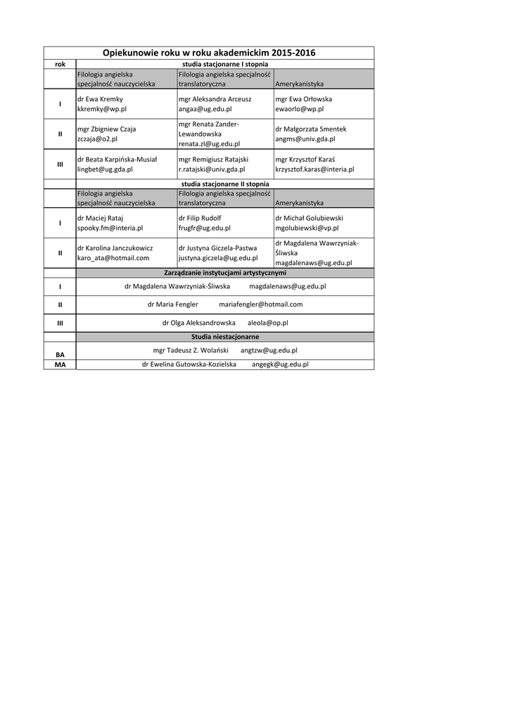 Opiekunowie roku w roku akademickim 2015-2016 Filologia angielska specjalność nauczycielska studia stacjonarne I stopnia Filologia angielska specjalność translatoryczna Amerykanistyka I dr Ewa Kremky [email protected] mgr Aleksandra Arceusz [email protected] mgr Ewa Orłowska [email protected] II mgr Zbigniew Czaja [email protected] mgr Renata ZanderLewandowska [email protected] dr Małgorzata Smentek [email protected] III dr Beata Karpińska-Musiał [email protected] mgr Remigiusz Ratajski [email protected] mgr Krzysztof Karaś [email protected] Filologia angielska specjalność nauczycielska studia stacjonarne II stopnia Filologia angielska specjalność translatoryczna Amerykanistyka I dr Maciej Rataj [email protected] dr Filip Rudolf [email protected] II dr Karolina Janczukowicz [email protected] rok I II III dr Michał Golubiewski [email protected] dr Magdalena WawrzyniakŚliwska [email protected] Zarządzanie instytucjami artystycznymi dr Justyna Giczela-Pastwa [email protected] dr Magdalena Wawrzyniak-Śliwska dr Maria Fengler [email protected] [email protected] dr Olga Aleksandrowska [email protected] Studia niestacjonarne BA MA mgr Tadeusz Z. Wolański dr Ewelina Gutowska-Kozielska [email protected] [email protected]
