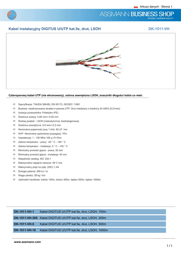 Arkusz danych - Strona 1 Kabel instalacyjny DIGITUS U/UTP kat.5e, drut, LSOH DK-1511-VH Czteroparowy kabel UTP (nie ekranowany), osłona zewnętrzna LSOH, znaczniki długości kabla co metr. • • • • • • • • • • • • • • • • • • • Specyfikacje: TIA/EIA 568-B2, EN 50173, ISO/IEC 11801 Budowa: nieekranowana skrętka 4 parowa UTP. Drut miedziany o średnicy 24 AWG (0,51mm) Izolacja przewodnika: Polietylen (PE) Średnica izolacji: 0,90 mm+-0,05 mm Rodzaj powłoki : LSOH (niskodymmna, bezhalogenowa) Średnica zewnętrzna: 5,0 mm+-0,3 mm Nominalna pojemność przy 1 kHz: 50 nF / km NVP -Nominalne opóźnienie propagacji: 70% Impedancja: 1 - 100 MHz 100 ą 15 Ohm Zakres temperatur - pracy: -20 ° C - +60 ° C Zakres temperatur - instalacja: 0 ° C - +50 ° C Minimalny promień gięcia - praca: 20 mm Minimalny promień gięcia - instalacja: 40 mm Niepalność według: IEC 332-1 Maksymalne napięcie robocze: 48 V rms Maksymalny prąd na żyłę: (25C) 1,4A Energia palenia: 290 kJ / m Waga (około): 28 kg / km Jednostki handlowe: karton 100m, karton 305m, bęben 500m, bęben 1000m. DK-1511-VH-1 Kabel DIGITUS U/UTP kat.5e, drut, LSOH, 100m DK-1511-VH-305 Kabel DIGITUS U/UTP kat.5e, drut, LSOH, 305m DK-1511-VH-5 Kabel DIGITUS U/UTP kat.5e, drut, LSOH, 500m DK-1511-VH-10 Kabel DIGITUS U/UTP kat.5e, drut, LSOH, 1000m www.assmann.com 1/1