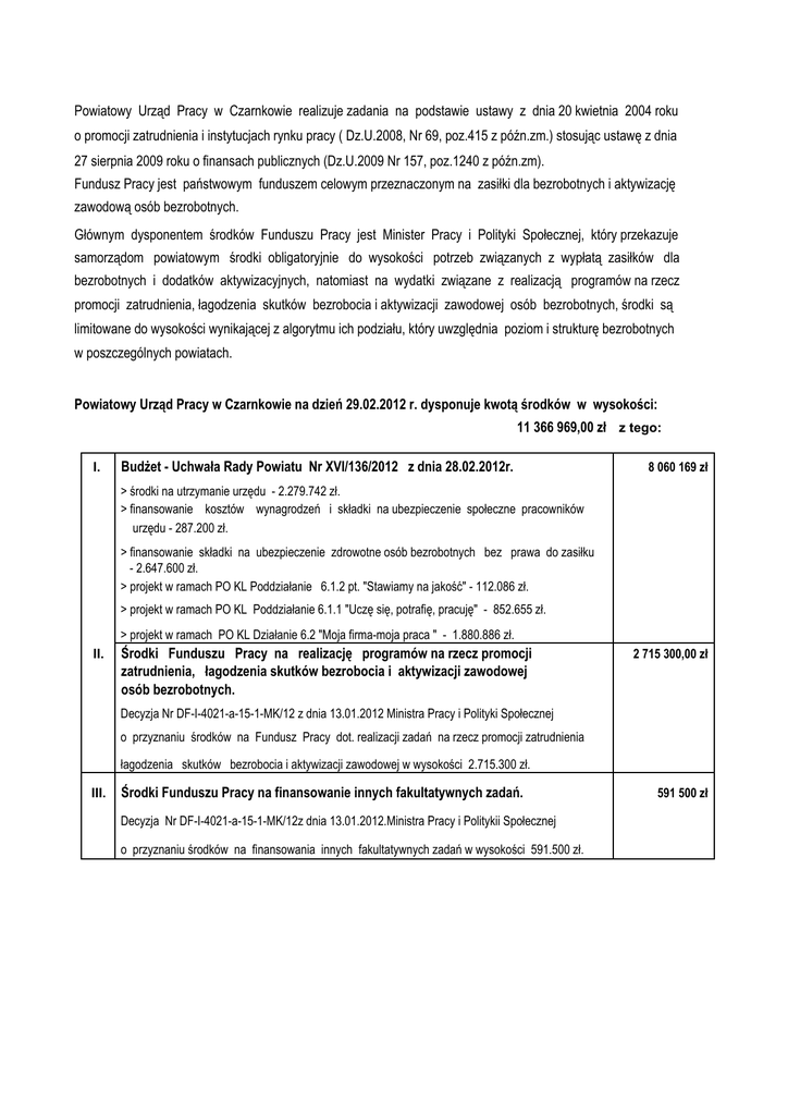 Powiatowy Urząd Pracy w Czarnkowie realizuje zadania na podstawie ustawy z dnia 20 kwietnia 2004 roku o promocji zatrudnienia i instytucjach rynku pracy ( Dz.U.2008, Nr 69, poz.415 z późn.zm.) stosując ustawę z dnia 27 sierpnia 2009 roku o finansach publicznych (Dz.U.2009 Nr 157, poz.1240 z późn.zm). Fundusz Pracy jest państwowym funduszem celowym przeznaczonym na zasiłki dla bezrobotnych i aktywizację zawodową osób bezrobotnych. Głównym dysponentem środków Funduszu Pracy jest Minister Pracy i Polityki Społecznej, który przekazuje samorządom powiatowym środki obligatoryjnie do wysokości potrzeb związanych z wypłatą zasiłków dla bezrobotnych i dodatków aktywizacyjnych, natomiast na wydatki związane z realizacją programów na rzecz promocji zatrudnienia, łagodzenia skutków bezrobocia i aktywizacji zawodowej osób bezrobotnych, środki są limitowane do wysokości wynikającej z algorytmu ich podziału, który uwzględnia poziom i strukturę bezrobotnych w poszczególnych powiatach. Powiatowy Urząd Pracy w Czarnkowie na dzień 29.02.2012 r. dysponuje kwotą środków w wysokości: 11 366 969,00 zł z tego: I. Budżet - Uchwała Rady Powiatu Nr XVI/136/2012 z dnia 28.02.2012r. 8 060 169 zł > środki na utrzymanie urzędu - 2.279.742 zł. > finansowanie kosztów wynagrodzeń i składki na ubezpieczenie społeczne pracowników urzędu - 287.200 zł. > finansowanie składki na ubezpieczenie zdrowotne osób bezrobotnych bez prawa do zasiłku - 2.647.600 zł. > projekt w ramach PO KL Poddziałanie 6.1.2 pt. "Stawiamy na jakość" - 112.086 zł. > projekt w ramach PO KL Poddziałanie 6.1.1 "Uczę się, potrafię, pracuję" - 852.655 zł. > projekt w ramach PO KL Działanie 6.2 "Moja firma-moja praca " - 1.880.886 zł. II. Środki Funduszu Pracy na realizację programów na rzecz promocji zatrudnienia, łagodzenia skutków bezrobocia i aktywizacji zawodowej osób bezrobotnych. 2 715 300,00 zł Decyzja Nr DF-I-4021-a-15-1-MK/12 z dnia 13.01.2012 Ministra Pracy i Polityki Społecznej o przyznaniu środków na Fundusz Pracy dot. realizacji zadań na rzecz promocji zatrudnienia łagodzenia skutków bezrobocia i aktywizacji zawodowej w wysokości 2.715.300 zł. III. Środki Funduszu Pracy na finansowanie innych fakultatywnych zadań. Decyzja Nr DF-I-4021-a-15-1-MK/12z dnia 13.01.2012.Ministra Pracy i Politykii Społecznej o przyznaniu środków na finansowania innych fakultatywnych zadań w wysokości 591.500 zł. 591 500 zł str.2 I. Plan finansowy budżetu działalności podstawowej Powiatowego Urzędu Pracy w Czarnkowie - 2012r. Paragraf Nazwa paragrafu Plan finansowy na 2012 rok 3020 Wydatki osobowe niezaliczone do wynagrodzeń 4010 Wynagrodzenia osobowe pracowników 6 336 1 483 395 4040 Dodatkowe wynagrodzenie roczne 153 637 4110 Składki na ubezpieczenie społeczne 244 323 4120 Składka na Fundusz Pracy 45 756 4210 Zakup materiałów i wyposażenia 51 267 4260 Zakup energii 71 600 4270 Zakup usług remontowych 12 200 4280 Zakup usług zdrowotnych 1 600 4300 Zakup usług pozostałych 27 063 4360 Opłaty z tyt. zakupu usług telekomunikacyjnych świadczonych w ruchomej publicznej sieci 3 500 telefonicznej 4370 Opłaty z tyt. zakupu usług telekomunikacyjnych świadczonych w stacjonarnej publicznej 12 000 sieci telefonicznej 4440 Opłaty za administrowanie i czynsze za budynki, lokale i pomieszczenia garażowe 57 780 4410 Podróże służbowe krajowe 24 300 4430 Różne opłaty i składki 4440 Odpisy na ZFŚS 5 000 62 355 4480 Podatek od nieruchomości 5 850 4520 Opłaty na rzecz budżetów jst 1 780 4700 Szkolenia pracowników niebędących członkami korpusu służby cywilnej 10 000 Razem: 2 279 742 str.3 Powiatowy Urząd Pracy w Czarnkowie oprócz środków finansowych przeznaczonych na utrzymanie urzędu otrzymał również środki finansowe na: 1.Finansowanie kosztów wynagrodzenia i składek na ubezpieczenie społeczne pracowników urzędu. 2.Zadania zlecone - składka na ubezpieczenie zdrowotne osób bezrobotnych bez prawa do zasiłku. 3.Projekt pn."Stawiamy na jakość" w ramach PO KL wspólfinansowany ze środków Europejskiego Funduszu Społecznego Nr umowy PO KL 06.02-30-025/09-00 Priorytet VI-Rynek pracy otwarty dla wszystkich, działanie 6.1-Poprawa dostępu do zatrudnienia oraz wspieranie aktywności w regionie, poddziałanie 6.1.2 - Wsparcie powiatowych i wojewódzkich urzędów pracy w realizacji zadań na rzecz aktywizacji zawodowej osób bezrobotnych w regionie. 4.Projekt "Uczę się,potrafię,pracuję" w ramach PO KL współfinansowany ze środków Europejskiego Funduszu Społecznego. Nr umowy PO KL 06.01.01-30-003/11-00 Priorytet VI-Rynek pracy otwarty dla wszystkich, działanie 6.1-Poprawa dostępu do zatrudnienia oraz wspieranie aktywności w regionie, poddziałanie 6.1.1 - Wsparcie osób pozostających bez zatrudnienia na regionalnym rynku pracy. 5.Projekt "Moja firma-moja praca"w ramach PO KL współfinansowany ze środków Europejskiego Funduszu Społecznego Nr umowy PO KL 06.02.00-30-066/11-00 Priorytet VI - Rynek pracy otwarty dla wszystkich, działanie 6.2 - Wsparcie oraz promocja przedsiębiorczości i samozatrudnienia. 1.Finansowanie kosztów wynagrodzenia i składek na ubezpieczenie społeczne pracowników urzędu. W planie finansowym wydatków budżetowych, Powiatowy Urząd Pracy w Czarnkowie otrzymał środki na finansowanie wynagrodzeń pracowników urzędu. Środki finansowe zostały zagwarantowane urzędom pracy na podstawie art..9 ust.2a-2c ustawy z dnia 20 kwietnia 2004 roku o promocji zatrudnienia i instytucjach rynku pracy i stanowią 7%kwoty środków Funduszu Pracy ustalonej na rok poprzedni na realizację programów na rzecz promocji zatrudnienia, łagodzenia skutków bezrobocia i aktywizacji zawodowej z wyłączeniem kwot przyznanych z rezerwy dysponenta Funduszu Pracy.Kwota środków na wynagrodzenia i składki na ubezpieczenie od wynagrodzeń przekazywana jest przez Ministerstwo Pracy i Polityki Społecznej w okresach mies