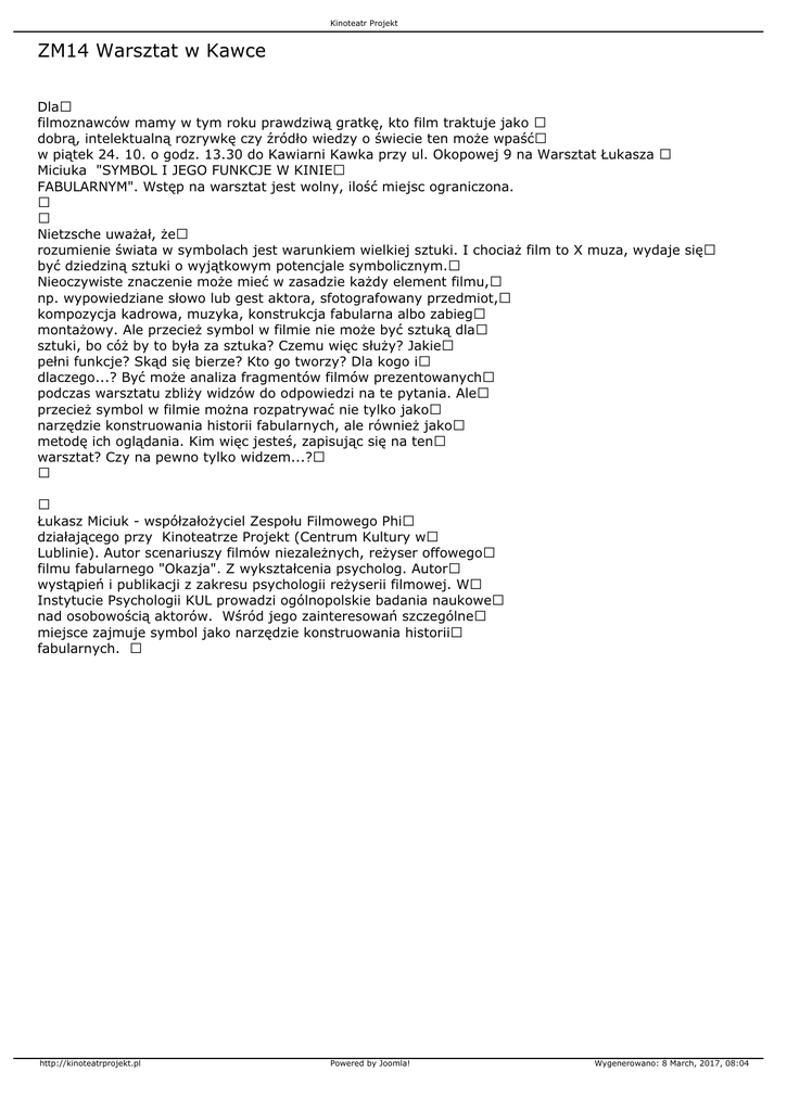 Kinoteatr Projekt ZM14 Warsztat w Kawce Dla filmoznawców mamy w tym roku prawdziwą gratkę, kto film traktuje jako dobrą, intelektualną rozrywkę czy źródło wiedzy o świecie ten może wpaść w piątek 24. 10. o godz. 13.30 do Kawiarni Kawka przy ul. Okopowej 9 na Warsztat Łukasza Miciuka "SYMBOL I JEGO FUNKCJE W KINIE FABULARNYM". Wstęp na warsztat jest wolny, ilość miejsc ograniczona. Nietzsche uważał, że rozumienie świata w symbolach jest warunkiem wielkiej sztuki. I chociaż film to X muza, wydaje się być dziedziną sztuki o wyjątkowym potencjale symbolicznym. Nieoczywiste znaczenie może mieć w zasadzie każdy element filmu, np. wypowiedziane słowo lub gest aktora, sfotografowany przedmiot, kompozycja kadrowa, muzyka, konstrukcja fabularna albo zabieg montażowy. Ale przecież symbol w filmie nie może być sztuką dla sztuki, bo cóż by to była za sztuka? Czemu więc służy? Jakie pełni funkcje? Skąd się bierze? Kto go tworzy? Dla kogo i dlaczego...? Być może analiza fragmentów filmów prezentowanych podczas warsztatu zbliży widzów do odpowiedzi na te pytania. Ale przecież symbol w filmie można rozpatrywać nie tylko jako narzędzie konstruowania historii fabularnych, ale również jako metodę ich oglądania. Kim więc jesteś, zapisując się na ten warsztat? Czy na pewno tylko widzem...? Łukasz Miciuk - współzałożyciel Zespołu Filmowego Phi działającego przy Kinoteatrze Projekt (Centrum Kultury w Lublinie). Autor scenariuszy filmów niezależnych, reżyser offowego filmu fabularnego "Okazja". Z wykształcenia psycholog. Autor wystąpień i publikacji z zakresu psychologii reżyserii filmowej. W Instytucie Psychologii KUL prowadzi ogólnopolskie badania naukowe nad osobowością aktorów. Wśród jego zainteresowań szczególne miejsce zajmuje symbol jako narzędzie konstruowania historii fabularnych. http://kinoteatrprojekt.pl Powered by Joomla! Wygenerowano: 8 March, 2017, 08:04