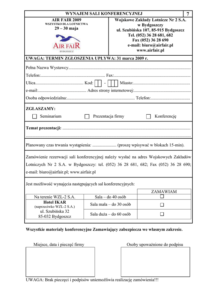 WYNAJEM SALI KONFERENCYJNEJ 7 AIR FAIR 2009 Wojskowe Zakłady Lotnicze Nr 2 S.A. WSZYSTKO DLA LOTNICTWA w Bydgoszczy 29 – 30 maja ul. Szubińska 107, 85-915 Bydgoszcz Tel. (052) 36 28 681, 682 Fax (052) 36 28 690 e-mail: [email protected] www.airfair.pl UWAGA: TERMIN ZGŁOSZENIA UPŁYWA: 31 marca 2009 r. Pełna Nazwa Wystawcy................................................................................................................ Telefon:........................................................... Fax:...................................................................... Ulica............................................ Kod: - Miasto:.................................................... e-mail:............................................ Adres strony internetowej:.................................................... Osoba odpowiedzialna:.............................................................. Telefon:.................................... ZGŁASZAMY: Seminarium Prezentacja firmy Konferencję Temat prezentacji: ..................................................................................................................... ....................................................................................................................................................... Planowany czas trwania wystąpienia: ...................... (proszę wpisywać w blokach 15-min). Zamówienie rezerwacji sali konferencyjnej należy wysłać na adres Wojskowych Zakładów Lotniczych Nr 2 S.A. w Bydgoszczy: tel. (052) 36 28 681, 682; Fax (052) 36 28 690; e-mail: [email protected]; www.airfair.pl Jest możliwość wynajęcia następujących sal konferencyjnych: ZAMAWIAM Na terenie WZL-2 S.A. Hotel IKAR (naprzeciwko WZL-2 S.A.) ul. Szubińska 32 85-032 Bydgoszcz Sala – do 40 osób Sala mała – do 30 osób Sala duża – do 60 osób k k Wszystkie materiały konferencyjne Zamawiający zabezpiecza we własnym zakresie. Miejsce, data i pieczęć firmy Osoby upoważnione do podpisu UWAGA: Brak pieczęci i podpisów uniemożliwia realizację zamówienia!!!