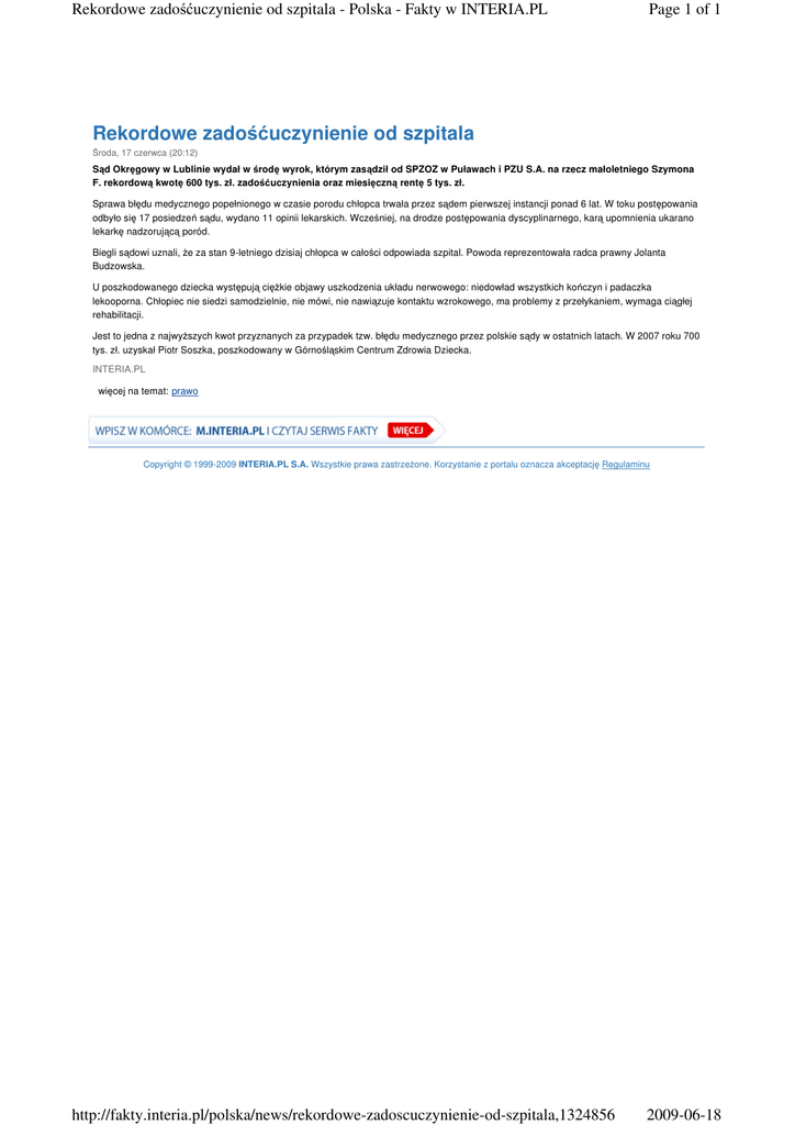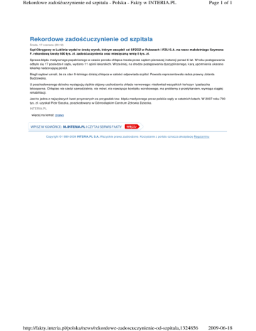 Rekordowe zadośćuczynienie od szpitala - Polska - Fakty w INTERIA.PL Page 1 of 1 Rekordowe zadośćuczynienie od szpitala Środa, 17 czerwca (20:12) Sąd Okręgowy w Lublinie wydał w środę wyrok, którym zasądził od SPZOZ w Puławach i PZU S.A. na rzecz małoletniego Szymona F. rekordową kwotę 600 tys. zł. zadośćuczynienia oraz miesięczną rentę 5 tys. zł. Sprawa błędu medycznego popełnionego w czasie porodu chłopca trwała przez sądem pierwszej instancji ponad 6 lat. W toku postępowania odbyło się 17 posiedzeń sądu, wydano 11 opinii lekarskich. Wcześniej, na drodze postępowania dyscyplinarnego, karą upomnienia ukarano lekarkę nadzorującą poród. Biegli sądowi uznali, że za stan 9-letniego dzisiaj chłopca w całości odpowiada szpital. Powoda reprezentowała radca prawny Jolanta Budzowska. U poszkodowanego dziecka występują ciężkie objawy uszkodzenia układu nerwowego: niedowład wszystkich kończyn i padaczka lekooporna. Chłopiec nie siedzi samodzielnie, nie mówi, nie nawiązuje kontaktu wzrokowego, ma problemy z przełykaniem, wymaga ciągłej rehabilitacji. Jest to jedna z najwyższych kwot przyznanych za przypadek tzw. błędu medycznego przez polskie sądy w ostatnich latach. W 2007 roku 700 tys. zł. uzyskał Piotr Soszka, poszkodowany w Górnośląskim Centrum Zdrowia Dziecka. INTERIA.PL więcej na temat: prawo Copyright © 1999-2009 INTERIA.PL S.A. Wszystkie prawa zastrzeżone. Korzystanie z portalu oznacza akceptację Regulaminu http://fakty.interia.pl/polska/news/rekordowe-zadoscuczynienie-od-szpitala,1324856 2009-06-18