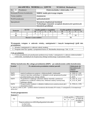 WYDZIAŁ Mechaniczny AKADEMIA MORSKA w GDYNI Nr 20 Przedmiot: Elektrotechnika i elektronika I, II Kierunek/Poziom kształcenia: MiBM/ studia pierwszego stopnia Forma studiów: stacjonarne Profil kształcenia: ogólnoakademicki Specjalność: Inżynieria eksploatacji instalacji Technologia remontów urządzeń okrętowych i portowych Inżynieria produkcji ECTS Semestr 3 3 I II Liczba godzin w tygodniu W C 2 1 L P Liczba godzin w semestrze S W C 30 15 L 2 P 30 Razem w czasie studiów: 75 Wymagania wstępne w zakresie wiedzy, umiejętności i innych kompetencji (jeśli dot. przedmiotu) 1. Wiedza i umiejętności w zakresie szkoły średniej 2. Program musi być zgodny z programem kursu of. Mechanika okrętowego. Tab. 3.1.20 Cele przedmiotu 1. Celem przedmiotu jest przekazanie podstawowej wiedzy i umiejętności w zakresie elektrotechniki i elektroniki, niezbędnych do bezpiecznej obsługi technicznego wyposażenia statku Efekty kształcenia dla całego przedmiotu (EKP) – po zakończeniu cyklu kształcenia: Po zakończeniu przedmiotu student potrafi: Symbol EKP1 EKP2 EKP3 EKP4 Odniesienie do kierunkowych efektów kształcenia K_W02; K_U05 K_U12; K_U013; K_K05; K_U01; K_U12; K_U22; K_K05 omówić podstawowe pojęcia z elektrotechniki i elektroniki omówić zjawiska zachodzące w układach cewek sprzężonych podać przykład praktyczny takiego układu Na podstawie zadanego schematu dobrać mierniki i pomierzyć podstawowe wielkości elektryczne, Dokonać analizy teoretycznej badanego układu. Przeprowadzić badania w układzie trójfazowym symetrycznym jak i niesymetrycznym K_W04; K_U09; K_W02, K_U08; K_K05 – symbole efektów kształcenia dla kierunku (W-wiedza, U-umiejętności, K-kompetencje społeczne) Treści programowe: Semestr I Lp. 1. Zagadnienia Liczba godzin W Pojęcia podstawowe (5.3.12 p.1),podział obwodów: a) prąd stały, b) przemienny, 1 C L/P Odniesienie do EKP dla przedmiotu EKP1 2. 3. 3. 4. c) jednostki układu SI. Elementy obwodu elektrycznego: źródła i odbiorniki prądu, rodzaje strzałkowania, mierniki. Obwody liniowe prądu elektrycznego: a) definicja prądu elektrycznego, rodzaje przewodzenia prądu, podział materiałów ze względu na przewodzenie prądu, przewodzenie w półprzewodnikach, d) pole elektryczne, natężenie pola elektrycznego, prąd przesunięcia, potencjał elektryczny, pojemność elektryczna, jednostka pojemności, kondensatory, obwód z kondensatorem i rezystancją, stała czasu obwodu z pojemnością, energia naładowanego kondensatora. b) prawo Ohma, wyjaśnienie pojęć: natężenie prądu, napięcie, siła elektromotoryczna, rezystancja, jednostki podstawowe, rezystancja przewodu, rezystywność, przewodność właściwa materiałów, cieplne działanie prądu, moc prądu elektrycznego, c) prawa Kirchhoffa, równania obwodów złożonych prądu stałego, reguły zapisywania równań, opis metod obliczania obwodów złożonych-zasada superpozycji, twierdzenie Thevenina. Elektromagnetyzm: a) pole magnetyczne, obraz pola, pole prądu elektrycznego, prawo Biota i Savarta, prawo Ampere’a, natężenie pola magnetycznego, pole cewki i przewodu, reguła korkociągu prawoskrętnego, mechaniczne oddziaływanie pola magnetycznego na prąd, prosty model silnika elektrycznego, reguła lewej ręki, indukcja magnetyczna, jednostka indukcji magnetycznej, inne modele siłowego działania pola, reguły kierunkowe działania prądu w polu magnetycznym, b) indukcja elektromagnetyczna, SEM indukcji, strumień magnetyczny, indukcyjność obwodu elektrycznego, jednostka strumienia magnetycznego i indukcyjności, reguły kierunkowe SEM indukcji, obwód z indukcyjnością, stała czasu obwodu z indukcyjnością, energia pola uzwojenia, zasada działania prądnicy elektrycznej, SEM przewodu w polu magnetycznym, c) magnesowanie ciał, przenikalność magnetyczna, rodzaje materiałów magnetycznych, ferromagnetyzm, charakterystyka magnesowania ferromagnetyku, miękkie i twarde materiały magnetyczne, obwód magnetyczny, prawo Ohma dla obwodu magnetycznego, reluktancja, siły magnetyczne w obwodach. Prąd zmienny, sinusoidalny: a) prąd przemienny sinusoidalny jednofazowy, parametry prądu sinusoidalnego (wartość średnia, skuteczna, maksymalna), analityczne, graficzne i symboliczne reprezentacje prądu sinusoidalnego, przesunięcie fazowe prądu i napięcia sinusoidalnego, moc chwilowa, moc średnia. b) proste obwody prądu sinusoidalnego (RL, RC, RLC), reaktancje, impedancja, admitancja, przesunięcie fazowe, prawo Ohma dla obwodów prostych, rezonans szeregowy i równoległy, c) równania obwodów prądu sinusoidalnego w przedstawieniu wektorowym (wskazowym)-metoda 1 EKP1 5 3 EKP1 3 1 EKP1 9 6 EKP1 symboliczna, obwody złożone prądu sinusoidalnego, moc czynna, bierna, pozorna, interpretacje mocy, d) Obwody trójfazowe: wektorowe przedstawienie prądów i napięć 3-fazowych, relacje ilościowe w układzie 3-fazowym, kojarzenie źródeł i odbiorników w układy /Y, symetria lub niesymetria układów 3- fazowych, moce w układach 3-fazowych, moc w układzie 3- i 4 - przewodowym, Wskaźnik kolejności faz. Elektronika: a) wybrane półprzewodnikowe przyrządy małej mocy, bariera styku p-n, dioda, tranzystor bipolarny, tranzystor polowy, podstawowe elementy optoelektroniczne, dioda LED, optron, elementy na ciekłych kryształach, b) podstawowe półprzewodniki energoelektroniczne, dioda dużej mocy, tyrystor klasyczny (SCR), tranzystor bipolarny dużej mocy, tranzystor z bramką napięciową IGBT, tyrystor GTO, tyrystor MCT, c) wprowadzenie do układów cyfrowych, d) wybrane układy elektroniki. Układy cewek sprzężonych: a) zaciski jednoimienne, schematy zastępcze, współczynnik sprzężenia. b) Przykład zastosowania sprzężenia magnetycznegotransformator (5.3.12 p.9) Obwody nieliniowe: Metoda analizy obwodów z elementami nieliniowymi Przebiegi odkształcone Szereg Fouriera, analiza harmoniczna, THD Stany przejściowe w obwodach elektrycznych: Obwody 