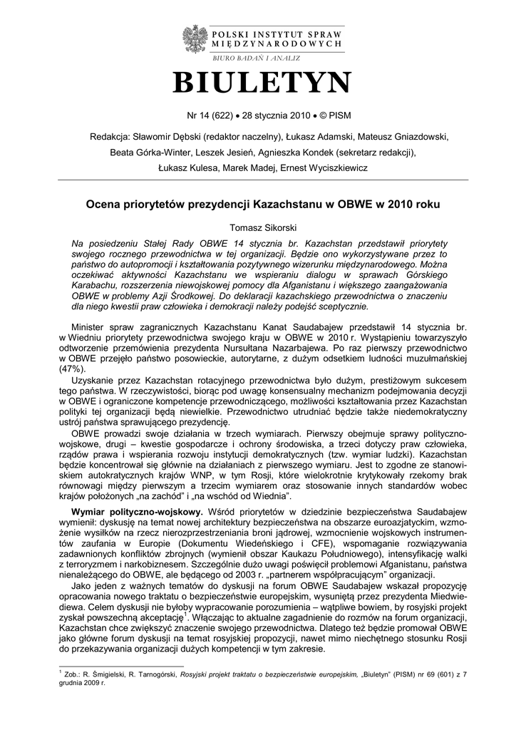 BIURO BADAŃ I ANALIZ BIULETYN Nr 14 (622) 28 stycznia 2010 © PISM Redakcja: Sławomir Dębski (redaktor naczelny), Łukasz Adamski, Mateusz Gniazdowski, Beata Górka-Winter, Leszek Jesień, Agnieszka Kondek (sekretarz redakcji), Łukasz Kulesa, Marek Madej, Ernest Wyciszkiewicz Ocena priorytetów prezydencji Kazachstanu w OBWE w 2010 roku Tomasz Sikorski Na posiedzeniu Stałej Rady OBWE 14 stycznia br. Kazachstan przedstawił priorytety swojego rocznego przewodnictwa w tej organizacji. Będzie ono wykorzystywane przez to państwo do autopromocji i kształtowania pozytywnego wizerunku międzynarodowego. Można oczekiwać aktywności Kazachstanu we wspieraniu dialogu w sprawach Górskiego Karabachu, rozszerzenia niewojskowej pomocy dla Afganistanu i większego zaangażowania OBWE w problemy Azji Środkowej. Do deklaracji kazachskiego przewodnictwa o znaczeniu dla niego kwestii praw człowieka i demokracji należy podejść sceptycznie. Minister spraw zagranicznych Kazachstanu Kanat Saudabajew przedstawił 14 stycznia br. w Wiedniu priorytety przewodnictwa swojego kraju w OBWE w 2010 r. Wystąpieniu towarzyszyło odtworzenie przemówienia prezydenta Nursułtana Nazarbajewa. Po raz pierwszy przewodnictwo w OBWE przejęło państwo posowieckie, autorytarne, z dużym odsetkiem ludności muzułmańskiej (47%). Uzyskanie przez Kazachstan rotacyjnego przewodnictwa było dużym, prestiżowym sukcesem tego państwa. W rzeczywistości, biorąc pod uwagę konsensualny mechanizm podejmowania decyzji w OBWE i ograniczone kompetencje przewodniczącego, możliwości kształtowania przez Kazachstan polityki tej organizacji będą niewielkie. Przewodnictwo utrudniać będzie także niedemokratyczny ustrój państwa sprawującego prezydencję. OBWE prowadzi swoje działania w trzech wymiarach. Pierwszy obejmuje sprawy politycznowojskowe, drugi – kwestie gospodarcze i ochrony środowiska, a trzeci dotyczy praw człowieka, rządów prawa i wspierania rozwoju instytucji demokratycznych (tzw. wymiar ludzki). Kazachstan będzie koncentrował się głównie na działaniach z pierwszego wymiaru. Jest to zgodne ze stanowiskiem autokratycznych krajów WNP, w tym Rosji, które wielokrotnie krytykowały rzekomy brak równowagi między pierwszym a trzecim wymiarem oraz stosowanie innych standardów wobec krajów położonych „na zachód” i „na wschód od Wiednia”. Wymiar polityczno-wojskowy. Wśród priorytetów w dziedzinie bezpieczeństwa Saudabajew wymienił: dyskusję na temat nowej architektury bezpieczeństwa na obszarze euroazjatyckim, wzmożenie wysiłków na rzecz nierozprzestrzeniania broni jądrowej, wzmocnienie wojskowych instrumentów zaufania w Europie (Dokumentu Wiedeńskiego i CFE), wspomaganie rozwiązywania zadawnionych konfliktów zbrojnych (wymienił obszar Kaukazu Południowego), intensyfikację walki z terroryzmem i narkobiznesem. Szczególnie dużo uwagi poświęcił problemowi Afganistanu, państwa nienależącego do OBWE, ale będącego od 2003 r. „partnerem współpracującym” organizacji. Jako jeden z ważnych tematów do dyskusji na forum OBWE Saudabajew wskazał propozycję opracowania nowego traktatu o bezpieczeństwie europejskim, wysuniętą przez prezydenta Miedwiediewa. Celem dyskusji nie byłoby wypracowanie porozumienia – wątpliwe bowiem, by rosyjski projekt zyskał powszechną akceptację1. Włączając to aktualne zagadnienie do rozmów na forum organizacji, Kazachstan chce zwiększyć znaczenie swojego przewodnictwa. Dlatego też będzie promował OBWE jako główne forum dyskusji na temat rosyjskiej propozycji, nawet mimo niechętnego stosunku Rosji do przekazywania organizacji dużych kompetencji w tym zakresie. 1 Zob.: R. Śmigielski, R. Tarnogórski, Rosyjski projekt traktatu o bezpieczeństwie europejskim, „Biuletyn” (PISM) nr 69 (601) z 7 grudnia 2009 r. 2129 Polski Instytut Spraw Międzynarodowych Poruszenie kwestii związanych z nierozprzestrzenianiem i utylizacją broni jądrowej, w których Kazachstan osiągnął poważne sukcesy (skuteczne rozbrojenie nuklearne kraju, zamknięcie poligonów atomowych, wynegocjowanie układu z Semipałatyńska o bezatomowej strefie w Azji Środkowej), ma budować korzystny wizerunek tego państwa na świecie. Kazachstan może próbować wykorzystać przewodnictwo w OBWE do promowania idei umieszczenia na jego terytorium „banku paliwa atomowego”. Mimo zalet tego pomysłu, jego realizacja jest wątpliwa z powodu korupcji panującej w Kazachstanie i wynikających stąd obaw o bezpieczeństwo paliwa. Kazachstan zamierza zwiększyć wysiłki OBWE w rozwiązywaniu konfliktów. Na połowę lutego Saudabajew zapowiedział swoją wizytę w roli przewodniczącego OBWE na Kaukazie Południowym, co wskazuje na wolę zaangażowania się Kazachstanu w problem karabaski. Skonfliktowane Armenia i Azerbejdżan wykazują wolę dialogu, co zwiększa szansę na stopniowe zbliżanie ich stanowisk. Natomiast ze względu na możliwą negatywną reakcję Rosji i brak szans na szybkie rozwiązanie konfliktu nie należy liczyć, że Kazachstan silniej zaangażuje się w Gruzji. Najprawdopodobniej prezydencja ograniczy swoją aktywność w tej dziedzinie do współprzewodniczenia (obok UE i ONZ) rozmowom genewskim w sprawie Gruzji, których kolejna runda odbędzie się 28 stycznia. Kazachstan opowiada się za szerszym korzystaniem z niewojskowych środków stabilizacji w Afganistanie, w szczególności przez inwestycje w infrastrukturę, pomoc humanitarną, szkolenie funkcjonariuszy afgańskiej policji i straży granicznej, zwalczanie narkobiznesu i uszczelnienie granic. Kazachstan będzie miał możliwość zwrócenia uwagi na te problemy pełniąc funkcję moderatora dyskusji (m.in. na planowanej konferencji antyterrorystycznej w Astanie). Należy jednak pamiętać, że dotychczas OBWE było jedynie w niewielkim stopniu zaangażowane w Afganistanie, a w świetle trwających tam działań wojennych środki pozawojskowe proponowane przez