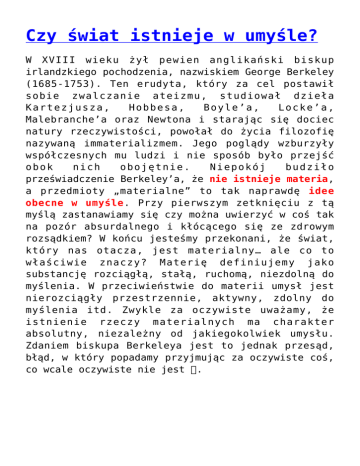 Czy świat istnieje w umyśle? W XVIII wieku żył pewien anglikański biskup irlandzkiego pochodzenia, nazwiskiem George Berkeley (1685-1753). Ten erudyta, który za cel postawił sobie zwalczanie ateizmu, studiował dzieła Kartezjusza, Hobbesa, Boyle’a, Locke’a, Malebranche’a oraz Newtona i starając się dociec natury rzeczywistości, powołał do życia filozofię nazywaną immaterializmem. Jego poglądy wzburzyły współczesnych mu ludzi i nie sposób było przejść obok nich obojętnie. Niepokój budziło przeświadczenie Berkeley’a, że nie istnieje materia, a przedmioty „materialne” to tak naprawdę idee obecne w umyśle. Przy pierwszym zetknięciu z tą myślą zastanawiamy się czy można uwierzyć w coś tak na pozór absurdalnego i kłócącego się ze zdrowym rozsądkiem? W końcu jesteśmy przekonani, że świat, który nas otacza, jest materialny… ale co to właściwie znaczy? Materię definiujemy jako substancję rozciągłą, stałą, ruchomą, niezdolną do myślenia. W przeciwieństwie do materii umysł jest nierozciągły przestrzennie, aktywny, zdolny do myślenia itd. Zwykle za oczywiste uważamy, że istnienie rzeczy materialnych ma charakter absolutny, niezależny od jakiegokolwiek umysłu. Zdaniem biskupa Berkeleya jest to jednak przesąd, błąd, w który popadamy przyjmując za oczywiste coś, co wcale oczywiste nie jest . Zobaczmy, twierdzenia. jak Berkeley uzasadniał swoje Wyobraźmy sobie, że bierzemy do ręki jakiś owoc, na przykład wiśnię. Widzimy ją, czujemy, smakujemy. Jest to rzecz jak najbardziej rzeczywista. Ale czy zastanawialiśmy się kiedykolwiek, na czym polega istnienie wiśni? Czy wiśnia jest czymś więcej niż wrażeniem miękkości, wilgotności, czerwoności, cierpkości? Berkeley odkrywa coś najbardziej elementarnego w naszym doświadczeniu – mianowicie, że przedmioty uważane za materialne niczym tak naprawdę nie różnią się od wrażeń zmysłowych. Usuńmy wrażenia miękkości, wilgotności, czerwoności, cierpkości, a nic nie pozostanie z wiśni – twierdził filozof. Stąd wniosek, że istnienie przedmiotów zmysłowych polega jedynie na tym, że są postrzegane. A jeśli są postrzegane, to ich istnienie jest niemożliwe bez postrzegającego ich umysłu. Są to więc idee, które istnieją w umyśle. Podstawą filozofii Berkeleya jest twierdzenie, że nie istnieją jakiekolwiek rzeczy, które ani nie postrzegają, ani nie są postrzegane. Nie może istnieć ani ciepło i zimno bez umysłu, który je odczuwa; nie może istnieć żaden obraz, żadna barwa czy światło bez umysłu, który je widzi; nie może istnieć żaden dźwięk bez umysłu, który go usłyszy; nie może istnieć żaden kształt ani cokolwiek co posiada rozciągłość przestrzenną bez umysłu, który percypuje za sprawą dotyku oraz wzroku. W związku z powyższym jest naturalne, że nie możemy wyobrazić sobie jakichkolwiek przedmiotów, których nie byłoby w umyśle. Jeśli nawet zamkniemy oczy i wyobrazimy sobie samotne drzewo rosnące na wzgórzu i przez nikogo nieoglądane, to przecież my sami je sobie wyobrażamy, ono istnieje już w nas. Sama natura zaś, to nic innego, jak „widzialne ciągi skutków lub wrażeń zmysłowych wyrytych w naszych umysłach według pewnych stałych i ogólnych praw”. Prawa przyrody to prawa rządzące ideami zawartymi w umysłach, nie zaś prawa rządzące jakąś abstrakcyjną, nieznaną nikomu materią. Myliłby się jednak ktoś, kto twierdziłby, że Berkeley nie wierzy w rzeczywistość świata, że każe nam traktować przyrodę i nasze własne ciała, jakby ich faktycznie nie było. Świat istnieje rzeczywiście, ale jego natura nie ma charakteru materialnego, lecz psychiczny. Po prostu świat istnieje, ponieważ postrzega go jakiś umysł. W systemie Berkeleya istnieją tylko następujące byty: duchy, Bóg oraz idee. O duchach dowiadujemy się z faktu, iż postrzegane przez nas kombinacje idei wskazują na istnienie odrębnych istot zdolnych do działania, które są do nas podobne. Immaterializm Berkeley’a nie zakłada więc, że inni ludzie są tylko wytworami naszej wyobraźni. Ktoś sceptycznie nastawiony do poglądu, że rzeczy zmysłowe istnieją tylko o tyle, o ile są postrzegane, mógłby powiedzieć: no dobrze, rozumiem, że jeśli patrzę teraz na monitor i czytam tę dziwną notkę na blogu, to znaczy, że ten monitor istnieje, bo jest obecny w moim umyśle. Ale co, jeśli wyjdę z pokoju i nikt już nie będzie patrzeć na ekran? Czy przestanie on istnieć? Jak pisałem na początku, Berkeley zwalczał ateizm. Skłoniło go do tego nie tylko objawienie chrześcijańskie, ale też spekulacje rozumowe. I rzeczywiście, jego system zawiera piękną, a przy tym niezwykłą w całej historii filozofii, obronę idei Boga. Otóż, skoro widzę, że przedmioty zmysłowe nie mogą istnieć inaczej jak w umyśle (jak wspomniany wyżej monitor komputera); skoro z doświadczenia wnoszę, że przedmioty zmysłowe nie zależą od mojej woli (wiem, że istnienie monitora nie jest zależne ode mnie w tym znaczeniu, że samą wolą nie mogą go usunąć i jeśli wyjdę z pokoju i do niego wrócę, monitor pozostanie na swoim miejscu); i skoro wiem również, że istnienie idei nie polega na tym, że są postrzegane wyłącznie przeze mnie, muszę założyć, że ich byt polega na obecności w umyśle, ale niekoniecznie tylko w moim umyśle. Musi zatem być jakiś inny umysł, w którym rzeczy istnieją, który widzi je zawsze, gdy ja ich nie oglądam. Berkeley uważał, że równie pewne jak „istnienie świata rzeczywistego jest to, że istnieje nieskończony wszechobecny Duch, który obejmuje świat i jest jego podporą”. Więc nie obawiajcie się, że kiedy zmęczeni kładziecie się spać i zapadacie w sen, świat wokół was przestaje istnieć. Świat ciągle trwa, bo jest stale oglądany przez doskonały umysł Boga. Niesamowity ten dowód na istnienie Boga, daje nam za