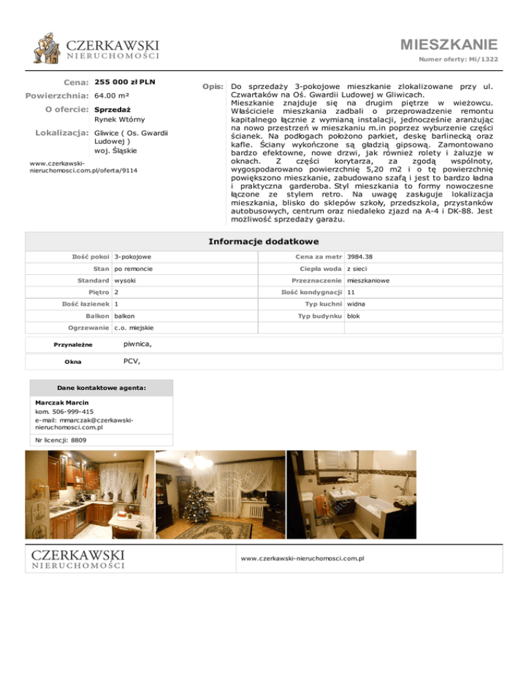 MIESZKANIE Numer oferty: Mi/1322 Cena: 255 000 zł PLN Powierzchnia: 64.00 m² O ofercie: Sprzedaż Rynek Wtórny Lokalizacja: Gliwice ( Os. Gwardii Ludowej ) woj. Śląskie www.czerkawskinieruchomosci.com.pl/oferta/9114 Opis: Do sprzedaży 3-pokojowe mieszkanie zlokalizowane przy ul. Czwartaków na Oś. Gwardii Ludowej w Gliwicach. Mieszkanie znajduje się na drugim piętrze w wieżowcu. Właściciele mieszkania zadbali o przeprowadzenie remontu kapitalnego łącznie z wymianą instalacji, jednocześnie aranżując na nowo przestrzeń w mieszkaniu m.in poprzez wyburzenie części ścianek. Na podłogach położono parkiet, deskę barlinecką oraz kafle. Ściany wykończone są gładzią gipsową. Zamontowano bardzo efektowne, nowe drzwi, jak również rolety i żaluzje w oknach. Z części korytarza, za zgodą wspólnoty, wygospodarowano powierzchnię 5,20 m2 i o tę powierzchnię powiększono mieszkanie, zabudowano szafą i jest to bardzo ładna i praktyczna garderoba. Styl mieszkania to formy nowoczesne łączone ze stylem retro. Na uwagę zasługuje lokalizacja mieszkania, blisko do sklepów szkoły, przedszkola, przystanków autobusowych, centrum oraz niedaleko zjazd na A-4 i DK-88. Jest możliwość sprzedaży garażu. Informacje dodatkowe Ilość pokoi 3-pokojowe Stan po remoncie Standard wysoki Piętro 2 Cena za metr 3984.38 Ciepła woda z sieci Przeznaczenie mieszkaniowe Ilość kondygnacji 11 Ilość łazienek 1 Typ kuchni widna Balkon balkon Typ budynku blok Ogrzewanie c.o. miejskie Przynależne Okna piwnica, PCV, Dane kontaktowe agenta: Marczak Marcin kom. 506-999-415 e-mail: [email protected] Nr licencji: 8809 www.czerkawski-nieruchomosci.com.pl