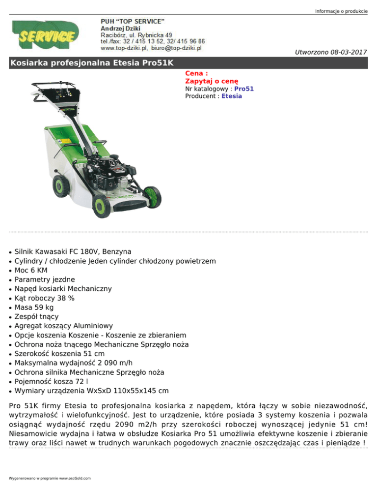 Informacje o produkcie Utworzono 08-03-2017 Kosiarka profesjonalna Etesia Pro51K Cena : Zapytaj o cenę Nr katalogowy : Pro51 Producent : Etesia ● ● ● ● ● ● ● ● ● ● ● ● ● ● ● ● Silnik Kawasaki FC 180V, Benzyna Cylindry / chłodzenie Jeden cylinder chłodzony powietrzem Moc 6 KM Parametry jezdne Napęd kosiarki Mechaniczny Kąt roboczy 38 % Masa 59 kg Zespół tnący Agregat koszący Aluminiowy Opcje koszenia Koszenie - Koszenie ze zbieraniem Ochrona noża tnącego Mechaniczne Sprzęgło noża Szerokość koszenia 51 cm Maksymalna wydajność 2 090 m/h Ochrona silnika Mechaniczne Sprzęgło noża Pojemność kosza 72 l Wymiary urządzenia WxSxD 110x55x145 cm Pro 51K firmy Etesia to profesjonalna kosiarka z napędem, która łączy w sobie niezawodność, wytrzymałość i wielofunkcyjność. Jest to urządzenie, które posiada 3 systemy koszenia i pozwala osiągnąć wydajność rzędu 2090 m2/h przy szerokości roboczej wynoszącej jedynie 51 cm! Niesamowicie wydajna i łatwa w obsłudze Kosiarka Pro 51 umożliwia efektywne koszenie i zbieranie trawy oraz liści nawet w trudnych warunkach pogodowych znacznie oszczędzając czas i pieniądze ! Wygenerowano w programie www.oscGold.com