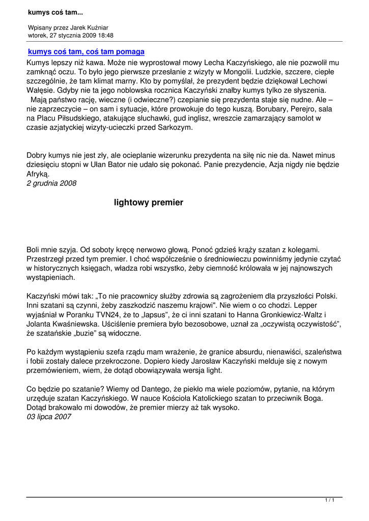 kumys coś tam... Wpisany przez Jarek Kuźniar wtorek, 27 stycznia 2009 18:48 kumys coś tam, coś tam pomaga Kumys lepszy niż kawa. Może nie wyprostował mowy Lecha Kaczyńskiego, ale nie pozwolił mu zamknąć oczu. To było jego pierwsze przesłanie z wizyty w Mongolii. Ludzkie, szczere, ciepłe szczególnie, że tam klimat marny. Kto by pomyślał, że prezydent będzie dziękował Lechowi Wałęsie. Gdyby nie ta jego noblowska rocznica Kaczyński znałby kumys tylko ze słyszenia. Mają państwo rację, wieczne (i odwieczne?) czepianie się prezydenta staje się nudne. Ale – nie zaprzeczycie – on sam i sytuacje, które prowokuje do tego kuszą. Borubary, Perejro, sala na Placu Piłsudskiego, atakujące słuchawki, gud inglisz, wreszcie zamarzający samolot w czasie azjatyckiej wizyty-ucieczki przed Sarkozym. Dobry kumys nie jest zły, ale ocieplanie wizerunku prezydenta na siłę nic nie da. Nawet minus dziesięciu stopni w Ułan Bator nie udało się pokonać. Panie prezydencie, Azja nigdy nie będzie Afryką. 2 grudnia 2008 lightowy premier Boli mnie szyja. Od soboty kręcę nerwowo głową. Ponoć gdzieś krąży szatan z kolegami. Przestrzegł przed tym premier. I choć współcześnie o średniowieczu powinniśmy jedynie czytać w historycznych księgach, władza robi wszystko, żeby ciemność królowała w jej najnowszych wystąpieniach. Kaczyński mówi tak: „To nie pracownicy służby zdrowia są zagrożeniem dla przyszłości Polski. Inni szatani są czynni, żeby zaszkodzić naszemu krajowi". Nie wiem o co chodzi. Lepper wyjaśniał w Poranku TVN24, że to „lapsus”, że ci inni szatani to Hanna Gronkiewicz-Waltz i Jolanta Kwaśniewska. Uściślenie premiera było bezosobowe, uznał za „oczywistą oczywistość”, że szatańskie „buzie” są widoczne. Po każdym wystąpieniu szefa rządu mam wrażenie, że granice absurdu, nienawiści, szaleństwa i fobii zostały dalece przekroczone. Dopiero kiedy Jarosław Kaczyński melduje się z nowym przemówieniem, wiem, że dotąd obowiązywała wersja light. Co będzie po szatanie? Wiemy od Dantego, że piekło ma wiele poziomów, pytanie, na którym urzęduje szatan Kaczyńskiego. W nauce Kościoła Katolickiego szatan to przeciwnik Boga. Dotąd brakowało mi dowodów, że premier mierzy aż tak wysoko. 03 lipca 2007 1/1