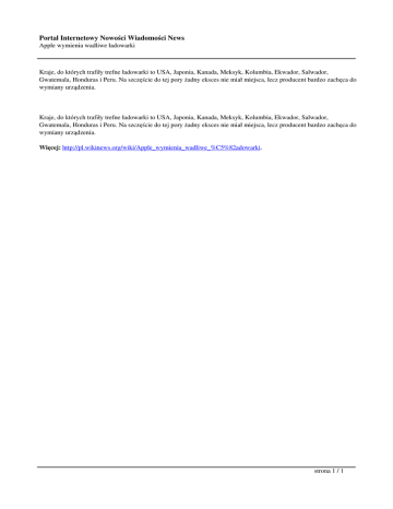 Portal Internetowy Nowości Wiadomości News Apple wymienia wadliwe ładowarki Kraje, do których trafiły trefne ładowarki to USA, Japonia, Kanada, Meksyk, Kolumbia, Ekwador, Salwador, Gwatemala, Honduras i Peru. Na szczęście do tej pory żadny eksces nie miał miejsca, lecz producent bardzo zachęca do wymiany urządzenia. Kraje, do których trafiły trefne ładowarki to USA, Japonia, Kanada, Meksyk, Kolumbia, Ekwador, Salwador, Gwatemala, Honduras i Peru. Na szczęście do tej pory żadny eksces nie miał miejsca, lecz producent bardzo zachęca do wymiany urządzenia. Więcej: http://pl.wikinews.org/wiki/Apple_wymienia_wadliwe_%C5%82adowarki. strona 1 / 1