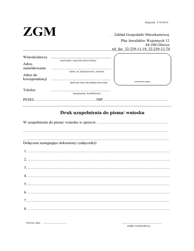Załącznik P 10-02.01 ZGM . Zakład Gospodarki Mieszkaniowej Plac Inwalidów Wojennych 12 44-100 Gliwice tel. fax 32-239-11-19, 32-239-12-74 Wnioskodawca ............................................................. (nazwisko i imię lub nazwa firmy) Adres zameldowania .……………………………………… (ulica, nr, kod pocztowy, miasto) Adres do korespondencji ………………………………… …… (jeśli jest inny niż podany powyżej) Telefon .……………………………………… (stacjonarny, komórkowy) PESEL …………….………………….………NIP.…………………………………………. Druk uzupełnienia do pisma/ wniosku W uzupełnieniu do pisma/ wniosku w sprawie: ……………………………………………… ………………………………………………………………………………………………… …………………………………………………………………………………………………. Dołączam następujące dokumenty (załączniki): 1. ………………………………………………………………………………………………. 2. ………………………………………………………………………………………………. 3. ………………………………………………………………………………………………. 4. ………………………………………………………………………………………………. 5. ..…………………………………………………………………………………………….. 6. ………………………………………………………………………………………………. 7. .…….……………………………………………………………………………………….. 8. ………………………………………………………………………………………………. Gliwice, dnia ……………… …………………………. podpis wnioskodawcy