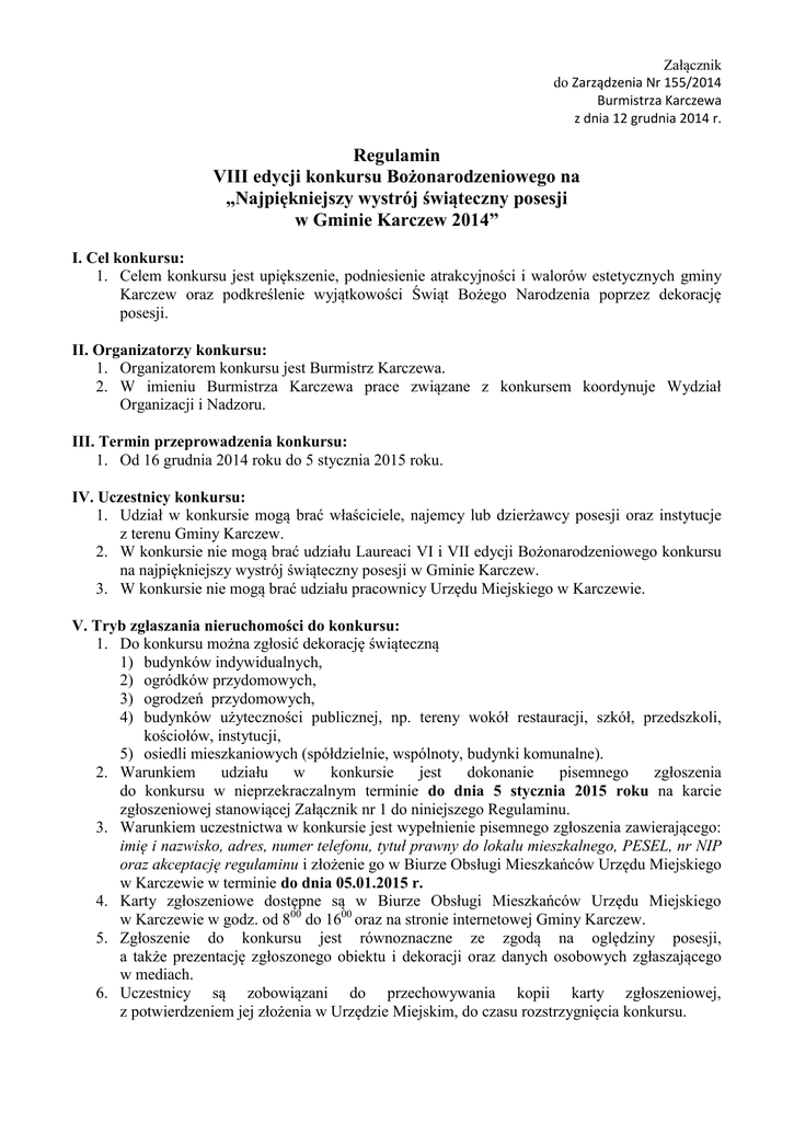 Załącznik do Zarządzenia Nr 155/2014 Burmistrza Karczewa z dnia 12 grudnia 2014 r. Regulamin VIII edycji konkursu Bożonarodzeniowego na „Najpiękniejszy wystrój świąteczny posesji w Gminie Karczew 2014” I. Cel konkursu: 1. Celem konkursu jest upiększenie, podniesienie atrakcyjności i walorów estetycznych gminy Karczew oraz podkreślenie wyjątkowości Świąt Bożego Narodzenia poprzez dekorację posesji. II. Organizatorzy konkursu: 1. Organizatorem konkursu jest Burmistrz Karczewa. 2. W imieniu Burmistrza Karczewa prace związane z konkursem koordynuje Wydział Organizacji i Nadzoru. III. Termin przeprowadzenia konkursu: 1. Od 16 grudnia 2014 roku do 5 stycznia 2015 roku. IV. Uczestnicy konkursu: 1. Udział w konkursie mogą brać właściciele, najemcy lub dzierżawcy posesji oraz instytucje z terenu Gminy Karczew. 2. W konkursie nie mogą brać udziału Laureaci VI i VII edycji Bożonarodzeniowego konkursu na najpiękniejszy wystrój świąteczny posesji w Gminie Karczew. 3. W konkursie nie mogą brać udziału pracownicy Urzędu Miejskiego w Karczewie. V. Tryb zgłaszania nieruchomości do konkursu: 1. Do konkursu można zgłosić dekorację świąteczną 1) budynków indywidualnych, 2) ogródków przydomowych, 3) ogrodzeń przydomowych, 4) budynków użyteczności publicznej, np. tereny wokół restauracji, szkół, przedszkoli, kościołów, instytucji, 5) osiedli mieszkaniowych (spółdzielnie, wspólnoty, budynki komunalne). 2. Warunkiem udziału w konkursie jest dokonanie pisemnego zgłoszenia do konkursu w nieprzekraczalnym terminie do dnia 5 stycznia 2015 roku na karcie zgłoszeniowej stanowiącej Załącznik nr 1 do niniejszego Regulaminu. 3. Warunkiem uczestnictwa w konkursie jest wypełnienie pisemnego zgłoszenia zawierającego: imię i nazwisko, adres, numer telefonu, tytuł prawny do lokalu mieszkalnego, PESEL, nr NIP oraz akceptację regulaminu i złożenie go w Biurze Obsługi Mieszkańców Urzędu Miejskiego w Karczewie w terminie do dnia 05.01.2015 r. 4. Karty zgłoszeniowe dostępne są w Biurze Obsługi Mieszkańców Urzędu Miejskiego w Karczewie w godz. od 800 do 1600 oraz na stronie internetowej Gminy Karczew. 5. Zgłoszenie do konkursu jest równoznaczne ze zgodą na oględziny posesji, a także prezentację zgłoszonego obiektu i dekoracji oraz danych osobowych zgłaszającego w mediach. 6. Uczestnicy są zobowiązani do przechowywania kopii karty zgłoszeniowej, z potwierdzeniem jej złożenia w Urzędzie Miejskim, do czasu rozstrzygnięcia konkursu. VI. Warunki przeprowadzenia konkursu: 1. Organizator konkursu zastrzega sobie prawo do odstąpienia od przeprowadzenia konkursu, jeżeli nie wpłyną do Urzędu Miejskiego w Karczewie, co najmniej 2 zgłoszenia. 2. Organizator konkursu zastrzega sobie prawo do nie rozpatrywania zgłoszeń, które wpłyną do Urzędu Miejskiego po terminie wskazanym w niniejszym Regulaminie. 3. Ostateczną decyzję w sprawie przeprowadzenia lub odstąpienia od przeprowadzenia konkursu podejmuje Komisja Konkursowa. 4. Decyzja komisji konkursowej jest ostateczna i nie podlega odwołaniu. VII. Kryteria oceny: 1. Staranność wykonania. 2. Innowacyjność dekoracji i pomysł na ozdobienie posesji. 3. Kompozycja przestrzenna. 4. Walory estetyczne. VIII. Komisja konkursowa: 1. Oceny posesji dokonywać będzie Komisja Konkursowa w składzie: 1) Przewodniczący – Krzysztof Szczegielniak 2) Członek – Marta Okońska, 3) Członek – Joanna Szczeplik. 2. Komisja konkursowa dokona indywidualnej oceny na Karcie Oceny, stanowiącej załącznik nr 2 do niniejszego Regulaminu. Przyjmuje się skalę ocen od 1 do 10 punktów. Ocena ostateczna jest wyliczoną średnią arytmetyczną ocen punktowych poszczególnych członków komisji. W przypadku równej ilości punktów decyduje głos Przewodniczącego Komisji. 3. Posesja, która zostanie najwyżej oceniona otrzyma tytuł „Najładniejszego Bożonarodzeniowego Wystroju na terenie Gminy Karczew w roku 2014” oraz nagrodę Burmistrza Karczewa. Organizator przewiduje możliwość przyznania wyróżnień. 4. Komisja konkursowa ogłosi wyniki konkursu do 16 stycznia 2015 r. IX. Rozstrzygnięcie konkursu: 1. Wyniki konkursu ogłoszone zostaną na stronie internetowej Gminy Karczew. 2. Zwycięzcy konkursu o terminie i miejscu wręczenia nagród zostaną powiadomieni telefonicznie. X. Nagrody: 1. I miejsce – 700 zł, 2. II miejsce – 500 zł, 3. III miejsce – 300 zł. XI. Postanowienia końcowe: Dodatkowe informacje o konkursie można uzyskać w Wydziale Organizacji i Nadzoru Urzędu Miejskiego w Karczewie pod nr tel. (22) 780 65 16 wew. 127