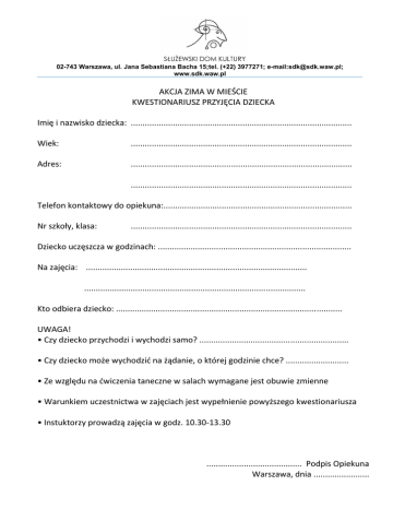 02-743 Warszawa, ul. Jana Sebastiana Bacha 15;tel. (+22) 3977271; e-mail:[email protected]; www.sdk.waw.pl AKCJA ZIMA W MIEŚCIE KWESTIONARIUSZ PRZYJĘCIA DZIECKA Imię i nazwisko dziecka: ............................................................................................... Wiek: ............................................................................................... Adres: ............................................................................................... ............................................................................................... Telefon kontaktowy do opiekuna:................................................................................. Nr szkoły, klasa: ............................................................................................... Dziecko uczęszcza w godzinach: ................................................................................... Na zajęcia: ............................................................................................... ............................................................................................... Kto odbiera dziecko: ................................................................................................. UWAGA! • Czy dziecko przychodzi i wychodzi samo? ................................................................ • Czy dziecko może wychodzić na żądanie, o której godzinie chce? ........................... • Ze względu na ćwiczenia taneczne w salach wymagane jest obuwie zmienne • Warunkiem uczestnictwa w zajęciach jest wypełnienie powyższego kwestionariusza • Instuktorzy prowadzą zajęcia w godz. 10.30-13.30 ......................................... Podpis Opiekuna Warszawa, dnia ........................