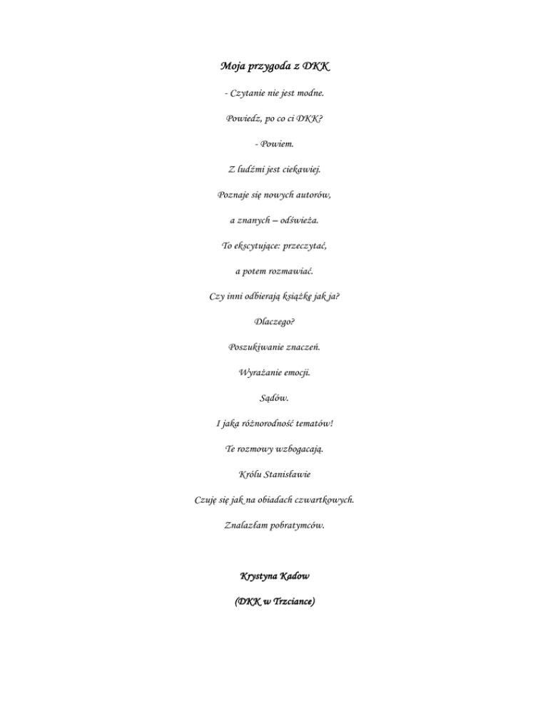Moja przygoda z DKK - Czytanie nie jest modne. Powiedz, po co ci DKK? - Powiem. Z ludźmi jest ciekawiej. Poznaje się nowych autorów, a znanych – odświeŜa. To ekscytujące: przeczytać, a potem rozmawiać. Czy inni odbierają ksiąŜkę jak ja? Dlaczego? Poszukiwanie znaczeń. WyraŜanie emocji. Sądów. I jaka róŜnorodność tematów! Te rozmowy wzbogacają. Królu Stanisławie Czuję się jak na obiadach czwartkowych. Znalazłam pobratymców. Krystyna Kadow (DKK w Trzciance)