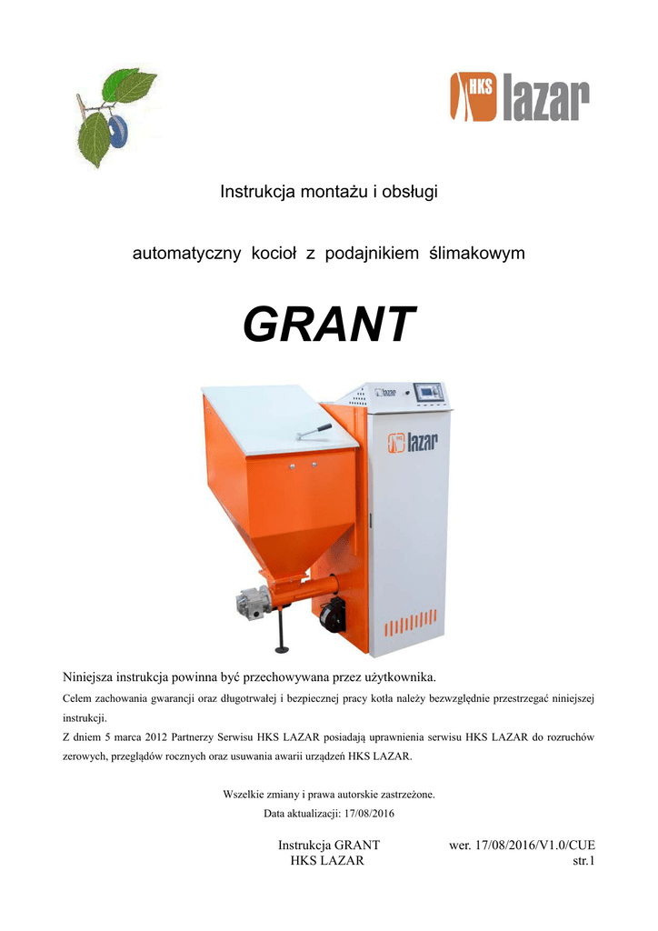 Instrukcja montażu i obsługi automatyczny kocioł z podajnikiem ślimakowym GRANT Niniejsza instrukcja powinna być przechowywana przez użytkownika. Celem zachowania gwarancji oraz długotrwałej i bezpiecznej pracy kotła należy bezwzględnie przestrzegać niniejszej instrukcji. Z dniem 5 marca 2012 Partnerzy Serwisu HKS LAZAR posiadają uprawnienia serwisu HKS LAZAR do rozruchów zerowych, przeglądów rocznych oraz usuwania awarii urządzeń HKS LAZAR. Wszelkie zmiany i prawa autorskie zastrzeżone. Data aktualizacji: 17/08/2016 Instrukcja GRANT HKS LAZAR wer. 17/08/2016/V1.0/CUE str.1 Szanowni Użytkownicy kotła GRANT! Dziękujemy za zaufanie jakim nas Państwo obdarzyli. Dołożymy wszelkich starań, aby użytkowanie naszego urządzenia było bezawaryjne, komfortowe i przyniosło Państwu wiele satysfakcji. Zakupiony przez Państwa GRANT należy do grona najnowocześniejszych urządzeń tego typu, przystosowanych do spalania paliw stałych podawanych w sposób automatyczny. Kocioł wyposażony jest w palnik retortowy z podajnikiem ślimakowym, umożliwiający spalanie w trybie automatycznym węgla brunatnego sortymentu Groszek o granulacji 5 ÷ 25 mm oraz granulatu Pellet. Kocioł zaprojektowano i wykonano zgodnie z aktualnymi trendami, wykorzystując najnowsze dostępne technologie z zakresu projektowania urządzeń grzewczych oraz z zastosowaniem nowoczesnych technologi spawalniczych. Rozwiązania konstrukcyjne wymiennika ciepła oraz palnika sprawiają, iż kocioł osiąga wysoką sprawność przy jednoczesnym zachowaniu prostoty obsługi i niskiej emisji substancji szkodliwych dla środowiska naturalnego. Cechy te sprawiły, że urządzenia serii GRANT otrzymały świadectwo urządzenia spełniającego kryteria standardu energetyczno – ekologicznego. Prosimy o zapoznanie się z niniejszą instrukcją oraz załączoną instrukcją sterownika, aby użytkowanie kotła było bezpieczne. W przypadku jakichkolwiek wątpliwości służymy pomocą. Z poważaniem, Marcin Lazar Instrukcja GRANT HKS LAZAR wer. 17/08/2016/V1.0/CUE str.2 Spis treści 1 Informacje ogólne.............................................................................................................................4 2 Zalecenia...........................................................................................................................................4 3 Wymagania dotyczące bezpieczeństwa............................................................................................5 4 Dane techniczne kotła.......................................................................................................................7 5 Budowa kotła....................................................................................................................................9 6 Rodzaje paliwa...............................................................................................................................15 7 Instrukcja obsługi dla użytkownika................................................................................................17 7.1 Rozpoczęcie pracy kotła.........................................................................................................17 7.2 Praca kotła...............................................................................................................................17 7.3 Konserwacja oraz czyszczenie kotła.......................................................................................19 7.4 Wygaszanie kotła....................................................................................................................21 8 Instrukcja instalacji kotła................................................................................................................23 8.1 Wnoszenie kotła......................................................................................................................24 8.2 Kotłownia – umiejscowienie urządzenia................................................................................24 8.3 Instalacja grzewcza.................................................................................................................25 9 Serwisowanie kotła.........................................................................................................................29 9.1 Kontrola przed rozruchem......................................................................................................29 9.2 Rozruch zerowy......................................................................................................................30 9.3 Usuwanie awarii.....................................................................................................................30 9.4 Przegląd roczny.......................................................................................................................31 10 Likwidacja urządzenia po okresie użytkowania...........................................................................32 12 Atesty i deklaracje........................................................................................................................35 13 Schemat elektryczny.....................................................................................................................36 Instrukcja GRANT HKS LAZAR wer. 17/08/2016/V1.0/CUE str.3 1 Informacje ogólne Kocioł GRANT 24 ED jest uniwersalnym kotłem wielopaliwowym wyposażonym w stalowy wymiennik. Wyposażony jest on w automatyczny palnik retortowy, który umożliwia spalanie węgla brunatnego sortymentu Groszek o granulacji 5 ÷ 25 mm oraz granulatu Pellet. Kocioł wyposażony jest w prosty i przejrzysty sterownik z oszczędną i komfortową regulację pogodową. Służy on do ogrzewania budynków za pośrednictwem instalacji systemów centralnego ogrzewania oraz podgrzewania wody użytkowej w bojlerach. Standardowo wraz z kotłem GRANT dostarczane są: • Instrukcja montażu i obsługi; • Instr