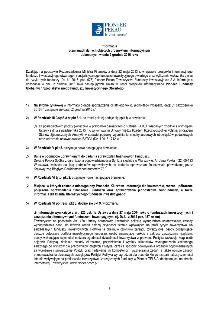 Informacja o zmianach danych objętych prospektem informacyjnym dokonanych w dniu 2 grudnia 2016 roku Działając na podstawie Rozporządzenia Ministra Finansów z dnia 22 maja 2013 r. w sprawie prospektu informacyjnego funduszu inwestycyjnego otwartego i specjalistycznego funduszu inwestycyjnego otwartego oraz wyliczania wskaźnika zysku do ryzyka tych funduszy (Dz. U. 2013, poz. 673) Pioneer Pekao Towarzystwo Funduszy Inwestycyjnych S.A. informuje o dokonaniu w dniu 2 grudnia 2016 roku następujących zmian w treści prospektu informacyjnego Pioneer Funduszy Globalnych Specjalistycznego Funduszu Inwestycyjnego Otwartego: 1) Na stronie tytułowej w informacji o dacie sporządzenia ostatniego tekstu jednolitego Prospektu datę: „1 października 2016 r.” zastępuje się datą: „2 grudnia 2016 r.” 2) W Rozdziale III Część A w pkt 6.1. po treści ppkt e) dodaje się ppkt f) w brzmieniu: „f) za pośrednictwem poczty (wyłącznie w przypadku oświadczeń o statusie FATCA składanych zgodnie z wymogiem Ustawy z dnia 9 października 2015 r. o wykonywaniu Umowy między Rządem Rzeczypospolitej Polskiej a Rządem Stanów Zjednoczonych Ameryki w sprawie poprawy wypełniania międzynarodowych obowiązków podatkowych oraz wdrożenia ustawodawstwa FATCA (Dz.U.2015.1712.)).” 3) W Rozdziale V pkt 5. otrzymuje nowe następujące brzmienie: „5. Dane o podmiocie uprawnionym do badania sprawozdań finansowych Funduszu. Deloitte Polska Spółka z ograniczoną odpowiedzialnością Sp. k. z siedzibą w Warszawie, Al. Jana Pawła II 22, 00-133 Warszawa, wpisana na listę podmiotów uprawnionych do badania sprawozdań finansowych prowadzoną przez Krajową Izbę Biegłych Rewidentów pod numerem 73.” 4) W Rozdziale VI tytuł pkt 2. otrzymuje nowe następujące brzmienie: „2. Miejsca, w których zostanie udostępniony Prospekt, Kluczowe Informacje dla Inwestorów, roczne i półroczne połączone sprawozdania finansowe Funduszu oraz sprawozdania jednostkowe Subfunduszy, a także informacja dla klienta alternatywnego funduszu inwestycyjnego” 5) W Rozdziale VI po treści pkt 8. dodaje się pkt 9. w brzmieniu: „9. Informacje wynikające z art. 220 ust. 1a Ustawy z dnia 27 maja 2004 roku o funduszach inwestycyjnych i zarządzaniu alternatywnymi funduszami inwestycyjnymi (tj. Dz.U. z 2014 poz. 157 ze zm) Towarzystwo na podstawie Art. 47a Ustawy opracowało i wdrożyło politykę wynagrodzeń ustanawiającą zasady wynagradzania osób, do których zadań należą czynności istotnie wpływające na profil ryzyka towarzystwa lub zarządzanych funduszy inwestycyjnych. Polityka ta obejmuje członków zarządu towarzystwa, osoby podejmujące decyzje dotyczące portfela inwestycyjnego funduszu, osoby sprawujące funkcje z zakresu zarządzania ryzykiem, osoby wykonujące czynności nadzoru zgodności działalności towarzystwa z prawem. Polityka wskazuje krąg osób objętych Polityką, definiuje zasady określania, przydzielenia i wypłaty składników wynagrodzenia zmiennego zależnego od wyników dla pracowników objętych Polityką, określa sposoby powoływania organów odpowiedzialnych za wdrożenie i prowadzenie Polityki oraz nadawania im kompetencji i wyznaczania zadań, a także opisuje zasady przeprowadzania okresowych przeglądów Polityki. Polityka wynagrodzeń dla osób do których zadań należą czynności istotnie wpływające na profil ryzyka towarzystwa i zarządzanych funduszy w Pioneer TFI S.A. dostępna jest na stronie internetowej Towarzystwa: www.pioneer.com.pl.” 1 6) W Rozdziale VII pkt 1. definicja pojęcia „Ustawa” otrzymuje nowe następujące brzmienie: „Ustawa – ustawa z dnia 27 maja 2004 roku o funduszach inwestycyjnych i zarządzaniu alternatywnymi funduszami inwestycyjnymi (tj. Dz.U. z 2014 poz. 157 ze zm);” 7) W Rozdziale VII pkt 2. w treści statutu Pioneer Funduszy Globalnych Specjalistycznego Funduszu Inwestycyjnego Otwartego dokonuje się następujących zmian: I. Art. 51 otrzymuje nowe następujące brzmienie: „Art. 51 [Obowiązki informacyjne wobec Uczestników] § 1. Przy zbywaniu Jednostek Uczestnictwa Fundusz bezpłatnie udostępnia Kluczowe Informacje dla Inwestorów oraz informację dla klienta alternatywnego funduszu inwestycyjnego. § 2. Fundusz jest obowiązany dostarczyć Uczestnikowi Funduszu bezpłatnie, na jego żądanie, połączone roczne i półroczne sprawozdanie finansowe Funduszu, sprawozdania jednostkowe Subfunduszy, prospekt informacyjny wraz z aktualnymi informacjami o zmianach w tym prospekcie, Kluczowe Informacje dla Inwestorów oraz informację dla klienta alternatywnego funduszu inwestycyjnego.” II. Art. 52 otrzymuje nowe następujące brzmienie: „Art. 52 [Ogłoszenia Funduszu] § 1. Na stronie internetowej http://www.pioneer.com.pl Fundusz publikuje: 1) Prospekt Informacyjny; 2) Kluczowe Informacje dla Inwestorów; 3) aktualne informacje o zmianach w Prospekcie Informacyjnym lub w Kluczowych Informacjach dla Inwestorów lub w informacji dla klienta alternatywnego funduszu inwestycyjnego; 4) roczne połączone sprawozdanie finansowe Funduszu wraz z rocznymi jednostkowymi sprawozdaniami finansowymi Subfunduszy; 5) półroczne połączone sprawozdanie finansowe Funduszu wraz z półrocznymi jednostkowymi sprawozdaniami finansowymi Subfunduszy; 6) zmiany Statutu wraz z informacją o terminie wejścia w życie tych zmian; 7) Wartość Aktywów Netto każdego z Subfunduszy na Jednostkę Uczestnictwa; 8) cenę zbywania i odkupywania Jednostek Uczestnictwa każdego z Subfunduszy; 9) informację o zmniejszeniu się Wartości Aktywów Netto Funduszu poniżej poziomu 2.500.000 zł; 10) informację dla klienta alternatywnego funduszu inwestycyjnego; 11) politykę wynagrodzeń; 12) pozostałe informacje związane z uczestnictwem w Subfunduszach. § 2. W dzienniku „Gazeta Giełdy Parkiet” Fundusz dokonuje ogłoszeń w przypadkach przewidzianych przepisami prawa. W przypadku, gdyby dziennik „Gazeta Giełdy Parkiet” przestał