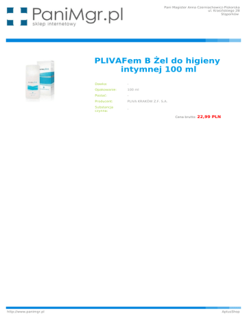Pani Magister Anna Czerniachowicz-Piskorska ul. Krasińskiego 2B Stąporków PLIVAFem B Żel do higieny intymnej 100 ml Dawka: - Opakowanie: 100 ml Postać: - Producent: PLIVA KRAKÓW Z.F. S.A. Substancja czynna: Cena brutto: http://www.panimgr.pl 22,99 PLN AptusShop