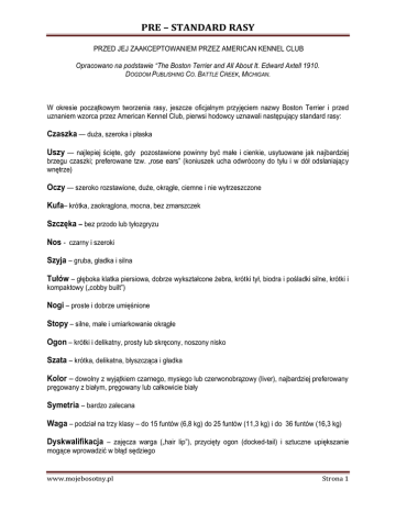 PRE – STANDARD RASY PRZED JEJ ZAAKCEPTOWANIEM PRZEZ AMERICAN KENNEL CLUB Opracowano na podstawie “The Boston Terrier and All About It. Edward Axtell 1910. DOGDOM PUBLISHING CO. BATTLE CREEK, MICHIGAN. W okresie początkowym tworzenia rasy, jeszcze oficjalnym przyjęciem nazwy Boston Terrier i przed uznaniem wzorca przez American Kennel Club, pierwsi hodowcy uznawali następujący standard rasy: Czaszka — duża, szeroka i płaska Uszy — najlepiej ścięte, gdy pozostawione powinny być małe i cienkie, usytuowane jak najbardziej brzegu czaszki; preferowane tzw. „rose ears” (koniuszek ucha odwrócony do tyłu i w dół odsłaniający wnętrze) Oczy — szeroko rozstawione, duże, okrągłe, ciemne i nie wytrzeszczone Kufa– krótka, zaokrąglona, mocna, bez zmarszczek Szczęka – bez przodo lub tyłozgryzu Nos - czarny i szeroki Szyja – gruba, gładka i silna Tułów – głęboka klatka piersiowa, dobrze wykształcone żebra, krótki tył, biodra i pośladki silne, krótki i kompaktowy („cobby built”) Nogi – proste i dobrze umięśnione Stopy – silne, małe i umiarkowanie okrągłe Ogon – krótki i delikatny, prosty lub skręcony, noszony nisko Szata – krótka, delikatna, błyszcząca i gładka Kolor – dowolny z wyjątkiem czarnego, mysiego lub czerwonobrązowy (liver), najbardziej preferowany pręgowany z białym, pręgowany lub całkowicie biały Symetria – bardzo zalecana Waga – podział na trzy klasy – do 15 funtów (6,8 kg) do 25 funtów (11,3 kg) i do 36 funtów (16,3 kg) Dyskwalifikacja – zajęcza warga („hair lip”), przycięty ogon (docked-tail) i sztuczne upiększanie mogące wprowadzić w błąd sędziego www.mojebosotny.pl Strona 1 PRE – STANDARD RASY SKALA PUNKTÓW STOSOWANA DO OCENY PSA: Głowa Kufa Nos Oczy Uszy Szyja Tułów Nogi i stopy Ogon Kolor i umaszczenie Symetria Razem Barnard’s Tom www.mojebosotny.pl 15 15 5 5 5 5 10 10 10 10 10 100 St Botolph’s Mistress King Strona 2