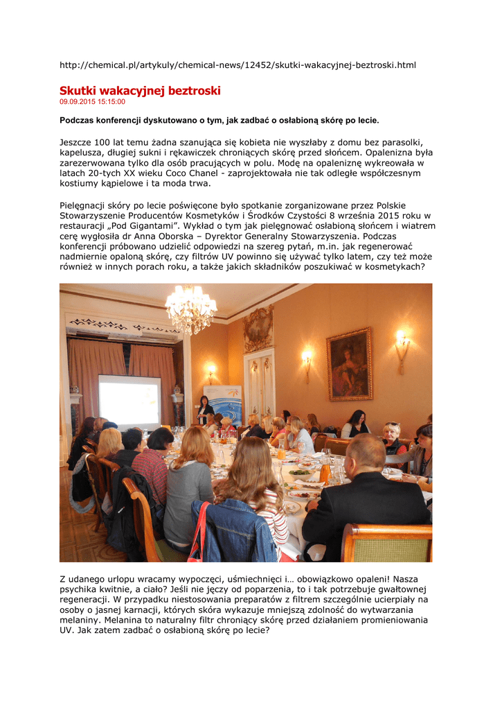 http://chemical.pl/artykuly/chemical-news/12452/skutki-wakacyjnej-beztroski.html Skutki wakacyjnej beztroski 09.09.2015 15:15:00 Podczas konferencji dyskutowano o tym, jak zadbać o osłabioną skórę po lecie. Jeszcze 100 lat temu żadna szanująca się kobieta nie wyszłaby z domu bez parasolki, kapelusza, długiej sukni i rękawiczek chroniących skórę przed słońcem. Opalenizna była zarezerwowana tylko dla osób pracujących w polu. Modę na opaleniznę wykreowała w latach 20-tych XX wieku Coco Chanel - zaprojektowała nie tak odległe współczesnym kostiumy kąpielowe i ta moda trwa. Pielęgnacji skóry po lecie poświęcone było spotkanie zorganizowane przez Polskie Stowarzyszenie Producentów Kosmetyków i Środków Czystości 8 września 2015 roku w restauracji „Pod Gigantami”. Wykład o tym jak pielęgnować osłabioną słońcem i wiatrem cerę wygłosiła dr Anna Oborska – Dyrektor Generalny Stowarzyszenia. Podczas konferencji próbowano udzielić odpowiedzi na szereg pytań, m.in. jak regenerować nadmiernie opaloną skórę, czy filtrów UV powinno się używać tylko latem, czy też może również w innych porach roku, a także jakich składników poszukiwać w kosmetykach? Z udanego urlopu wracamy wypoczęci, uśmiechnięci i… obowiązkowo opaleni! Nasza psychika kwitnie, a ciało? Jeśli nie jęczy od poparzenia, to i tak potrzebuje gwałtownej regeneracji. W przypadku niestosowania preparatów z filtrem szczególnie ucierpiały na osoby o jasnej karnacji, których skóra wykazuje mniejszą zdolność do wytwarzania melaniny. Melanina to naturalny filtr chroniący skórę przed działaniem promieniowania UV. Jak zatem zadbać o osłabioną skórę po lecie? - Trzeba przede wszystkim pamiętać, że przyjmując spore dawki promieniowania UVA i UVB dostarczyliśmy naszej skórze dużą dozę czynników przyspieszających jej starzenie. Zadbajmy zatem o intensywną regenerację. Tu z pomocą idą nam preparaty zawierające witaminy E, A i C, flawonoidy i ekstrakty roślinne. Pielęgnując skórę po lecie pamiętajmy także o potrzebie intensywnego nawilżenia. Przesuszonej skórze towarzyszy szereg niekorzystnych zmian. Te szkody ograniczymy stosując odpowiednio dobrane kremy – mówi dr Anna Oborska. Przemysł kosmetyczny nie ustaje w poszukiwaniu innowacyjnych receptur pozwalających cieszyć się słońcem, ograniczając szkodliwe skutki promieniowania – mamy na rynku szeroką gamę preparatów z filtrem. O czym trzeba pamiętać szczególnie? - Choć lato za nami, nie zapominajmy, że promieniowanie dociera do nas przez cały rok i we wszystkich miesiącach może być naprawdę szkodliwe. Nie rezygnujmy z właściwej ochrony skóry także poza sezonem urlopowym. Czytajmy etykiety produktów pielęgnacyjnych i wybierajmy te, które w swojej formule zawierają filtry UV - mówi dr Anna Oborska.