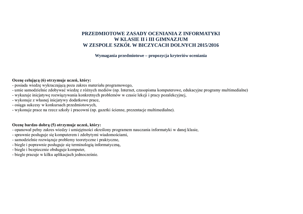 PRZEDMIOTOWE ZASADY OCENIANIA Z INFORMATYKI W KLASIE II i III GIMNAZJUM W ZESPOLE SZKÓŁ W BICZYCACH DOLNYCH 2015/2016 Wymagania przedmiotowe – propozycja kryteriów oceniania Ocenę celującą (6) otrzymuje uczeń, który: - posiada wiedzę wykraczającą poza zakres materiału programowego, - umie samodzielnie zdobywać wiedzę z różnych mediów (np. Internet, czasopisma komputerowe, edukacyjne programy multimedialne) - wykazuje inicjatywę rozwiązywania konkretnych problemów w czasie lekcji i pracy pozalekcyjnej, - wykonuje z własnej inicjatywy dodatkowe prace, - osiąga sukcesy w konkursach przedmiotowych, - wykonuje prace na rzecz szkoły i pracowni (np. gazetki ścienne, prezentacje multimedialne). Ocenę bardzo dobrą (5) otrzymuje uczeń, który: - opanował pełny zakres wiedzy i umiejętności określony programem nauczania informatyki w danej klasie, - sprawnie posługuje się komputerem i zdobytymi wiadomościami, - samodzielnie rozwiązuje problemy teoretyczne i praktyczne, - biegle i poprawnie posługuje się terminologią informatyczną, - biegle i bezpiecznie obsługuje komputer, - biegle pracuje w kilku aplikacjach jednocześnie. Ocenę dobrą (4) otrzymuje uczeń, który: - dobrze opanował umiejętności i wiedzę z zakresu materiału programowego, - posługuje się terminologią informatyczną, - poprawnie i bezpiecznie obsługuje komputer, - z pomocą nauczyciela rozwiązuje problemy wynikające w trakcie wykonywania zadań programowych, - pracuje w kilku aplikacjach jednocześnie. Ocenę dostateczną (3) otrzymuje uczeń, który: - w sposób zadowalający opanował umiejętności i wiedzę z zakresu materiału programowego, - zna terminologię informatyczną, ale ma trudności z jej zastosowaniem, - poprawnie i bezpiecznie obsługuje komputer, - nie potrafi rozwiązać problemów wynikających w trakcie wykonywania zadań programowych, nawet z pomocą nauczyciela, - poprawnie pracuje tylko w jednej aplikacji jednocześnie. Ocenę dopuszczającą (2) otrzymuje uczeń, który: - częściowo opanował umiejętności i wiedzę z zakresu materiału programowego, - częściowo zna terminologię informatyczną, ale nie potrafi jej zastosować, - bezpiecznie obsługuje komputer, - zadaną pracę wykonuje z pomocą nauczyciela, - ma problemy przy pracy w najprostszych aplikacjach, - poprawnie uruchamia komputer i zamyka system, - poprawnie uruchamia i zamyka proste aplikacje. Ocenę niedostateczną (1) otrzymuje uczeń, który: - nie opanował umiejętności i wiedzy na ocenę dopuszczającą 2 Wymagania z informatyki na poszczególne oceny Dział I – O higienie pracy, komputerze, sieciach komputerowych i Internecie Ocena niedostateczna Uczeń: - nie opanował treści programowych na ocenę dopuszczającą Ocena dopuszczająca Uczeń: - zna regulamin pracowni komputerowej; - zna i respektuje zasady bezpiecznego użytkowania komputera; - opisuje prawidłowo zorganizowane stanowisko pracy; - rozumie konieczność przerw w pracy i stosuje je; - określa podstawowe elementy budowy komputera; - zna i nazywa elementy zestawu komputerowego. Ocena dostateczna Uczeń: - sprawnie obsługuje komputer, dbając o bezpieczeństwo swoje i ochronę sprzętu; - wyjaśnia znaczenie poszczególnych elementów zestawu komputerowego; - potrafi wymienić jednostki pamięci komputerowej; - wymienia typy pamięci zewnętrznej i wewnętrznej; - opisuje i wyjaśnia zasady budowy sieci komputerowej; - określa typy sieci komputerowych; - wchodzi do sieci i korzysta z jej zasobów (oprogramowanie, dostęp do urządzeń peryferyjnych); - zna warunki umożliwiające 3 Ocena dobra Ocena bardzo dobra Ocena celująca Uczeń: - przewiduje skutki nieprawidłowego zorganizowania stanowiska pracy; - ocenia organizacje stanowisk pracy w różnych miejscach w szkole; - omawia przyczyny chorób związanych z obsługą komputera; - zna warunki podłączenia komputera do Internetu; - tworzy proste wypowiedzi na zadany temat z wykorzystaniem zgromadzonych informacji. Uczeń: - dokonuje właściwych podłączeń; - potrafi z wyszukiwanych informacji wybierać te najwartościowsze; - objaśnia zasady korzystania z programów i zbiorów dokumentów szkolnej pracowni komputerowej; - ocenia wpływ urządzeń opartych na technice komputerowej na jakość życia człowieka. Uczeń: - opisuje zalety i zagrożenia, jakie niesie ze sobą komputeryzacja życia; - określa urządzenia wewnętrzne komputera oraz opisuje ich funkcje i podaje parametry techniczne. podłączenie do sieci internetowej; - rozumie znaczenie globalnego dostępu do informacji; - wyszczególnia elementy adresu internetowego Dział II – O zarządzaniu zasobami komputera i pracy w systemie operacyjnym Windows XP Ocena niedostateczna Uczeń: - nie opanował treści programowych na ocenę dopuszczającą Ocena dopuszczająca Uczeń: - wie, co to jest system operacyjny; - potrafi nazwać i wykorzystać elementy pulpitu i okna; - potrafi uruchomić program; - zapisuje wyniki prac na dysku; - zna sposoby zaznaczania tekstu lub jego fragmentów Ocena dostateczna Uczeń: - potrafi stworzyć skrót do programu, folderu czy pliku na pulpicie i w menu Start; - modyfikuje już zapisane dane; - umie formatować dyski na różne sposoby; - zna zasady formatowania; - wie, w jakim celu sprawdza się stan dysku i potrafi to zrobić; - zna skutki działania wirusów komputerowych; Ocena dobra Ocena bardzo dobra Uczeń: Uczeń: - potrafi, - zna pojęcie wykorzystując archiwizacji i potrafi właściwe narzędzie, to zrobić; odnaleźć wybrany - odnajduje w sieci plik lub folder; internetowej - projektuje i darmowe programy wykonuje struktury antywirusowe. folderów potrzebne do gromadzenia danych; - uruchamia wybrany program antywirusowy; - wyszczególnia sposoby zabezpieczenia sieci komputerowej; - wie, w jakim celu oczyszcza się dysk i 4 Ocena celująca Uczeń: - rozumie znaczenie kopii zapasowej i potrafi ją stworzyć; - instaluje na swoim komputerze wybran