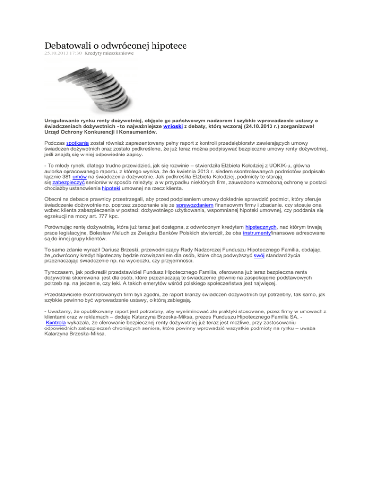Debatowali o odwróconej hipotece 25.10.2013 17:30 Kredyty mieszkaniowe Uregulowanie rynku renty dożywotniej, objęcie go państwowym nadzorem i szybkie wprowadzenie ustawy o świadczeniach dożywotnich - to najważniejsze wnioski z debaty, którą wczoraj (24.10.2013 r.) zorganizował Urząd Ochrony Konkurencji i Konsumentów. Podczas spotkania został również zaprezentowany pełny raport z kontroli przedsiębiorstw zawierających umowy świadczeń dożywotnich oraz zostało podkreślone, że już teraz można podpisywać bezpieczne umowy renty dożywotniej, jeśli znajdą się w niej odpowiednie zapisy. - To młody rynek, dlatego trudno przewidzieć, jak się rozwinie – stwierdziła Elżbieta Kołodziej z UOKIK-u, główna autorka opracowanego raportu, z którego wynika, że do kwietnia 2013 r. siedem skontrolowanych podmiotów podpisało łącznie 381 umów na świadczenia dożywotnie. Jak podkreśliła Elżbieta Kołodziej, podmioty te starają się zabezpieczyć seniorów w sposób należyty, a w przypadku niektórych firm, zauważono wzmożoną ochronę w postaci chociażby ustanowienia hipoteki umownej na rzecz klienta. Obecni na debacie prawnicy przestrzegali, aby przed podpisaniem umowy dokładnie sprawdzić podmiot, który oferuje świadczenie dożywotnie np. poprzez zapoznanie się ze sprawozdaniem finansowym firmy i zbadanie, czy stosuje ona wobec klienta zabezpieczenia w postaci: dożywotniego użytkowania, wspomnianej hipoteki umownej, czy poddania się egzekucji na mocy art. 777 kpc. Porównując rentę dożywotnią, która już teraz jest dostępna, z odwróconym kredytem hipotecznych, nad którym trwają prace legislacyjne, Bolesław Meluch ze Związku Banków Polskich stwierdził, że oba instrumentyfinansowe adresowane są do innej grupy klientów. To samo zdanie wyraził Dariusz Brzeski, przewodniczący Rady Nadzorczej Funduszu Hipotecznego Familia, dodając, że „odwrócony kredyt hipoteczny będzie rozwiązaniem dla osób, które chcą podwyższyć swój standard życia przeznaczając świadczenie np. na wycieczki, czy przyjemności. Tymczasem, jak podkreślił przedstawiciel Fundusz Hipotecznego Familia, oferowana już teraz bezpieczna renta dożywotnia skierowana jest dla osób, które przeznaczają te świadczenie głównie na zaspokojenie podstawowych potrzeb np. na jedzenie, czy leki. A takich emerytów wśród polskiego społeczeństwa jest najwięcej. Przedstawiciele skontrolowanych firm byli zgodni, że raport branży świadczeń dożywotnich był potrzebny, tak samo, jak szybkie powinno być wprowadzenie ustawy, o którą zabiegają. - Uważamy, że opublikowany raport jest potrzebny, aby wyeliminować złe praktyki stosowane, przez firmy w umowach z klientami oraz w reklamach – dodaje Katarzyna Brzeska-Miksa, prezes Funduszu Hipotecznego Familia SA. Kontrola wykazała, że oferowanie bezpiecznej renty dożywotniej już teraz jest możliwe, przy zastosowaniu odpowiednich zabezpieczeń chroniących seniora, które powinny wprowadzić wszystkie podmioty na rynku – uważa Katarzyna Brzeska-Miksa.