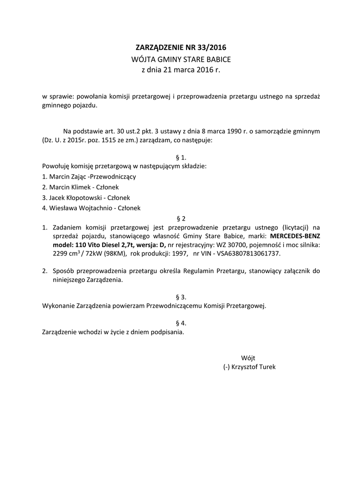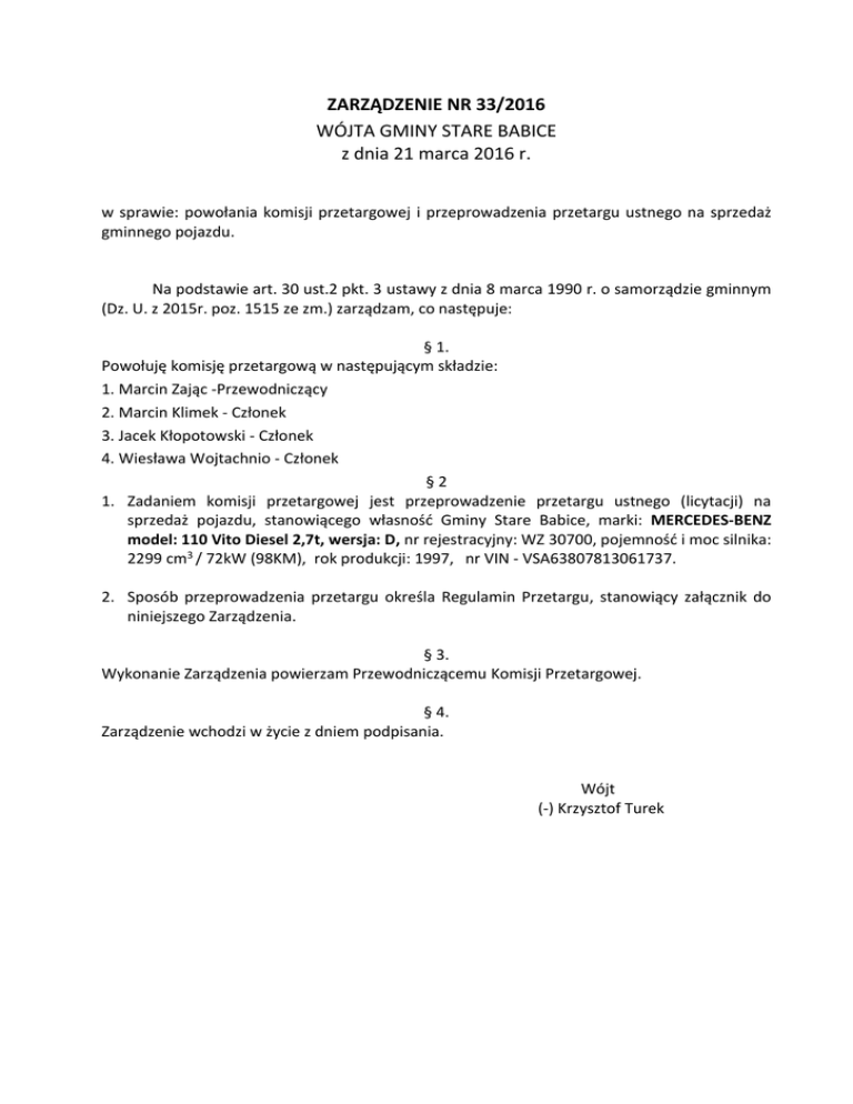 ZARZĄDZENIE NR 33/2016 WÓJTA GMINY STARE BABICE z dnia 21 marca 2016 r. w sprawie: powołania komisji przetargowej i przeprowadzenia przetargu ustnego na sprzedaż gminnego pojazdu. Na podstawie art. 30 ust.2 pkt. 3 ustawy z dnia 8 marca 1990 r. o samorządzie gminnym (Dz. U. z 2015r. poz. 1515 ze zm.) zarządzam, co następuje: § 1. Powołuję komisję przetargową w następującym składzie: 1. Marcin Zając -Przewodniczący 2. Marcin Klimek - Członek 3. Jacek Kłopotowski - Członek 4. Wiesława Wojtachnio - Członek §2 1. Zadaniem komisji przetargowej jest przeprowadzenie przetargu ustnego (licytacji) na sprzedaż pojazdu, stanowiącego własność Gminy Stare Babice, marki: MERCEDES-BENZ model: 110 Vito Diesel 2,7t, wersja: D, nr rejestracyjny: WZ 30700, pojemność i moc silnika: 2299 cm3 / 72kW (98KM), rok produkcji: 1997, nr VIN - VSA63807813061737. 2. Sposób przeprowadzenia przetargu określa Regulamin Przetargu, stanowiący załącznik do niniejszego Zarządzenia. § 3. Wykonanie Zarządzenia powierzam Przewodniczącemu Komisji Przetargowej. § 4. Zarządzenie wchodzi w życie z dniem podpisania. Wójt (-) Krzysztof Turek Załącznik do Zarządzenia Nr33/2016 Wójta Gminy Stare Babice z dnia 21 marca 2016 r. Regulamin przetargu ustnego (licytacji) na sprzedaż pojazdu marki MERCEDES-BENZ, model: 110 Vito Diesel 2,7t §1 Regulamin przetargu zwany dalej regulaminem określa zasady uczestnictwa i przebiegu przetargu na sprzedaż pojazdu: samochodu ciężarowego do 3,5 t. marki: MERCEDES-BENZ model: 110 Vito Diesel 2,7t, wersja: D, nr rejestracyjny: WZ 30700, pojemność i moc silnika: 2299 cm3 / 72kW (98KM), rok produkcji: 1997, nr VIN - VSA63807813061737. Pojazd stanowi mienie Gminy Stare Babice §2 1. Przetarg przeprowadzi komisja powołana Zarządzeniem Nr 33/2016 Wójta Gminy Stare Babice z dnia z dnia 21 marca 2016 r. 2. Do obowiązków komisji należy m.in.: przygotowanie ogłoszenia, które zawierać będzie w szczególności opis pojazdu i jego dane techniczne, cenę wywoławczą i cenę postąpienia, termin przetargu, kwotę wadium, termin jego wpłaty i numer konta na, które należy je wpłacić, osoby do kontaktu, kwestie dotyczące możliwości oglądania pojazdu oraz inne informacje niezbędne do przekazania uczestnikom w celu przystąpienia do przetargu. Zadaniem komisji jest również zamieszczenie zatwierdzonego przez Wójta Gminy ogłoszenia o przetargu na stronie internetowej Urzędu Gminy Stare Babice, w Biuletynie Informacji Publicznej Gminy Stare Babice, na tablicy ogłoszeń Urzędu Gminy Stare Babice oraz udzielanie informacji o przedmiocie przetargu, przeprowadzenie przetargu, podpisanie oświadczeń w sprawie bezstronności członków komisji i sporządzenie protokołu końcowego z podaniem wyników przetargu. 3. Komisja pełni swoje obowiązki od dnia powołania do dnia zatwierdzenia przez Wójta protokołu końcowego z przetargu. 4. Komisja prowadząca przetarg sporządzi z jego przebiegu protokół podlegający zatwierdzeniu przez Wójta Gminy, który zawierać będzie: 1) oznaczenie miejsca i czasu przetargu; 2) imiona i nazwiska osób prowadzących przetarg (komisji przetargowej); 3) wysokość cen wywoławczych; 4) najwyższą cenę zaoferowaną za środek trwały; 5) imię, nazwisko i miejsce zamieszkania lub nazwa i siedziba nabywcy; 6) wysokość ceny nabycia i oznaczenie sumy, jaką nabywca uiścił na poczet ceny; 7) wnioski i oświadczenia osób obecnych przy przetargu; 8) wzmiankę o odczytaniu protokołu; 9) podpisy osób prowadzących przetarg i nabywcy lub wzmiankę o przyczynie braku podpisu. 5. W przetargu ustnym (licytacji) nie mogą uczestniczyć osoby wchodzące w skład komisji przetargowej oraz ich małżonkowie, dzieci, rodzice i rodzeństwo. 1 6. Członkowie komisji składają oświadczenie o bezstronności, zgodnie z wzorem stanowiącym załącznik nr 1 do niniejszego Regulaminu. §3 1. Przetarg na sprzedaż pojazdu stanowiącego przedmiot przetargu ma formę przetargu ustnego (licytacji). 2. W przetargu mogą brać udział osoby fizyczne i prawne. 3. Osoba fizyczna przed przystąpieniem do przetargu zobowiązana jest okazać przed komisją przetargową dowód osobisty oraz dowód wpłaty wadium, a osoba reprezentująca (upoważnienie do reprezentowania musi wynikać z Rejestru Sądowego lub pełnomocnictwa) osobę prawną aktualny wypis lub wydruk z rejestru sądowego (nie starszy niż 6 miesięcy przed terminem licytacji). W przypadku kopii wypisu kopia winna być potwierdzona za zgodność z oryginałem. 4. Uczestnik przetargu może działać przez pełnomocnika. W takim przypadku powinien przedstawić oryginał pełnomocnictwa. 5. Warunkiem uczestnictwa w przetargu jest wpłacenie wadium w wysokości 5% ceny wywoławczej równej 275 zł (słownie dwieście siedemdziesiąt pięć złotych) na rachunek bankowy Gminy Stare Babice wskazany w ogłoszeniu w terminie określonym w ogłoszeniu o przetargu. 6. Uczestnikom, którzy przetargu nie wygrali, wadium zwraca się niezwłocznie po zakończeniu przetargu. 7. Wadium nie podlega zwrotowi w przypadku, gdy uczestnik, który wygrał przetarg i uchyli się od zawarcia umowy. 8. Przewodniczący komisji prowadzi licytację. 9. Przewodniczący komisji otwiera przetarg poprzez podanie ceny początkowej pojazdu, która wynosi 5500 zł brutto (słownie: pięć tysięcy pięćset złotych) w tym podatek VAT (23%). Cena początkowa została określona na podstawie wyceny wartości rynkowej pojazdu sporządzonej przez uprawionego rzeczoznawcę. 10. Przetarg prowadzony będzie w formie licytacji odbywającej się "w górę" poprzez postąpienie. Przetarg jest ważny, jeśli nastąpi co najmniej jedno postąpienie. Postąpienie w licytacji wynosi 50 zł. 11. Oferty ustne należy składać po podaniu przez licytatora do wiadomości uczestniczących przedmiotu przetargu oraz jego ceny wywoławczej. 12. Zaoferowana cena przestaje obowiązywać uczestnika, gdy inny oferent podczas licytacji p