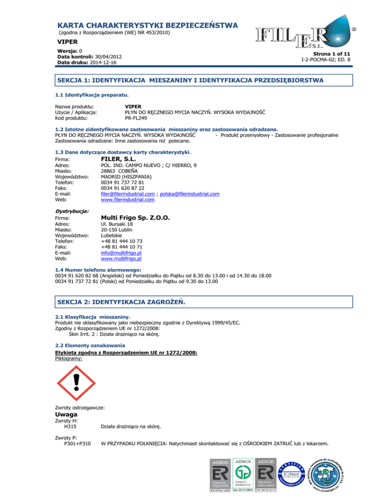 KARTA CHARAKTERYSTYKI BEZPIECZEŃSTWA (zgodna z Rozporządzeniem (WE) NR 453/2010) VIPER Wersja: 0 Data kontroli: 30/04/2012 Data druku: 2014-12-16 Strona 1 of 11 I-2-POCMA-02; ED. 8 SEKCJA 1: IDENTYFIKACJA MIESZANINY I IDENTYFIKACJA PRZEDSIĘBIORSTWA 1.1 Identyfikacja preparatu. Nazwa produktu: Użycie / Aplikacja: Kod produktu: VIPER PŁYN DO RĘCZNEGO MYCIA NACZYŃ. WYSOKA WYDAJNOŚĆ PR-FL249 1.2 Istotne zidentyfikowane zastosowania mieszaniny oraz zastosowania odradzane. PŁYN DO RĘCZNEGO MYCIA NACZYŃ. WYSOKA WYDAJNOŚĆ - Produkt przemysłowy - Zastosowanie profesjonalne Zastosowania odradzane: Inne zastosowania niż polecane. 1.3 Dane dotyczące dostawcy karty charakterystyki. Firma: FILER, S.L. Adres: POL. IND. CAMPO NUEVO ; C/ HIERRO, 9 Miasto: 28863 COBEÑA Województwo: MADRID (HISZPANIA) Telefon: 0034 91 737 72 81 Faks: 0034 91 620 87 22 E-mail: [email protected] ; [email protected] Web: www.filerindustrial.com Dystrybucja: Firma: Adres: Miasto: Województwo: Telefon: Faks: E-mail: Web: Multi Frigo Sp. Z.O.O. Ul. Bursaki 18 20-150 Lublin Lubelskie +48 81 444 10 73 +48 81 444 10 71 [email protected] www.multifrigo.pl 1.4 Numer telefonu alarmowego: 0034 91 620 82 68 (Angielski) od Poniedziałku do Piątku od 8.30 do 13.00 i od 14.30 do 18.00 0034 91 737 72 81 (Polski) od Poniedziałku do Piątku od 9.30 do 13.00 SEKCJA 2: IDENTYFIKACJA ZAGROŻEŃ. 2.1 Klasyfikacja mieszaniny. Produkt nie sklasyfikowany jako niebezpieczny zgodnie z Dyrektywą 1999/45/EC. Zgodny z Rozporządzeniem UE nr 1272/2008: Skin Irrit. 2 : Działa drażniąco na skórę. 2.2 Elementy oznakowania Etykieta zgodna z Rozporządzeniem UE nr 1272/2008: Piktogramy: . . Zwroty ostrzegawcze: Uwaga Zwroty H: H315 Działa drażniąco na skórę. Zwroty P: P301+P310 W PRZYPADKU POŁKNIĘCIA: Natychmiast skontaktować się z OŚRODKIEM ZATRUĆ lub z lekarzem. KARTA CHARAKTERYSTYKI BEZPIECZEŃSTWA (zgodna z Rozporządzeniem (WE) NR 453/2010) VIPER Wersja: 0 Data kontroli: 30/04/2012 Data druku: 2014-12-16 Strona 2 of 11 I-2-POCMA-02; ED. 8 P305+P351+P338 W PRZYPADKU DOSTANIA SIĘ DO OCZU: Ostrożnie płukać wodą przez kilka minut. Wyjąć soczewki kontaktowe, jeżeli są i można je łatwo usunąć. Nadal płukać. Chronić przed dziećmi. Nie spożywać. Produkt przeznaczony wyłącznie do użytku zawodowego. Przechowywać wyłącznie w oryginalnym pojemniku. Zawiera: Benzenesulfonic acid, mono-C10-14-alkyl derivs Zawartośc zgodna z Rozporządzeniem (WE) nr 648/2004 w sprawie detergentów: anionowe środki powierzchniowo czynne mydło 5% - 15% 10% - 15% kompozycje zapachowe 2.3 Inne zagrożenia. Nie połykać. Produkt przemysłowy – do użytku handlowego Karta charakterystyki bezpieczeństwa dostępna dla użytkowników na żądanie. Podczas normalnego użytkowania i w jego pierwotnej formie, produkt nie wywoluje efektów negatywnych na zdrowie oraz środowisko. SEKCJA 3: SKŁAD/INFORMACJA O SKŁADNIKACH. 3.1 Substancje. Nie Dotyczy. 3.2 Mieszaniny. Substancje stanowiące zagrożenie dla zdrowia lub środowiska zgodnie z Dyrektywą dotyczącą Substancji Niebezpiecznych 67/548/EEC lub Rozporządzeniem (WE) nr 1272/2008, które mają wyznaczone poziomy progowe narażenia w miejscu pracy,klasyfikowane są jako PBT / vPvB lub zawarte są w liście kandyatów: Stężenie (*)KlasyfikacjaRozporządzenie 1272/2008 (*)KlasyfikacjaDyrektywa 67/548/EWG 2,2`-iminodietanol,dietanoloamina 0-5% Acute Tox. 4 *, H302 - Eye Dam. 1, H318 Skin Irrit. 2, H315 - STOT RE 2 *, H373 Xn Xi R22 R48/22 R38 R41 (E)-3,7-dimetylookta-2,6-dienal i (Z)-3,7dimetylookta-2,6-dienal,cytral a i cytral ß,geranial i neral 0-1% Skin Irrit. 2, H315 - Skin Sens. 1, H317 Xi R38 R43 0.5 - 2.5 % Skin Corr. 1A, H314 C R35 2,2',2''-nitrilotriethanol 0 - 20 % Eye Irrit. 2, H319 Xi R36 C10-C16-alquilétersulfato sódico etoxilado(2) 0-5% Eye Dam. 1, H318 - Skin Irrit. 2, H315 Xi R38 R41 Identyfikatory Nr indeksowy: 603071-00-1 Nr CAS: 111-42-2 Nr WE: 203-868-0 Nr Rejestracyjny: 012119488930-28-XXXX Nr indeksowy: 605019-00-3 Nr CAS: 5392-40-5 Nr WE: 226-394-6 Nr Rejestracyjny: 012119462829-23-XXXX Nr indeksowy: 011002-00-6 Nr CAS: 1310-73-2 Nr WE: 215-185-5 Nr Rejestracyjny: 012119457892-27-XXXX Nr CAS: 102-71-6 Nr WE: 203-049-8 Nr Rejestracyjny: 012119486482-31-XXXX Nr CAS: 68585-34-2 Nr WE: 500-223-8 Nazwa wodorotlenek sodu KARTA CHARAKTERYSTYKI BEZPIECZEŃSTWA (zgodna z Rozporządzeniem (WE) NR 453/2010) VIPER Wersja: 0 Data kontroli: 30/04/2012 Data druku: 2014-12-16 Strona 3 of 11 I-2-POCMA-02; ED. 8 Nr CAS: 80-56-8 Nr WE: 201-291-9 alpha-Pinene Nr Rejestracyjny: 012119519223-49-XXXX 0-1% Nr CAS: 85117-49-3 Nr WE: 285-599-9 Benzenesulfonic acid, mono-C10-14-alkyl derivs Nr Rejestracyjny: 012119490234-40-XXXX 5 - 10 % Asp. Tox. 1, H304 - Flam. Liq. 3, H226 Skin Irrit. 2, H315 - Skin Sens. 1, H317 Acute Tox. 4, H302 - Acute Tox. 4 *, H302 - Skin Corr. 1A, H314 - Skin Corr. 1B, H314 Xi Xn R10 R38 R43 R65 C Xn R34 R22 (*) Pełny tekst zwrotów R i S zostal wyszczególniony w pkt 16 niniejszej Karty charakterystyki bezpieczenstwa. * Patrz rozporządzenie (WE) nr 1272/2008, załącznik VI, rozdział 1.2. SEKCJA 4: ŚRODKI PIERWSZEJ POMOCY. Aktualne informacje na temat składu produktu zostały wysłane do Ośrodka Informacji Toksykologicznej (Instituto Nacional de Toxicológica y Ciencias Forenses) w Hiszpanii. W przypadku wypadku konsultacje kierować do Ośrodka Medycznego Informacji Toksykologicznej w Hiszpanii, Tel. (24 h.) +34 91.562.04.20. 4.1 Opis środków pierwszej pomocy. Dzięki kompozycji oraz typologii substancji obecnych w produkcie, nie wymaga się szczególnych ostrzeżeń. Inhalacja. Umieścić poszkodowanego na świeżym powietrzu, utrzymać w cieple i w stanie spoczynku, jeśli oddycha nieregularnie lub ma bezdech, zastosować sztuczne oddychanie. Nie podawać nic doustnie. Jeśli poszkodowany jest nieprzytomny, ułożyć w odpowiedniej pozycji i wezwać pomoc lekarską. Kontakt z oczami. W przypadku noszenia szkieł kontaktowych, wyjąć je.