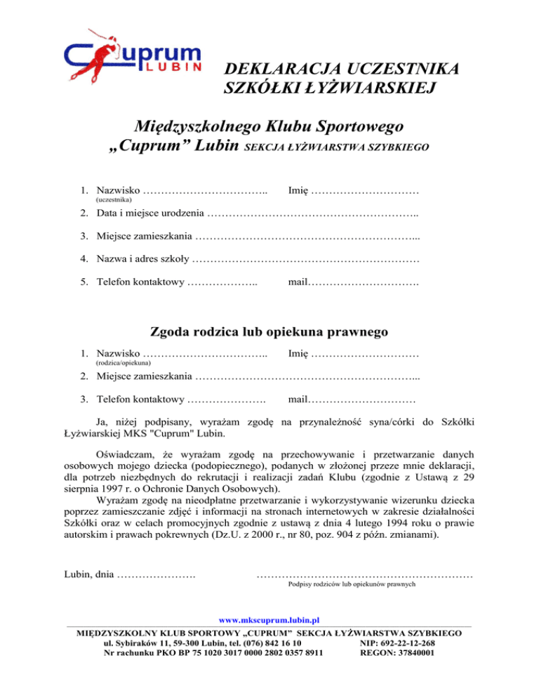 DEKLARACJA UCZESTNIKA SZKÓŁKI ŁYŻWIARSKIEJ Międzyszkolnego Klubu Sportowego „Cuprum” Lubin SEKCJA ŁYŻWIARSTWA SZYBKIEGO 1. Nazwisko …………………………….. Imię ………………………… (uczestnika) 2. Data i miejsce urodzenia ………………………………………………….. 3. Miejsce zamieszkania ……………………………………………………... 4. Nazwa i adres szkoły ……………………………………………………… 5. Telefon kontaktowy ……………….. mail…………………………. Zgoda rodzica lub opiekuna prawnego 1. Nazwisko …………………………….. Imię ………………………… (rodzica/opiekuna) 2. Miejsce zamieszkania ……………………………………………………... 3. Telefon kontaktowy …………………. mail………………………… Ja, niżej podpisany, wyrażam zgodę na przynależność syna/córki do Szkółki Łyżwiarskiej MKS "Cuprum" Lubin. Oświadczam, że wyrażam zgodę na przechowywanie i przetwarzanie danych osobowych mojego dziecka (podopiecznego), podanych w złożonej przeze mnie deklaracji, dla potrzeb niezbędnych do rekrutacji i realizacji zadań Klubu (zgodnie z Ustawą z 29 sierpnia 1997 r. o Ochronie Danych Osobowych). Wyrażam zgodę na nieodpłatne przetwarzanie i wykorzystywanie wizerunku dziecka poprzez zamieszczanie zdjęć i informacji na stronach internetowych w zakresie działalności Szkółki oraz w celach promocyjnych zgodnie z ustawą z dnia 4 lutego 1994 roku o prawie autorskim i prawach pokrewnych (Dz.U. z 2000 r., nr 80, poz. 904 z późn. zmianami). Lubin, dnia …………………. …………………………………………………… Podpisy rodziców lub opiekunów prawnych www.mkscuprum.lubin.pl ------------------------------------------------------------------------------------------------------------------------------------------------------------------------------------------------------------------------------------------------------------------------------------------------------------------------------------------------ MIĘDZYSZKOLNY KLUB SPORTOWY „CUPRUM” SEKCJA ŁYŻWIARSTWA SZYBKIEGO ul. Sybiraków 11, 59-300 Lubin, tel. (076) 842 16 10 NIP: 692-22-12-268 Nr rachunku PKO BP 75 1020 3017 0000 2802 0357 8911 REGON: 37840001 Regulamin Szkółki Łyżwiarskiej 1. W zajęciach Szkółki Łyżwiarskiej mogą uczestniczyć dzieci od 6 roku życia pod opieką rodzica/pełnoletniego opiekuna. Rodzic/opiekun jest zobowiązany do przebywanie na terenie obiektu w czasie trwania zajęć. 2. Każdy uczestnik Szkółki zobowiązany jest do posiadania kasku ochronnego, rękawiczek oraz stroju sportowego. Kask musi być dopasowany tak, aby pełnił rolę ochronną. 3. Uczestnicy Szkółki ćwiczą w grupie i dniu wskazanym przez instruktora. Punktualnie wchodzą i schodzą z tafli. 4. Uczestnicy Szkółki są zobowiązani do wypełnienia Deklaracji Uczestnika Szkółki Łyżwiarskiej, przestrzegania Regulaminu Szkółki i Regulaminu Lodowiska oraz stosowania się do poleceń instruktora. Prowadzący zastrzegają sobie prawo do usunięcia z zajęć uczestników niestosujących się do regulaminu lub poleceń. 5. W zajęciach może uczestniczyć maksymalnie 40 osób na tafli lodowiska oraz 10-15 osób na torze. Prowadzący zastrzegają sobie prawo do zmiany liczby uczestników zajęć. 6. Instruktorzy prowadzą Szkółkę zgodnie ze swoją najlepszą wiedzą i doświadczeniem. Wszelkie upadki i wypadki uczestników są ryzykiem, które wiąże się z nauką jazdy na łyżwach. Prowadzący nie biorą odpowiedzialności za ewentualne skutki tych wypadków. Uczestnicy Szkółki ubezpieczają się we własnym zakresie. 7. Za bezpieczeństwo w drodze na zajęcia, powrót po zajęciach oraz przygotowanie do wejścia uczestnika na lodowisko odpowiadają rodzice. 8. Uczestnicy Szkółki Łyżwiarskiej mogą jednocześnie dobrowolnie zostać członkami klubu MKS „Cuprum” Lubin. Z członkostwem klubu wiąże się przywilej pierwszeństwa wstępu na zajęcia Szkółki oraz upominek na zakończenie sezonu łyżwiarskiego. Członkowie klubu opłacają miesięczną składkę w wysokości 10 złotych. Kaski nie są ozdobą! Służą do zapewnienia bezpieczeństwa Dzieciom! ……………………………… …………………………………….. Data i podpis uczestnika Data i podpis rodzica/opiekuna www.mkscuprum.lubin.pl ------------------------------------------------------------------------------------------------------------------------------------------------------------------------------------------------------------------------------------------------------------------------------------------------------------------------------------------------ MIĘDZYSZKOLNY KLUB SPORTOWY „CUPRUM” SEKCJA ŁYŻWIARSTWA SZYBKIEGO ul. Sybiraków 11, 59-300 Lubin, tel. (076) 842 16 10 NIP: 692-22-12-268 Nr rachunku PKO BP 75 1020 3017 0000 2802 0357 8911 REGON: 37840001