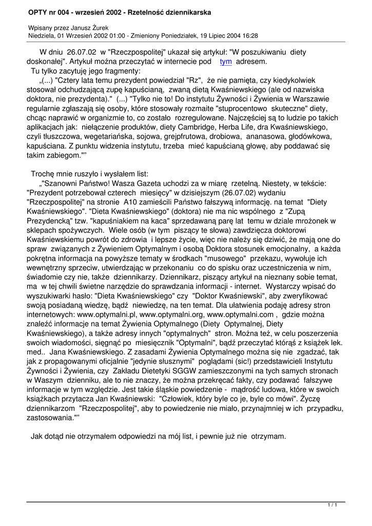 OPTY nr 004 - wrzesień 2002 - Rzetelność dziennikarska Wpisany przez Janusz Żurek Niedziela, 01 Wrzesień 2002 01:00 - Zmieniony Poniedziałek, 19 Lipiec 2004 16:28 W dniu 26.07.02 w "Rzeczpospolitej" ukazał się artykuł: "W poszukiwaniu diety doskonałej". Artykuł można przeczytać w internecie pod tym adresem. Tu tylko zacytuję jego fragmenty: „(...) "Cztery lata temu prezydent powiedział "Rz", że nie pamięta, czy kiedykolwiek stosował odchudzającą zupę kapuścianą, zwaną dietą Kwaśniewskiego (ale od nazwiska doktora, nie prezydenta)." (...) "Tylko nie to! Do instytutu Żywności i Żywienia w Warszawie regularnie zgłaszają się osoby, które stosowały rozmaite "stuprocentowo skuteczne" diety, chcąc naprawić w organizmie to, co zostało rozregulowane. Najczęściej są to ludzie po takich aplikacjach jak: niełączenie produktów, diety Cambridge, Herba Life, dra Kwaśniewskiego, czyli tłuszczowa, wegetariańska, sojowa, grejpfrutowa, drobiowa, ananasowa, głodówkowa, kapuściana. Z punktu widzenia instytutu, trzeba mieć kapuścianą głowę, aby poddawać się takim zabiegom."” Trochę mnie ruszyło i wysłałem list: „"Szanowni Państwo! Wasza Gazeta uchodzi za w miarę rzetelną. Niestety, w tekście: "Prezydent potrzebował czterech miesięcy" w dzisiejszym (26.07.02) wydaniu "Rzeczpospolitej" na stronie A10 zamieścili Państwo fałszywą informację. na temat "Diety Kwaśniewskiego". "Dieta Kwaśniewskiego" (doktora) nie ma nic wspólnego z "Zupą Prezydencką" tzw. "kapuśniakiem na kaca" sprzedawaną parę lat temu w dziale mrożonek w sklepach spożywczych. Wiele osób (w tym piszący te słowa) zawdzięcza doktorowi Kwaśniewskiemu powrót do zdrowia i lepsze życie, więc nie należy się dziwić, że mają one do spraw związanych z Żywieniem Optymalnym i osobą Doktora stosunek emocjonalny, a każda pokrętna informacja na powyższe tematy w środkach "musowego" przekazu, wywołuje ich wewnętrzny sprzeciw, utwierdzając w przekonaniu co do spisku oraz uczestniczenia w nim, świadomie czy nie, także dziennikarzy. Dziennikarz, piszący artykuł na nieznany sobie temat, ma w tej chwili świetne narzędzie do sprawdzania informacji - internet. Wystarczy wpisać do wyszukiwarki hasło: "Dieta Kwaśniewskiego" czy "Doktor Kwaśniewski", aby zweryfikować swoją posiadaną wiedzę, bądź niewiedzę, na ten temat. Dla ułatwienia podaję adresy stron internetowych: www.optymalni.pl, www.optymalni.org, www.optymalni.com , gdzie można znaleźć informacje na temat Żywienia Optymalnego (Diety Optymalnej, Diety Kwaśniewskiego), a także adresy innych "optymalnych" stron. Można też, w celu poszerzenia swoich wiadomości, sięgnąć po miesięcznik "Optymalni", bądź przeczytać którąś z książek lek. med.. Jana Kwaśniewskiego. Z zasadami Żywienia Optymalnego można się nie zgadzać, tak jak z propagowanymi oficjalnie "jedynie słusznymi" poglądami (sic!) przedstawicieli Instytutu Żywności i Żywienia, czy Zakładu Dietetyki SGGW zamieszczonymi na tych samych stronach w Waszym dzienniku, ale to nie znaczy, że można przekręcać fakty, czy podawać fałszywe informacje w tym względzie. Jest takie śląskie powiedzenie - mądrość ludowa, które w swoich książkach przytacza Jan Kwaśniewski: "Człowiek, który byle co je, byle co mówi". Życzę dziennikarzom "Rzeczpospolitej", aby to powiedzenie nie miało, przynajmniej w ich przypadku, zastosowania."” Jak dotąd nie otrzymałem odpowiedzi na mój list, i pewnie już nie otrzymam. 1/1