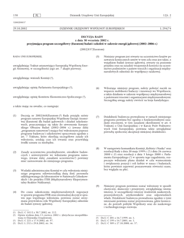 138 PL Dziennik Urzędowy Unii Europejskiej 12/t. 2 32002D0837 29.10.2002 DZIENNIK URZĘDOWY WSPÓLNOT EUROPEJSKICH L 294/74 DECYZJA RADY z dnia 30 września 2002 r. przyjmująca program szczegółowy (Euratom) badań i szkoleń w zakresie energii jądrowej (2002–2006 r.) (2002/837/Euratom) RADA UNII EUROPEJSKIEJ, (5) Niniejszy program jest otwarty na uczestnictwo krajów po zawarciu koniecznych umów w tym celu oraz jest także, z wyjątkiem badań syntezy jądrowej, otwarty na poziomie projektu oraz na zasadzie wzajemnych korzyści na uczestnictwo podmiotów z państw trzecich i organizacji międzynarodowych odnośnie do współpracy naukowej. (6) Wdrażając niniejszy program, należy położyć nacisk na wsparcie mobilności badaczy i innowacji we Wspólnocie, a także działania w zakresie współpracy międzynarodowej z państwami trzecimi i organizacjami międzynarodowymi. Szczególną uwagę należy zwrócić na kraje kandydujące. (7) Działalność badawcza prowadzona w ramach niniejszego programu powinna być zgodna z fundamentalnymi zasadami etycznymi, w tym zasadami określonymi w art. 6 Traktatu o Unii Europejskiej i w Karcie Praw Podstawowych Unii Europejskiej, powinna także uwzględniać potrzebę społecznej akceptacji niniejszej działalności. (8) W następstwie komunikatu Komisji „Kobiety i Nauka” oraz rezolucji Rady z dnia 20 maja 1999 r. (5) i dnia 26 czerwca 2000 r. (6) oraz rezolucji z dnia 3 lutego 2000 r. Parlamentu Europejskiego (7) w sprawie tego zagadnienia, rozpoczęto wdrażanie planu działań w celu wzmocnienia i zwiększenia pozycji i roli kobiet w nauce i badaniach, który powinien zapewnić poszanowanie równości szans, bez względu na płeć. (9) Niniejszy program powinien zostać wdrożony w sposób elastyczny, skuteczny i przejrzysty, uwzględniając istotne interesy, w szczególności interesy środowisk naukowych, przemysłowych, użytkowników oraz odpowiednich władz. Działalność badawcza prowadzona zgodnie z tymi interesami powinna zostać przystosowana, gdzie konieczne, do potrzeb polityki Wspólnoty oraz do naukowego i technologicznego rozwoju. uwzględniając Traktat ustanawiający Europejską Wspólnotę Energii Atomowej, w szczególności jego art. 7 akapit pierwszy, uwzględniając wniosek Komisji (1), uwzględniając opinię Parlamentu Europejskiego (2), uwzględniając opinię Komitetu Ekonomiczno-Społecznego (3), a także mając na uwadze, co następuje: (1) Decyzją nr 2002/668/Euratom (4) Rada przyjęła szósty program ramowy Europejskiej Wspólnoty Energii Atomowej (Euratom) dla badań jądrowych i działań szkoleniowych, przyczyniający się także do utworzenia Europejskiego Obszaru Badań (2002–2006 r.) (zwany dalej „programem ramowym”) mający być wdrożonym poprzez programy badawcze i szkoleniowe opracowane zgodnie z art. 7 Traktatu, które określają szczegółowe zasady ich wdrożenia, ustalają czas ich trwania oraz przewidują środki uznane za niezbędne. (2) Zasady uczestnictwa przedsiębiorstw, ośrodków badawczych i uniwersytetów we wdrażaniu programu ramowego, (zwane dalej „zasadami uczestnictwa”) powinny mieć zastosowanie do niniejszego programu. (3) Wydatki administracyjne Komisji w celu wdrożenia niniejszego programu odzwierciedlają dużą ilość personelu oddelegowanego do laboratoriów w Państwach Członkowskich i do projektu ITER (Międzynarodowy Eksperymentalny Reaktor Nuklearny). (4) Do czasu zakończenia międzynarodowych negocjacji w sprawie programu ITER oraz ewentualnej decyzji w sprawie jego wspólnego wdrożenia, powinna zostać utrzymana przywódcza rola Wspólnoty Europejskiej odnośnie do badań syntezy jądrowej. (1) Dz.U. C 181 E z 30.7.2002, str. 112. (2) Opinia wydana dnia 13 czerwca 2002 r. (dotychczas nieopublikowana w Dzienniku Urzędowym). (3) Dz.U. C 221 z 17.9.2002, str. 97. (4) Dz.U. L 232 z 29.8.2002, str. 34. (5) Dz.U. C 201 z 16.7.1999, str. 1. (6) Dz.U. C 199 z 14.7.2001, str. 1. (7) Dz.U. C 309 z 27.10.2000, str. 57. 12/t. 2 (10) Dziennik Urzędowy Unii Europejskiej PL Uczestnictwo w działaniach niniejszego programu powinno być propagowane poprzez publikację niezbędnych informacji dotyczących treści, warunków i procedur udostępnianych terminowo oraz w kompleksowy sposób potencjalnym uczestnikom, w tym ze stowarzyszonych krajów kandydujących oraz innych państw stowarzyszonych. 139 Artykuł 4 1. Szczegółowe zasady dotyczące finansowego uczestnictwa Wspólnoty w szczegółowym programie są określone w art. 2 ust. 2 programu ramowego. 2. Program szczegółowy jest wdrażany za pomocą instrumentów określonych w załączniku III. (11) Komisja, we właściwym czasie, poleci przeprowadzenie niezależnej oceny dotyczącej działalności prowadzonej w zakresie objętym niniejszym programem. Taka ocena zostanie przeprowadzona w duchu otwartości odnoszącej się do wszystkich uczestników. 3. Zasady dotyczące uczestnictwa mają zastosowanie do programu szczegółowego. Artykuł 5 (12) Przeprowadzono konsultacje z Komitetem NaukowoTechnicznym, 1. Komisja opracowuje program pracy dla wdrożenia programu szczegółowego, przedstawiając dokładniej cele oraz naukowe i technologiczne priorytety określone w załączniku I, harmonogram wdrożenia oraz instrumenty, które można wykorzystać. PRZYJMUJE NINIEJSZĄ DECYZJĘ: Artykuł 1 1. Zgodnie z programem ramowym, program szczegółowy (Euratom) badań i szkoleń w zakresie energii jądrowej (zwany dalej „programem szczególnym”) zostaje przyjęty na okres od dnia 30 września 2002 r. do dnia 31 grudnia 2006 r. 2. Cele oraz naukowe i technologiczne priorytety dla programu szczegółowego są określone w załączniku I. Artykuł 2 Zgodnie z załącznikiem II do programu ramowego suma uważana za niezbędną do wykonania programu szczegółowego wynosi 940 milionów EUR, w tym maksymalnie 16,5 % sumy na wydatki administracyjne Komisji. Wskaźnikowe rozbicie tej sumy jest podane w załączniku II