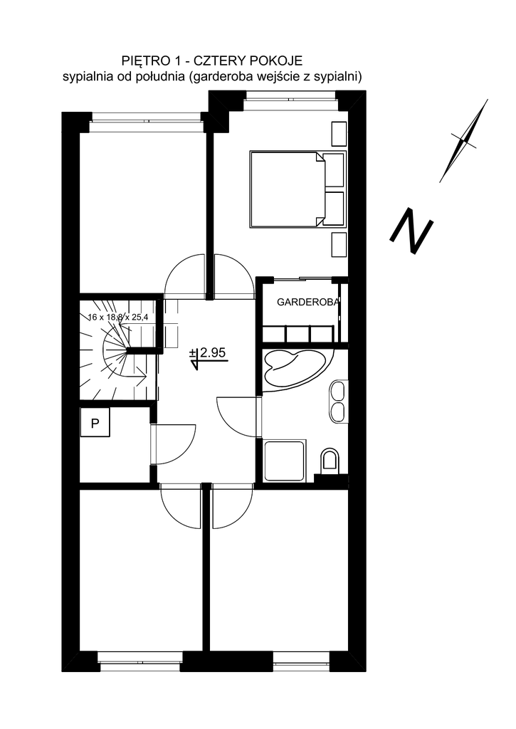 PIĘTRO 1 - CZTERY POKOJE sypialnia od południa (garderoba wejście z sypialni) N GARDEROBA 16 x 18,8 x 25,4 ± 2.95 P