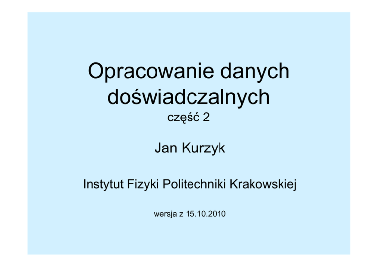 Opracowanie danych doświadczalnych część 2 Jan Kurzyk Instytut Fizyki Politechniki Krakowskiej wersja z 15.10.2010 Statystyka niepewności przypadkowych pomiarów bezpośrednich Wykonano 2 serie po 130 pomiarów napięcia w obwodzie elektrycznym. Wyniki zebrano w poniŜszych tabelach (krotność oznacza ile razy wystąpiła dana wartość) Tabela danych 1. Tabela danych 2. 14 12 12 10 10 8 Krotność K r otnoś ć 8 6 6 4 4 2 2 Napięcie U [V] Histogramy danych pomiarowych na podstawie Tabel danych 1 (lewy histogram) i 2 (prawy histogram). KaŜdy słupek ma wysokość wskazującą ile pomiarów uzyskało wartość z danego przedziału (tzw. przedziału klasowego). Szerokość przedziałów klasowych na histogramach wynosi 0,01V. 2,772 2,770 2,768 2,766 2,764 2,762 2,760 2,758 2,756 2,754 2,752 2,750 2,748 2,746 2,744 2,742 2,740 2,738 2 ,7 6 8 2 ,7 6 6 2 ,7 6 4 2 ,7 6 2 2 ,7 6 0 2 ,7 5 8 2 ,7 5 6 2 ,7 5 4 2 ,7 5 2 2 ,7 5 0 2 ,7 4 8 2 ,7 4 6 2 ,7 4 4 2 ,7 4 2 2 ,7 4 0 Napięcie U [V] 2,736 0 0 50 35 45 30 40 35 25 krotność Czestosc 30 25 20 15 20 15 10 10 5 5 0 0 2,740 2,745 2,750 2,755 2,760 Napięcie U [V] 2,765 2,770 2,775 2,735 2,74 2,745 2,75 2,755 2,76 2,765 2,77 2,775 Napięcie U [V] Histogramy danych pomiarowych na podstawie Tabel danych 1 (lewy histogram) i 2 (prawy histogram). KaŜdy słupek ma wysokość wskazującą ile pomiarów uzyskało wartość z danego przedziału (tzw. przedziału klasowego). Szerokość przedziałów klasowych na histogramach wynosi 0,05V. Obserwując przedstawione powyŜej histogramy dla dwóch serii pomiarowych zauwaŜamy, Ŝe w szczegółach róŜnią się one bardzo, lecz wykazują pewne prawidłowości. Przedziały, w którym występują wartości zmierzone w obu seriach są zbliŜone, krotność pomiarów ze środkowej części histogramów jest większa niŜ z obszarów skrajnych. W miarę wzrostu liczby pomiarów zauwaŜylibyśmy, Ŝe histogramy otrzymane na podstawie pomiarów danej wielkości wykonywanych w ten sam sposób (te same warunki, metoda, przyrządy) stają się coraz bardziej do siebie podobne. Gdyby krotność na histogramie zastąpić gęstością prawdopodobieństwa P (x), to w granicznym przypadku – dla nieskończonej liczby pomiarów (n→∞) i nieskończenie wąskich przedziałach klasowych (∆x→0) – histogram przyjął by postać gładkiej krzywej. Byłaby to symetryczna krzywa zwana krzywą Gaussa lub krzywą dzwonową, lub krzywą rozkładu normalnego. Carl Friedrich Gauss (1777-1855) – niemiecki matematyk, fizyk, astronom i geodeta. Jest uwaŜany za jednego z największych matematyków. Jego badania związane z teorią błędów doprowadziły do odkrycia rozkładu normalnego zmiennej losowej (nazywany takŜe rozkładem Gaussa), który jest najwaŜniejszym rozkładem w teorii prawdopodobieństwa. Jednym z najwaŜniejszych twierdzeń w rachunku prawdopodobieństwa jest tzw. centralne twierdzenie graniczne. Jedna z ogólniejszej wersji twierdzenia (twierdzenie Lindberga) stwierdza, Ŝe rozkład sum zmiennych losowych niezaleŜnie od rozkładu tych zmiennych (przy spełnieniu tzw. warunku Lindberga) zbiega się w granicznym przypadku do rozkładu normalnego. Twierdzenie to uzasadnia zatem powszechne występowanie w przyrodzie rozkładu normalnego. W naszym przypadku chodzi o to, Ŝe jeśli na wynik pomiaru wpływa bardzo duŜo drobnych czynników, to niezaleŜnie od rozkładu statystycznego tych czynników wyniki pomiaru będą podlegać rozkładowi Gaussa. Uwaga: niektóre typy pomiarów mogą podlegać innej statystyce. Np. pomiary związane z rozpadem promieniotwórczym podlegają rozkładowi Poissona. Przykładem eksperymentalnego dowodu centralnego twierdzenia granicznego jest tzw. deska Galtona. Kulki spadając odbijają się od gwoździ wbitych w deskę. Prawdopodobieństwo odbicia kulki od gwoździa w lewo lub w prawo jest jednakowe (0,5), czyli poszczególne zdarzenia podlegają rozkładowi dwumianowemu (zwanemu teŜ rozkładem Bernouliego). Kulki wpadając do przegródek tworzą histogram rozkładu, który jest prawie równy rozkładowi normalnemu. Dokładne podobieństwo dostalibyśmy w przypadku granicznym, tzn., gdyby kulki i przegródki były nieskończenie małe, a liczba gwoździ nieskończona. Deska Galtona ilustruje więc sposób powstawania w naturze rozkładu normalnego pod wpływem drobnych losowych odchyleń. Francis Galton ( 1822-1911) – angielski podróŜnik, przyrodnik, antropolog, pisarz, lekarz i statystyk. Gęstość prawdopodobieństwa W przypadku ciągłej zmiennej losowej x moŜemy mówić o prawdopodobieństwie wystąpienia jakiejś wartości tej zmiennej z określonego przedziału. Gęstość prawdopodobieństwa P (x), jest funkcją rozkładu prawdopodobieństwa dla ciągłej zmiennej losowej x. Całka oznaczona z takiej funkcji równa jest prawdopodobieństwu P wystąpienia zdarzenia zawartego w granicach całkowania b P( x ∈ [a, b]) = ∫ P( x)dx. W szczególności ∞ a ∫ P( x)dx = 1. −∞ Gęstość prawdopodobieństwa dla rozkładu Gaussa ma postać P( x) = 1 σ 2π −( x−µ )2 e 2σ 2 . Rozkład Gaussa charakteryzują dwa parametry: µ (nazywany średnią) i σ (nazywany odchyleniem standardowym). Krzywa Gaussa jest symetryczna względem parametru µ (dla x = µ, gęstość prawdopodobieństwa rozkładu Gaussa jest maksymalna). Parametr σ decyduje o „smukłości” krzywej; czym mniejsza wartość tego parametru tym bardziej „smukłą” postać przyjmuje krzywa Gaussa. W punktach x = -σ i x = σ krzywa Gaussa ma punkty przegięcia. Rozkład Gaussa jest unormowany do 1, czyli niezaleŜnie od parametrów µ i σ ∞ 1 σ 2π Ponadto 1 σ 2π 1 σ 2π 1 σ 2π ∫e 2σ 2 dx = 1 −∞ −( x−µ )2 µ +σ ∫ µ σ − ( x− µ )2 e 2σ 2 dx ≈ 0,683, − −( x−µ )2 µ + 2σ e ∫ µ σ 2σ 2 dx ≈ 0,955, −2 −( x−µ )2 µ + 3σ ∫ µ σ −3 e 2σ 2 dx ≈ 0,997, Pola pod krzywą Gaussa dla trzech róŜnych przedziałów: 1. [-σ, σ] 2. [-2