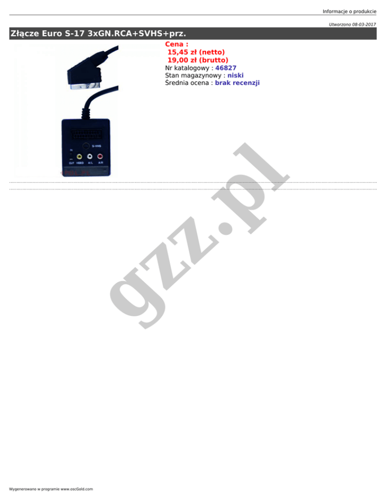 Informacje o produkcie Utworzono 08-03-2017 Złącze Euro S-17 3xGN.RCA+SVHS+prz. Cena : 15,45 zł (netto) 19,00 zł (brutto) gz z .p l Nr katalogowy : 46827 Stan magazynowy : niski Średnia ocena : brak recenzji Wygenerowano w programie www.oscGold.com