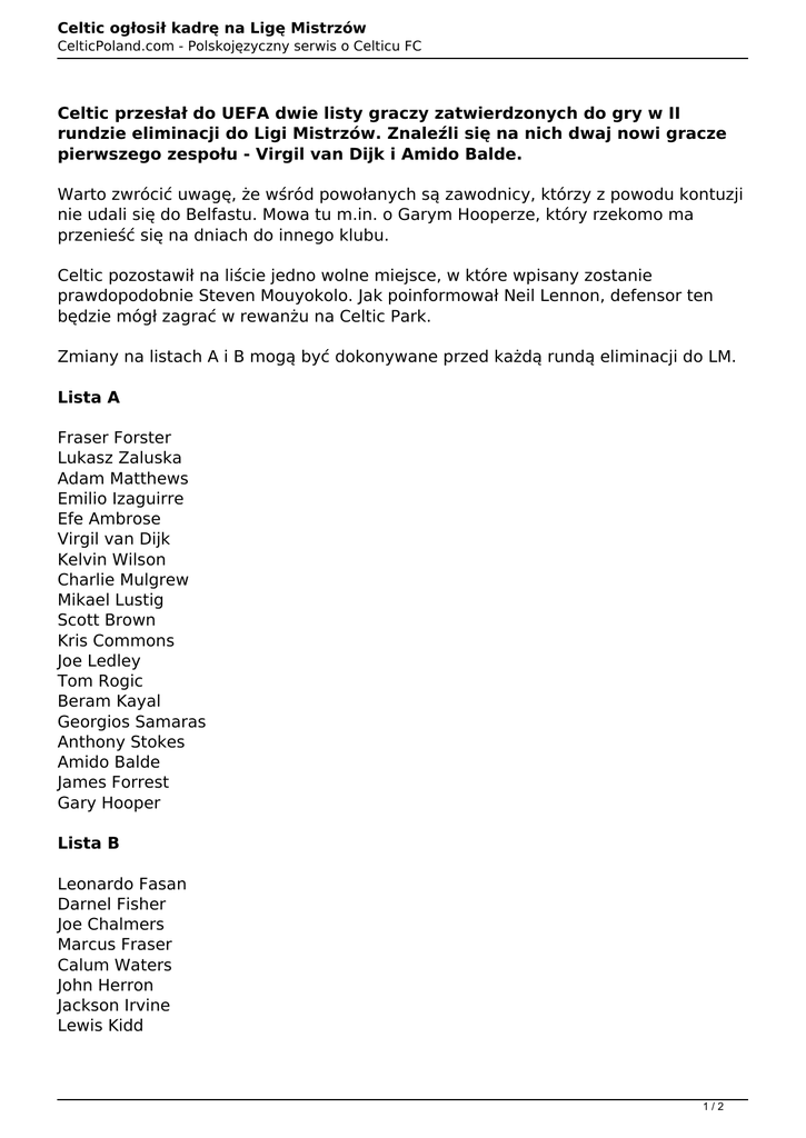 Celtic ogłosił kadrę na Ligę Mistrzów CelticPoland.com - Polskojęzyczny serwis o Celticu FC Celtic przesłał do UEFA dwie listy graczy zatwierdzonych do gry w II rundzie eliminacji do Ligi Mistrzów. Znaleźli się na nich dwaj nowi gracze pierwszego zespołu - Virgil van Dijk i Amido Balde. Warto zwrócić uwagę, że wśród powołanych są zawodnicy, którzy z powodu kontuzji nie udali się do Belfastu. Mowa tu m.in. o Garym Hooperze, który rzekomo ma przenieść się na dniach do innego klubu. Celtic pozostawił na liście jedno wolne miejsce, w które wpisany zostanie prawdopodobnie Steven Mouyokolo. Jak poinformował Neil Lennon, defensor ten będzie mógł zagrać w rewanżu na Celtic Park. Zmiany na listach A i B mogą być dokonywane przed każdą rundą eliminacji do LM. Lista A Fraser Forster Lukasz Zaluska Adam Matthews Emilio Izaguirre Efe Ambrose Virgil van Dijk Kelvin Wilson Charlie Mulgrew Mikael Lustig Scott Brown Kris Commons Joe Ledley Tom Rogic Beram Kayal Georgios Samaras Anthony Stokes Amido Balde James Forrest Gary Hooper Lista B Leonardo Fasan Darnel Fisher Joe Chalmers Marcus Fraser Calum Waters John Herron Jackson Irvine Lewis Kidd 1/2 Celtic ogłosił kadrę na Ligę Mistrzów CelticPoland.com - Polskojęzyczny serwis o Celticu FC Calum McGregor Dylan McGeouch Liam Henderson Filip Twardzik Tony Watt Bahrudin Atajic Paul George Patrik Twardzik Mick WACHOWSKI Autor: Mick Wachowski 2/2 Powered by TCPDF (www.tcpdf.org)