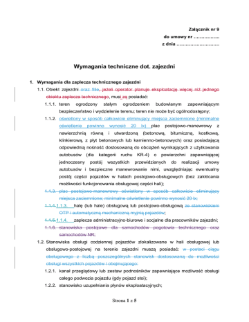Załącznik nr 9 do umowy nr …………….. z dnia ………………………. Wymagania techniczne dot. zajezdni 1. Wymagania dla zaplecza technicznego zajezdni 1.1. Obiekt zajezdni oraz filie, jeżeli operator planuje eksploatację więcej niż jednego obiektu zaplecza technicznego, musi zą posiadać: 1.1.1. teren ogrodzony stałym ogrodzeniem budowlanym zapewniającym bezpieczeństwo i wydzielenie terenu; teren nie może być ogólnodostępny; 1.1.2. oświetlony w sposób całkowicie eliminujący miejsca zaciemnione (minimalne oświetlenie nawierzchnią powinno równą wynosić i 20 lx) utwardzoną plac postojowo-manewrowy (betonową, bitumiczną, z kostkową, klinkierową, z płyt betonowych lub kamienno-betonowych) oraz posiadającą odpowiednią nośność dostosowaną do obciążeń wynikających z użytkowania autobusów jednoczesny (dla kategorii postój ruchu wszystkich KR-4) o powierzchni przewidzianych do zapewniającej realizacji umowy autobusów i bezpieczne manewrowanie nimi, uwzględniając ewentualny postój części pojazdów w halach postojowo-obsługowych (bez zakłócania możliwości funkcjonowania obsługowej części hali); 1.1.3. plac postojowo-manewrowy oświetlony w sposób całkowicie eliminujący miejsca zaciemnione; minimalne oświetlenie powinno wynosić 20 lx; 1.1.4.1.1.3. halę (lub hale) obsługową lub postojowo-obsługową ze stanowiskiem OTP i automatyczną mechaniczną myjnią pojazdów; 1.1.5.1.1.4. zaplecze administracyjno-biurowe i socjalne dla pracowników zajezdni; 1.1.6. stanowiska postojowe dla samochodów pogotowia technicznego oraz samochodów NR; 1.2. Stanowiska obsługi codziennej pojazdów zlokalizowane w hali obsługowej lub obsługowo-postojowej na terenie zajezdni muszą posiadać: w postaci ciągu obsługowego z liczbą poszczególnych stanowisk dostosowaną do możliwości obsługi wszystkich pojazdów i obejmującego: 1.2.1. kanał przeglądowy lub zestaw podnośników zapewniające możliwość obsługi całego podwozia pojazdu (gdy pojazd stoi); 1.2.2. stanowisko uzupełniania płynów eksploatacyjnych; Strona 1 z 5 1.2.3. stanowisko do sprzątania wnętrza pojazdu (stanowisko może się znajdować w osobnej hali); 1.2.4. automatyczną mechaniczną myjnię pojazdów zapewniającą umycie ściany czołowej, obu boków oraz ściany tylnej pojazdu (stanowisko może się znajdować w osobnej hali lub na zewnątrz); 1.3. Stanowiska obsługi bieżącej i okresowej pojazdów w postaci co najmniej dwóch stanowisk (innych niż stanowiska obsługi codziennej) do wykonywania przeglądów technicznych, napraw bieżących oraz czynności obsługowych przed badaniem technicznym dostosowane do możliwości obsługi wszystkich pojazdów i obejmujące muszą posiadać: 1.3.1. dwa kanały obsługowe lub minimum dwa zestawy podnośników zapewniające możliwość obsługi całego podwozia pojazdu; 1.3.2. stanowisko wymiany ogumienia; 1.3.3. stanowisko uzupełniania smarów i wymiany olejów; 1.3.4. urządzenia do sprawdzenia szczelności i działania układów chłodzenia, pneumatycznego, hamulcowego, hydraulicznego, elektrycznego; 1.3.5. urządzenia do sprawdzenia prawidłowości działania zawieszenia oraz układu kierowniczego; 1.3.6. urządzenia diagnostyczne i stanowisko do sprawdzenia prawidłowości działania systemów elektronicznych. 1.4. Wszystkie obiekty zaplecza technicznego muszą spełniać odpowiednie wymagania prawne i stosowne dopuszczenia dla użytkowania jako zaplecze eksploatacji pojazdów. 1.5. Hala (lub hale) obsługowe lub postojowo-obsługowe muszą spełniać warunki: 1.5.1. budynki jak i inne obiekty budowlane, w których znajdują się pomieszczenia pracy, powinny być zbudowane i utrzymywane zgodnie z przepisami techniczno-budowlanymi, obowiązującymi polskimi normami, wytycznymi oraz zasadami wiedzy technicznej; 1.5.2. wszystkie obiekty budowlane zaplecza technicznego muszą spełniać odpowiednie wymagania prawne i stosowne dopuszczenia dla użytkowania jako zaplecze eksploatacji pojazdów; 1.5.3. wszystkie obiekty budowlane muszą być wyposażone w instalacje sanitarne, ogrzewania, wentylacji i elektryczną oraz posiadać odpowiednie właściwości cieplne przegród zewnętrznych w zakresie, wielkości i formie pozwalającej na realizację usług serwisowych w warunkach pracy opisanymi w Rozporządzeniu Ministra Pracy i Polityki Socjalnej w sprawie ogólnych Strona 2 z 5 przepisów bezpieczeństwa i higieny pracy (tj. Dz. U. 2003 nr 169, poz.1650) ze zm.; 1.5.4. wszystkie hale muszą być utrzymywane w należytym stanie technicznofunkcjonalnym, co powinno być potwierdzone prowadzonymi dla tych obiektów „Książkami obiektu budowlanego” zgodnie z obowiązującym prawem w rozumieniu art. 64 Prawa Budowlanego; 1.5.5. wymagania dotyczące pomieszczeń i stanowisk pracy powinny spełniać wymogi zawarte w Rozporządzeniu Ministra Pracy i Polityki Socjalnej w sprawie ogólnych przepisów bezpieczeństwa i higieny pracy (tj. Dz. U. 2003 nr 169, poz.1650) ze zm.; do najistotniejszych wymagań w tym zakresie (wynikających z Rozporządzenia) należą: 1.5.5.1. pomieszczenia pracy, tj.: do wykonywania przeglądów, napraw czy obsługi autobusów oraz pomieszczenia przeznaczone na pobyt ludzi powinny być dostosowane do rodzaju wykonywanej pracy, wielkości obsługiwanego pojazdu i liczby zatrudnionych pracowników; 1.5.5.2. powierzchnia i wysokość pomieszczeń pracy powinny zapewniać spełnienie wymagań bezpieczeństwa i higieny pracy, z uwzględnieniem rodzaju wykonywanej pracy, stosowanych technologii oraz czasu przebywania pracowników w tych pomieszczeniach wg ww. Rozporządzenia Ministra Pracy i Polityki Socjalnej; 1.5.5.3. we wszystkich pomieszczeniach pracy, w których wykonywane są prace naprawcze, przeglądowe lub obsługowe autobusów należy zapewnić wentylację naturalną, mechaniczną lub obie jednocześnie; wentylację naturalną mogą stanowić odpowiednio usytuowane otwory okienne, dachowe o