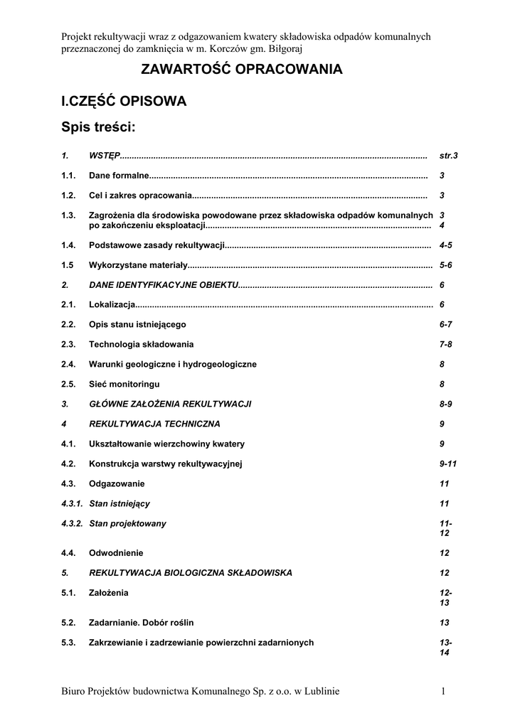 Projekt rekultywacji wraz z odgazowaniem kwatery składowiska odpadów komunalnych przeznaczonej do zamknięcia w m. Korczów gm. Biłgoraj ZAWARTOŚĆ OPRACOWANIA I.CZĘŚĆ OPISOWA Spis treści: 1. WSTĘP................................................................................................................................ str.3 1.1. Dane formalne.................................................................................................................... 3 1.2. Cel i zakres opracowania.................................................................................................. 3 1.3. Zagrożenia dla środowiska powodowane przez składowiska odpadów komunalnych 3 po zakończeniu eksploatacji.............................................................................................. 4 1.4. Podstawowe zasady rekultywacji...................................................................................... 4-5 1.5 Wykorzystane materiały...................................................................................................... 5-6 2. DANE IDENTYFIKACYJNE OBIEKTU................................................................................. 6 2.1. Lokalizacja............................................................................................................................ 6 2.2. Opis stanu istniejącego 6-7 2.3. Technologia składowania 7-8 2.4. Warunki geologiczne i hydrogeologiczne 8 2.5. Sieć monitoringu 8 3. GŁÓWNE ZAŁOŻENIA REKULTYWACJI 8-9 4 REKULTYWACJA TECHNICZNA 9 4.1. Ukształtowanie wierzchowiny kwatery 9 4.2. Konstrukcja warstwy rekultywacyjnej 9-11 4.3. Odgazowanie 11 4.3.1. Stan istniejący 11 4.3.2. Stan projektowany 1112 4.4. Odwodnienie 12 5. REKULTYWACJA BIOLOGICZNA SKŁADOWISKA 12 5.1. Założenia 1213 5.2. Zadarnianie. Dobór roślin 13 5.3. Zakrzewianie i zadrzewianie powierzchni zadarnionych 1314 Biuro Projektów budownictwa Komunalnego Sp. z o.o. w Lublinie 1 Projekt rekultywacji wraz z odgazowaniem kwatery składowiska odpadów komunalnych przeznaczonej do zamknięcia w m. Korczów gm. Biłgoraj 5.4. Zabiegi agrotechniczne 14 5.4.1. Nawożenie mineralne 14 5.4.2. Siew 14 6. ZABEZPIECZENIE PRZECIWPOŻAROWE 14 6.1. Podstawowe przepisy 14 6.2. Własności fizyko-chemiczne metanu 1415 6.3. Podstawowe definicje 15 6.4. Zagrożenie wybuchem. Określenie stref zagrożenia wybuchem 15 6.5. Zasady bezpieczeństwa ppoż 15 7. KONTROLA I KONSERWACJA ZREKULTYWOWANEGO SKŁADOWISKA 1517 8. UWAGI KOŃCOWE 17 II.CZĘŚĆ GRAFICZNA Rys.1. Plan sytuacyjny – stan istniejący Rys.2. Plan sytuacyjny – stan po rekultywacji Rys.3. Profil podłużny po trasie drenażu rekultywacji Rys.4. Przekrój podłużny rekultywacji wysypiska : A - A Rys.5. Przekrój poprzeczny rekultywacji wysypiska : B - B Rys.6. Przekrój poprzeczny rekultywacji wysypiska : C – C Rys.7. Konstrukcja studni odgazowującej Biuro Projektów budownictwa Komunalnego Sp. z o.o. w Lublinie 1:500 1:500 1:100/500,1:100/250 1:200 1:200 1:200 2 Projekt rekultywacji wraz z odgazowaniem kwatery składowiska odpadów komunalnych przeznaczonej do zamknięcia w m. Korczów gm. Biłgoraj 1.WSTĘP 1.1. Dane formalne: Dokumentację techniczną rekultywacji wraz z odgazowaniem kwatery składowiska odpadów przeznaczonej do zamknięcia a usytuowanej na działce nr. 1458/3 w m. Korczów koło Biłgoraja wykonano na podstawie umowy nr.1009/09 zawartej pomiędzy Przedsiębiorstwem Gospodarki Komunalnej Spółka z o.o. w Biłgoraju ,ul.Łąkowa 13 ,a Biurem Projektów Budownictwa Komunalnego Spółka z o.o. w Lublinie , ul.Hutnicza 7. Właścicielem działki jest Gmina Biłgoraj a wieczystym użytkownikiem oraz eksploatatorem składowiska jest Przedsiębiorstwo Gospodarki Komunalnej Spółka z o.o. w Biłgoraju . 1.2. Cel i zakres opracowania: Celem niniejszej pracy jest, zgodnie ze zleceniem, projekt rekultywacji kwatery składowiska odpadów komunalnych w m. Korczów, służący uzyskaniu Decyzji o zamknięciu kwatery składowiska i zgody na wykonanie prac rekultywacyjnych. Przyjęto, że rekultywacja techniczna składowiska musi przyjąć jako punkt wyjścia aktualny stan terenu rekultywowanego składowiska. Założono, ze zaproponowane przedsięwzięcia techniczne powinny zmierzać do ochrony takich elementów środowiska jak krajobraz, wody gruntowe, wody powierzchniowe, gleba i powietrze. Dokumentacja poza rekultywacją techniczną obejmuje również rekultywację biologiczną. Dokumentację opracowano w oparciu o aktualne mapy sytuacyjno-wysokościowe terenu w skali 1:500, dostarczone przez Zamawiającego. Dokumentacja niniejsza jest kontynuacją założeń rekultywacyjnych przyjętych w projekcie budowlano-wykonawczym „Modernizacji i rozbudowy wysypiska śmieci /wraz z rekultywacją obecnie eksploatowanej części/ w m. Korczów opracowanym przez B.P.B.K. Lublin w 1998 r. i zatwierdzonym przez odnośne władze . 1.3. Zagrożenia dla środowiska powodowane przez składowiska odpadów komunalnych po zakończeniu eksploatacji: Pozostawione po zakończeniu eksploatacji nie zrekultywowane składowiska mogą przez długie lata stanowić uciążliwość dla otoczenia. Poniżej przedstawiono najbardziej charakterystyczne uciążliwości dla poszczególnych komponentów środowiska. - Zagrożenia dla wód podziemnych i powierzchniowych: wody podziemne i powierzchniowe mogą być zanieczyszczane wymywanymi ze złoża odpadów substancjami (będącymi produktami przemian biochemicznych w nim zachodzących lub innymi substancjami znajdującymi się w złożonych odpadach). - Zagrożenia dla powietrza atmosferycznego: Czystość powietrza atmosferycznego może być zagrożona poprzez możliwość emisji aerozoli bakteryjnych oraz pylenie. Obiekty, na których składowane były odpady zawierające duże ilości substancji organicznej mogą stanowić zagrożenie wywołane emisją gazu składowiskowego (biogazu). Migrujący ze składowisk gaz Biuro Projektów budownictwa Komunalnego Sp. z o.o