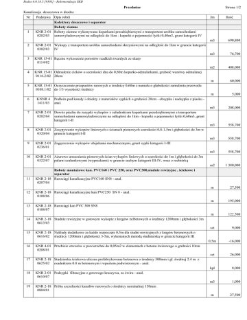 Rodos 6.0.18.5 [9303] - Rekomendacja SKB Strona 1/2 Przedmiar Kanalizacja deszczowa w drodze Nr Podstawa Opis robót 1 2 KNR 2-01 Wykopy z transportem urobku samochodami skrzyniowymi na odległość do 1km w gruncie kategorii 0302/03 IV 3 KNR 15-01 Ręczne wykoszenie porostów rzadkich twardych ze skarp 0114/02 4 KNR 15-01 Odmulenie cieków o szerokości dna do 0,80m koparko-odmularkami, grubość warstwy odmulanej 0116.2/02 20cm 5 6 7 KNNR 4 1411/03 m3 690,800 m3 76,700 m2 408,000 m 60,000 m 5,000 m3 208,000 m3 558,700 m3 558,700 m3 558,700 m2 1 380,000 m 27,500 m 195,000 m 122,500 szt 9,000 PodłoŜa pod kanały i obiekty z materiałów sypkich o grubości 20cm - obsypka i nadsypka z piasku anal. KNR 2-01 Dowóz piachu do zasypki wykopów z załadunkiem koparkami przedsiębiernymi z transportem 0202/04 samochodami samowyładowczymi na odległość do 1km - koparki o pojemności łyŜki 0,60m3, grunt kategorii I-II KNR 2-01 Zasypywanie wykopów liniowych o ścianach pionowych szerokości 0,8-1,5m i głębokości do 3m w 0320/04 gruncie kategorii I-II 9 KNR 2-01 Zagęszczenie wykopów ubijakami mechanicznymi, grunt sypki kategorii I-III 0236/01 10 KNR 2-01 AŜurowe umocnienie pionowych ścian wykopów liniowych o szerokości do 1m i głębokości do 3m 0322/07 palami szalunkowymi (wypraskami) w gruncie suchym kategorii III-IV, wraz z rozbiórką 12 Ilość KNR 15-01 Oczyszczenie przepustów rurowych o średnicy 0,60m z namułu o głębokości zamulenia przewodu 0108.1/02 do 1/3 wysokości średnicy 8 11 Jm Kolektory deszczowe i separator Roboty ziemne KNR 2-01 Roboty ziemne wykonywane koparkami przedsiębiernymi z transportem urobku samochodami 0202/03 samowyładowczymi na odległość do 1km - koparki o pojemności łyŜki 0,40m3, grunt kategorii IV Roboty montaŜowe kan. PVC160 i PVC 250, oraz PVC300,studnie rewizyjne , ściekowe i separator KNR 2-18 Rurociągi kanalizacyjne PVC160 SN8 - anal. 0207/04 KNR 2-18 Rurociągi kanalizacyjne kan PVC250 SN 8 - anal. 0108/06 13 KNR 2-18 Rurociągi kan PVC 300 SN8 0108/07 14 KNR 2-18 Studnie rewizyjne w gotowym wykopie z kręgów Ŝelbetowych o średnicy 1200mm i głębokości 3m 0613/03 15 KNR 2-18 Nakłady dodatkowe za kaŜde rozpoczęte 0,5m dla studni rewizyjnych z kręgów betonowych o 0616/02 średnicy 1200mm i głębokości 3-5m, wykonanych metodą studniarską w gruncie kategorii III 16 KNR 4-01 Przebicie otworów o powierzchni do 0,05m2 w elementach z betonu Ŝwirowego o grubości 10cm 0208/01 17 KNR 2-18 Studzienka ściekowa uliczna prefabrykowana betonowa o średnicy 500mm i gł. średniej 2.4 m z 0625/02 osadnikiem 0.8 m betonowym i wpustem podwórzowym - anal. 18 KNR 2-01 Podsypki filtracyjne z gotowego kruszywa, ze Ŝwiru - anal. 0610/07 19 KNR 2-18 Próba szczelności kanałów rurowych o średnicy nominalnej 150mm 0804/01 0,5m -16,000 szt 26,000 kpl 8,000 m3 1,000 m 27,500 Rodos 6.0.18.5 [9303] - Rekomendacja SKB Przedmiar Kanalizacja deszczowa w drodze Nr Podstawa Opis robót 20 KNR 2-18 Próba szczelności kanałów rurowych o średnicy nominalnej 250mm 0804/03 21 22 23 24 Strona 2/2 Jm Ilość m 195,000 m 122,500 kpl 1,000 kpl 1,000 szt 1,000 m3 0,200 m2 26,200 KNR 2-18 Próba szczelności kanałów rurowych o średnicy nominalnej 300mm 0804/04 MontaŜ separatora KNR 7-04 MontaŜ separatora 10/100 firmy ACO o masie do7,0t - kalk. R-0,1 0308/01 Zakup i dostawa Separatora 10/100 Wylot i umocnienie KNR 2-31 Obudowy betonowych wylotów kolektorów o średnicy 30cm - prefabrykowany 0602/03 25 KNR 2-18 Umocnienie skarp przy wylotach kanałów 0627/01 26 KNR 2-01 Umocnienie skarp i dna kanałów płytami prefabrykowanymi typu krata - kalk. 0520/01