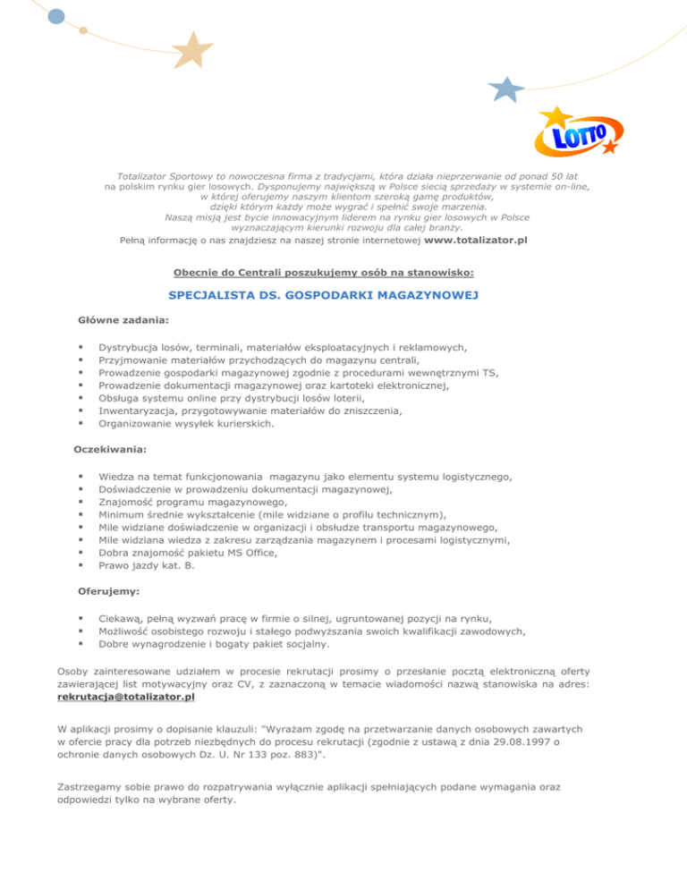 Totalizator Sportowy to nowoczesna firma z tradycjami, która działa nieprzerwanie od ponad 50 lat na polskim rynku gier losowych. Dysponujemy największą w Polsce siecią sprzedaży w systemie on-line, w której oferujemy naszym klientom szeroką gamę produktów, dzięki którym każdy może wygrać i spełnić swoje marzenia. Naszą misją jest bycie innowacyjnym liderem na rynku gier losowych w Polsce wyznaczającym kierunki rozwoju dla całej branży. Pełną informację o nas znajdziesz na naszej stronie internetowej www.totalizator.pl Obecnie do Centrali poszukujemy osób na stanowisko: SPECJALISTA DS. GOSPODARKI MAGAZYNOWEJ Główne zadania: Dystrybucja losów, terminali, materiałów eksploatacyjnych i reklamowych, Przyjmowanie materiałów przychodzących do magazynu centrali, Prowadzenie gospodarki magazynowej zgodnie z procedurami wewnętrznymi TS, Prowadzenie dokumentacji magazynowej oraz kartoteki elektronicznej, Obsługa systemu online przy dystrybucji losów loterii, Inwentaryzacja, przygotowywanie materiałów do zniszczenia, Organizowanie wysyłek kurierskich. Oczekiwania: Wiedza na temat funkcjonowania magazynu jako elementu systemu logistycznego, Doświadczenie w prowadzeniu dokumentacji magazynowej, Znajomość programu magazynowego, Minimum średnie wykształcenie (mile widziane o profilu technicznym), Mile widziane doświadczenie w organizacji i obsłudze transportu magazynowego, Mile widziana wiedza z zakresu zarządzania magazynem i procesami logistycznymi, Dobra znajomość pakietu MS Office, Prawo jazdy kat. B. Oferujemy: Ciekawą, pełną wyzwań pracę w firmie o silnej, ugruntowanej pozycji na rynku, Możliwość osobistego rozwoju i stałego podwyższania swoich kwalifikacji zawodowych, Dobre wynagrodzenie i bogaty pakiet socjalny. Osoby zainteresowane udziałem w procesie rekrutacji prosimy o przesłanie pocztą elektroniczną oferty zawierającej list motywacyjny oraz CV, z zaznaczoną w temacie wiadomości nazwą stanowiska na adres: [email protected] W aplikacji prosimy o dopisanie klauzuli: "Wyrażam zgodę na przetwarzanie danych osobowych zawartych w ofercie pracy dla potrzeb niezbędnych do procesu rekrutacji (zgodnie z ustawą z dnia 29.08.1997 o ochronie danych osobowych Dz. U. Nr 133 poz. 883)". Zastrzegamy sobie prawo do rozpatrywania wyłącznie aplikacji spełniających podane wymagania oraz odpowiedzi tylko na wybrane oferty.