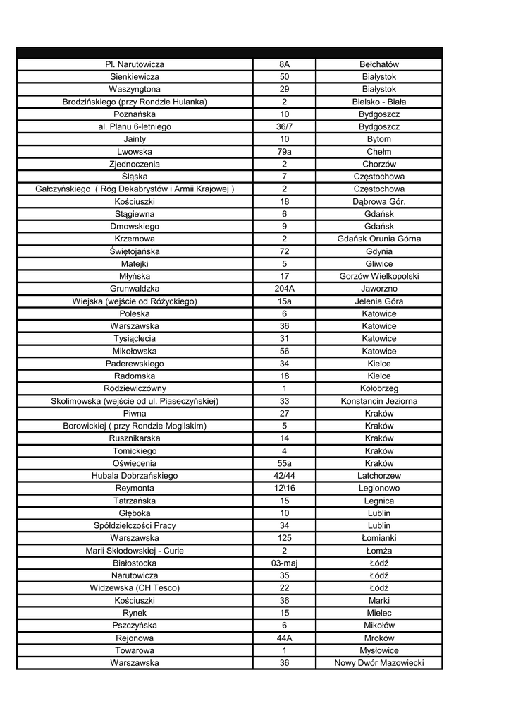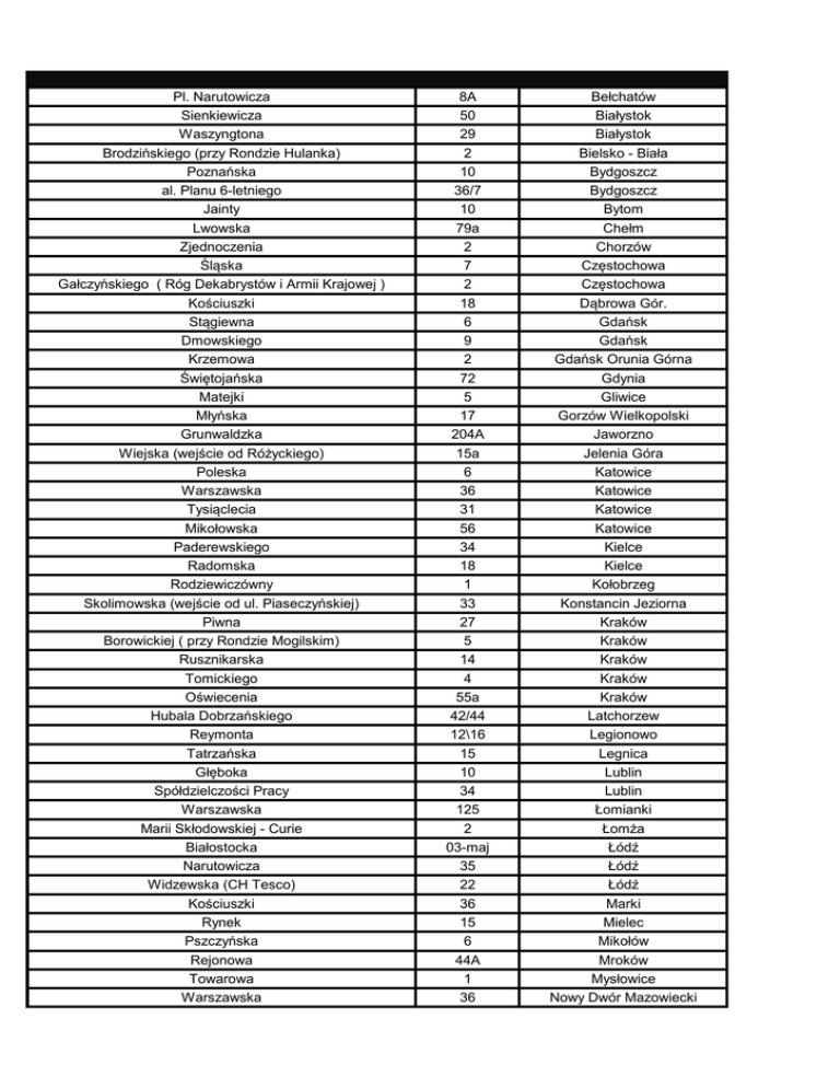 Pl. Narutowicza Sienkiewicza Waszyngtona Brodzińskiego (przy Rondzie Hulanka) Poznańska al. Planu 6-letniego Jainty Lwowska Zjednoczenia Śląska Gałczyńskiego ( Róg Dekabrystów i Armii Krajowej ) Kościuszki Stągiewna Dmowskiego Krzemowa Świętojańska Matejki Młyńska Grunwaldzka Wiejska (wejście od Różyckiego) Poleska Warszawska Tysiąclecia Mikołowska Paderewskiego Radomska Rodziewiczówny Skolimowska (wejście od ul. Piaseczyńskiej) Piwna Borowickiej ( przy Rondzie Mogilskim) Rusznikarska Tomickiego Oświecenia Hubala Dobrzańskiego Reymonta Tatrzańska Głęboka Spółdzielczości Pracy Warszawska Marii Skłodowskiej - Curie Białostocka Narutowicza Widzewska (CH Tesco) Kościuszki Rynek Pszczyńska Rejonowa Towarowa Warszawska 8A 50 29 2 10 36/7 10 79a 2 7 2 18 6 9 2 72 5 17 204A 15a 6 36 31 56 34 18 1 33 27 5 14 4 55a 42/44 12\16 15 10 34 125 2 03-maj 35 22 36 15 6 44A 1 36 Bełchatów Białystok Białystok Bielsko - Biała Bydgoszcz Bydgoszcz Bytom Chełm Chorzów Częstochowa Częstochowa Dąbrowa Gór. Gdańsk Gdańsk Gdańsk Orunia Górna Gdynia Gliwice Gorzów Wielkopolski Jaworzno Jelenia Góra Katowice Katowice Katowice Katowice Kielce Kielce Kołobrzeg Konstancin Jeziorna Kraków Kraków Kraków Kraków Kraków Latchorzew Legionowo Legnica Lublin Lublin Łomianki Łomża Łódź Łódź Łódź Marki Mielec Mikołów Mroków Mysłowice Nowy Dwór Mazowiecki Królowej Jadwigi Pieniężnego Jagiellońska Burskiego (róg Wilczyńskiego) Osmańczyka Kołłątaja Okulickiego Nowy Rynek Górecka Stróżyńskiego Święty Marcin (Galeria MM, 3 piętro) Działkowa Toruńska Mireckiego Żółkiewskiego Szkolna Chorzowska Pocztowa Piłsudskiego Rynkowa Wróblewskiego Niepodleglości 1 Maja Al. Wolności Waryńskiego Czarnieckiego Al. Piłsudskiego Zaranie (róg Dąbrowskiej) Os. Majowe Błonie Dzieci Polskich Rynek Nowomiejski Bocheńskiego 1 Maja (Galeria Victoria) Prosta Marszałkowska Nugat Ciołka Lechicka Malczewskiego Kochanowskiego Radiowa Rogalskiego Bazyliańska Miodowa Grochowska Przy Agorze Radzymińska Sokołowska Odkryta Gagarina 17 8 52A 1 2001-10-08 61 10 5 30 29 24 4a 1 14 4 1c 7 1 31 22 67 702 23 2 6 1\2 17 9 2 18e 2 7 64 2\14 18 4 11a 18 56 23 18 1F 4 23 12 11d 119 9/u32 41 13 Nowy Targ Olsztyn Olsztyn Olsztyn Opole Otwock Piaseczno (C.H. Kaufland) Płock Poznań Poznań Poznań Pruszków Radom Radom Radom Raszyn Ruda Śląska Rybnik Rzeszów Siedlce Siemianowice Śl. Sopot Sosnowiec Sosnowiec Starachowice Stargard Szczecin Szczecin Tarnów Tomaszów Mazowiecki Toruń Tychy Wałbrzych Warszawa Warszawa Warszawa Warszawa Warszawa Warszawa Warszawa Warszawa Warszawa Warszawa Warszawa Warszawa Warszawa Warszawa Warszawa Warszawa Warszawa Obrzeżna Ks. Prymasa Augusta Hlonda Rakietników Trakt Brzeski Kilińskiego "WZORCOWNIA" Wileńska Grabiszyńska Drobnera Kiełczowska Horbaczewskiego Roosevelta Powstańców Getta Żydowskiego Lokale wyłączone z akcji 1c 10 52 68 5 51 126a 32 51 c 21a 20b 43 34 Warszawa - Mokotów Warszawa - Wilanów Warszawa Ursus Warszawa-Wesoła Włocławek Wołomin Wrocław Wrocław Wrocław Wrocław Zabrze Ząbki Zduńska Wola Gołębia (Rudzki Most) Pułtuska Bolesława Chrobrego Strzelecka Gimnazjalna Wiejska Okrzei (Galeria Kosmos) Marii Skłodowskiej Curie 1 109 20B 36 2B 2 3 2 Tuchola Wyszków Oława Kościerzyna Nakło Zielona Góra Koszalin Łomża