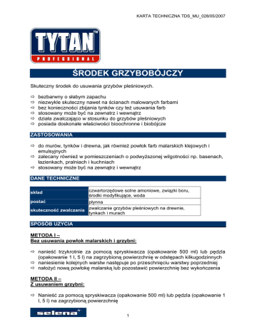 KARTA TECHNICZNA TDS_MU_028/05/2007 ŚRODEK GRZYBOB•JCZY Skuteczny środek do usuwania grzyb•w pleśniowych. bezbarwny o słabym zapachu niezwykle skuteczny nawet na ścianach malowanych farbami bez konieczności zbijania tynk•w czy też usuwania farb stosowany może być na zewnatrz i wewnątrz działa zwalczająco w stosunku do grzyb•w pleśniowych posiada doskonałe właściwości bioochronne i biob•jcze ZASTOSOWANIA do mur•w, tynk•w i drewna, jak r•wnież powłok farb malarskich klejowych i emulsyjnych zalecany r•wnież w pomieszczeniach o podwyższonej wilgotności np. basenach, łazienkach, pralniach i kuchniach stosowany może być na zewnątrz i wewnątrz DANE TECHNICZNE czwartorzędowe solne amoniowe, związki boru, środki modyfikujące, woda postać płynna skuteczność zwalczania zwalczanie grzyb•w pleśniowych na drewnie, tynkach i murach skład SPOS•B UZYCIA METODA I – Bez usuwania powłok malarskich i grzybni: nanieść trzykrotnie za pomocą spryskiwacza (opakowanie 500 ml) lub pędzla (opakowanie 1 l, 5 l) na zagrzybioną powierzchnię w odstępach kilkugodzinnych naniesienie kolejnych warstw następuje po przeschnięciu warstwy poprzedniej nałożyć nową powłokę malarską lub pozostawić powierzchnię bez wykończenia METODA II – Z usuwaniem grzybni: Nanieść za pomocą spryskiwacza (opakowanie 500 ml) lub pędzla (opakowanie 1 l, 5 l) na zagrzybioną powierzchnię 1 KARTA TECHNICZNA TDS_MU_028/05/2007 Usunąć pleśń, skażoną powłokę malarską lub skażoną warstwę tynku Oczyścić i odkurzyć podłoże Nanieść dwukrotnie za pomocą spryskiwacza (opakowanie 500 ml) lub pędzla (opakowanie 1 l, 5 l) na zagrzybioną powierzchnię w odstępach kilkugodzinnych Naniesienie kolejnej warstw następuje po przeschnięciu warstwy poprzedniej Nałożyć nowy tynk w przypadku jego wcześniejszego usunięcia Pomalować lub pozostawić powierzchnię bez wykończenia WYDAJNOŚĆ / ZUŻYCIE METODA I – Bez usuwania powłok malarskich i grzybni: Środek nakładamy w ilości ok. 0,5 l/m2 - jedna warstwa. METODA II – Z usuwaniem grzybni: Środek nakładamy w ilości ok. 0,2 l/m2 - jedna warstwa. PRZECHOWYWANIE I OPAKOWANIE Okres przechowywania 24 miesięcy (od daty produkcji) w oryginalnie zamkniętych opakowaniach, w suchych, dobrze wentylowanych pomieszczeniach z dala od miejsc składowania żywności, w temperaturze +5oC do +30oC. Opakowanie spryskiwacz 500 ml butelka 1 l kanister 5 l Ilość opakowań w kartonie 12 szt. 6 szt. 4 szt. UWAGI I ZALECENIA BHP prace należy prowadzić zgodnie z dokumentacją techniczną opracowaną dla konkretnego obiektu, zgodnie z wymogami przepis•w, uwzględniających zalecenia ekspertyz oraz właściwości techniczne produktu produkt należy aplikować w warunkach dobrej wentylacji stosując środek wewnątrz pomieszczeń należy wyeliminować bezpośredni kontakt użytkownik•w i żywności z zaimpregnowaną powierzchnią w czasie pracy nie spożywać posiłk•w, nie palić tytoniu, nie dotykać rękami twarzy, oczu itp. bezpośrednio po zakończeniu pracy umyć ręce i twarz w ciepłej wodzie podczas wykonywania prac należy stosować sprzęt ochrony osobistej (okulary, rękawice, fartuch) po wyschnięciu nałożonej powłoki przewietrzyć pomieszczenie do zaniku charakterystycznego zapachu narzędzia czyścić wodą wodociągową chronić środek przed osobami niepowołanymi, a szczeg•lnie przed dziećmi 2 KARTA TECHNICZNA TDS_MU_028/05/2007 w razie pożaru intensywnie schładzać wodą zagrożone pojemniki i sąsiadujące produkty palne. W ogniu i pod wpływem wysokich temperatur wydzielają się niebezpieczne pary, gazy i dymy szczeg•łowe dane dotyczące produktu dostępne są w Karcie Charakterystyki preparatu POSTĘPOWANIE Z ODPADAMI znak rodzaju materiału wytłoczony jest na opakowaniu. odpady traktować zgodnie z przepisami a puste opakowania jak odpady komunalne Aktualizacja 06.05.2008 Zawarte informacje, zalecenia i wskaz•wki zostały udzielone na podstawie najlepszej naszej wiedzy, badań, doświadczeń i w dobrej wierze. Nie ponosimy odpowiedzialności za skutki nieprawidłowego lub błędnego użycia naszych produkt•w. Każdy z użytkownik•w tego materiału upewni się na wszelkie możliwe sposoby, włącznie ze sprawdzeniem produktu końcowego w odpowiednich warunkach, o przydatności dostarczanych materiał•w dla osiągnięcia cel•w zamierzonych przez niego. 3