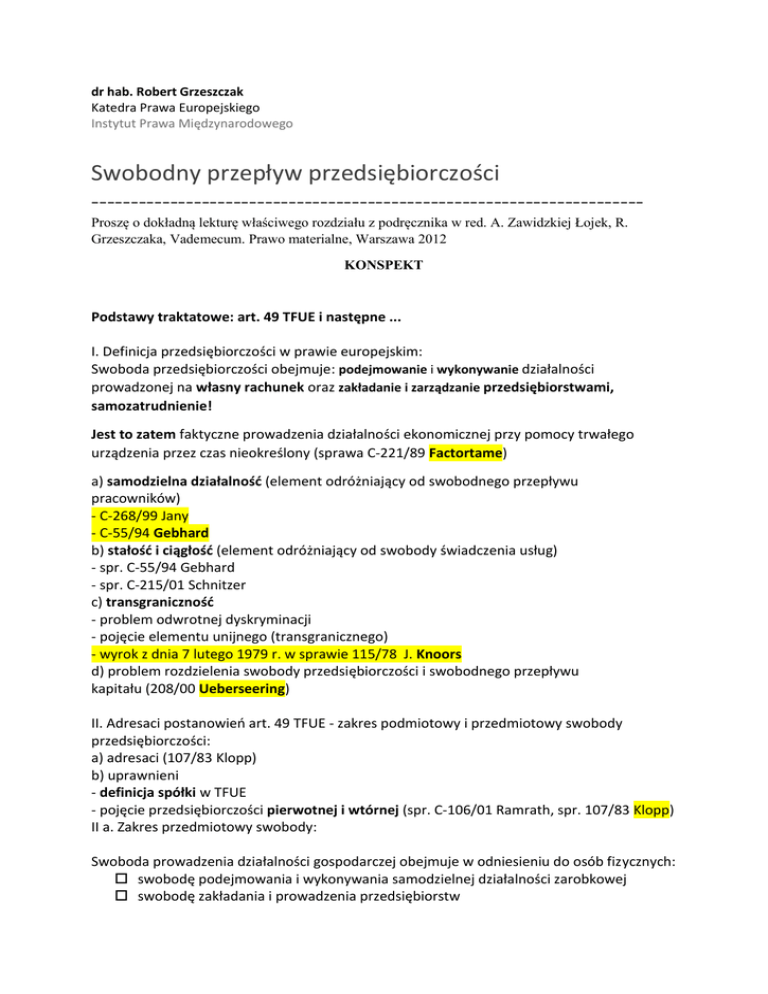 dr hab. Robert Grzeszczak Katedra Prawa Europejskiego Instytut Prawa Międzynarodowego Swobodny przepływ przedsiębiorczości ---------------------------------------------------------------------Proszę o dokładną lekturę właściwego rozdziału z podręcznika w red. A. Zawidzkiej Łojek, R. Grzeszczaka, Vademecum. Prawo materialne, Warszawa 2012 KONSPEKT Podstawy traktatowe: art. 49 TFUE i następne ... I. Definicja przedsiębiorczości w prawie europejskim: Swoboda przedsiębiorczości obejmuje: podejmowanie i wykonywanie działalności prowadzonej na własny rachunek oraz zakładanie i zarządzanie przedsiębiorstwami, samozatrudnienie! Jest to zatem faktyczne prowadzenia działalności ekonomicznej przy pomocy trwałego urządzenia przez czas nieokreślony (sprawa C-221/89 Factortame) a) samodzielna działalnośd (element odróżniający od swobodnego przepływu pracowników) - C-268/99 Jany - C-55/94 Gebhard b) stałośd i ciągłośd (element odróżniający od swobody świadczenia usług) - spr. C-55/94 Gebhard - spr. C-215/01 Schnitzer c) transgranicznośd - problem odwrotnej dyskryminacji - pojęcie elementu unijnego (transgranicznego) - wyrok z dnia 7 lutego 1979 r. w sprawie 115/78 J. Knoors d) problem rozdzielenia swobody przedsiębiorczości i swobodnego przepływu kapitału (208/00 Ueberseering) II. Adresaci postanowieo art. 49 TFUE - zakres podmiotowy i przedmiotowy swobody przedsiębiorczości: a) adresaci (107/83 Klopp) b) uprawnieni - definicja spółki w TFUE - pojęcie przedsiębiorczości pierwotnej i wtórnej (spr. C-106/01 Ramrath, spr. 107/83 Klopp) II a. Zakres przedmiotowy swobody: Swoboda prowadzenia działalności gospodarczej obejmuje w odniesieniu do osób fizycznych: swobodę podejmowania i wykonywania samodzielnej działalności zarobkowej swobodę zakładania i prowadzenia przedsiębiorstw swobodę nabywania i posiadania udziałów kapitałowych w tworzonych i istniejących spółkach, w odniesieniu do osób prawnych: swobodę zakładania i prowadzenia filii, oddziałów, przedstawicielstw lub spółek zależnych swobodę nabywania i posiadania udziałów kapitałowych w nowo zakładanych lub już istniejących orzecznictwo do opracowania WAŻNE i nowe: Sprawa Laval un Partneri C-341/05 (orzeczenie z dnia 18.12.2007r.) Sprawa Viking Lines C-438/05 (orzeczenie z dnia 11.12.2007r.) Sprawa Dirk Rüffert C-346/06 (orzeczenie z dnia 3.04.2008r.) III.: Transgraniczne przeniesienie spółki: teoria siedziby i teoria powstania: Uwaga – zagadnienie to jest i WAŻNE i jednocześnie TRUDNE 81/87 Daily Mail C-212/97 Centros, C- 208/00 Überseering wyrok w sprawie Insipre Art z 2000r. C-210/06 Cartesio Szerzej o transgranicznym przeniesieniu spółki – zob. materiał w odrębnym pliku. IV. Treśd swobody przedsiębiorczości a) zakaz dyskryminacji Wymóg obywatelstwa włoskiego dla prowadzenia aptek – niedopuszczalny (sprawa KE p . Włochy 63/86, por. także spr. Micheletti) Wymóg obywatelstwa belgijskiego dla wykonywania praktyki adwokackiej niedopuszczalny (sprawa Reyners 2/74!!!!) Sprawa Choquet 16/78 b) ogólny zakaz wprowadzania ograniczeo - C-19/92 Kraus: zakaz wprowadzania środków, które nawet jeśli stosowane są bez dyskryminacji ze względu na obywatelstwo, mogą utrudnid lub uczynid mniej atrakcyjnym wykonywanie podstawowych swobód zagwarantowanych w Traktacie - 07/83 Klopp - problem dyskryminacji podatkowej (C-80/94 Wielockx) - problem wzajemnego uznawania kwalifikacji – odrębne zajęcia V. Wyjątki od swobody przedsiębiorczości - z TFUE oraz wymogi imperatywne: formuła Gebhard VI. Wykonywanie władzy publicznej a swoboda przedsiębiorczości spr. 2/74 Reyners oraz sprawy połączone Wyrok C-47/08 (z 18 maja 2011 r.), C-50/08, C-51/08, C-52/08, C-53/08, C-54/08, C61/08; KE/ Belgia, KE/ Francja, KE/ Luksemburg, KE/ Portugalia, KE/ Austria, KE/ Niemcy, KE/ Grecja