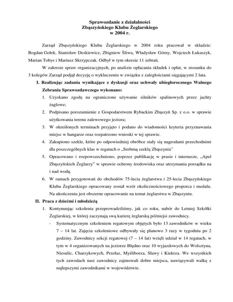 Sprawozdanie z działalno ci Zb szy skiego Klubu eglarskiego w 2004 r. Zarz d Zb szy skiego Klubu eglarskiego w 2004 roku pracował w składzie: Bogdan Gołek, Stanisław Deskiewicz, Zbigniew liwa, Władysław Górny, Wojciech Łukaszyk, Marian Tobys i Mariusz Skrzypczak. Odbył w tym okresie 11 zebra . W zakresie spraw organizacyjnych, po analizie opłacania składek i opłat, w stosunku do 3 kolegów Zarz d podj ł decyzj o wykluczeniu w zwi zku z zaległo ciami si gaj cymi 2 lata. I. Realizuj c zadania wynikaj ce z dyskusji oraz uchwały ubiegłorocznego Walnego Zebrania Sprawozdawczego wykonano: 1. Uzyskano zgod na ograniczone u ywanie silników spalinowych przez jachty aglowe; 2. Podpisano porozumienie z Gospodarstwem Rybackim Zb szy Sp. z o.o. w sprawie u ytkowania terenu zalewowego jeziora; 3. W okre lonych terminach przyj to i podano do wiadomo ci kryteria przyznawania miejsc w hangarze oraz rozpatrzono wnioski w tej sprawie. 4. Zakupiono szekle, które po odpowiedniej obróbce stały si nagrodami przechodnimi dla poszczególnych klas w regatach o „Srebrn szekl Zb szynia” 5. Opracowano i rozpowszechniono, poprzez publikacj w prasie i internecie, „Apel Zb szy skich eglarzy” w sprawie ochrony rodowiska oraz utrzymania porz dku na i nad wod . 6. W ramach przygotowa do obchodów 75-lecia eglarstwa i 25-lecia Zb szy skiego Klubu eglarskiego opracowany został wzór okoliczno ciowego proporca i medalu. Na uko czeniu jest obszerne opracowanie na temat eglarstwa w Zb szyniu. II. Praca z dzie mi i młodzie 1. Kontynuuj c szkolenia przeprowadzili my, jak co roku, nabór do Letniej Szkółki eglarskiej, w której zaczynaj sw karier - eglarsk pó niejsi zawodnicy. Systematycznym szkoleniem regatowym obj tych było 13 zawodników w wieku 7 – 14 lat. Zaj cia szkoleniowe odbywały si planowo 3 razy w tygodniu po 2 godziny. Zawodnicy sekcji regatowej (7 – 14 lat) wzi li udział w 14 regatach, w tym w 4 organizowanych na jeziorze Bł dno oraz 10 wyjazdowych do Wolsztyna, Niesulic, Charzykowych, Przełaz, My liborza, Sławy i Kiekrza. We wszystkich tych zawodach nasi zawodnicy zajmowali dobre miejsca, nawi zywali walk z najlepszymi zawodnikami w województwie. 2 Najwi kszymi osi gni ciami w 2004 roku było: - Mi dzywojewódzkie Mistrzostwa Młodzików w kl. Optymist - 3 miejsce w klasyfikacji generalnej i 4 miejsce w klasyfikacji dziewcz t. - Puchar Wolsztyna – 3 miejsce w ród dziewcz t w klasyfikacji do Pucharu Polski oraz 1 miejsce w wy cigu o „Bł kitn Wst g Jeziora Berzy skiego”. - Puchar Starosty wiebodzi skiego w Przełazach – 1 miejsce - Puchar Wójta Gminy Sk pe w Niesulicach – 2 miejsce. - Zakwalifikowanie si Partycji ołnierkiewicz do kadry młodzików woj. wielkopolskiego. - W klasyfikacji klubowej województwa wielkopolskiego zaj li my 5 miejsce (11 klubów) w klasie Optymist, a 12 miejsce na 20 kluby przy uwzgl dnieniu wszystkich klas. 2. W ramach współpracy z sekcj eglarsk Mi dzyszkolnego Uczniowskiego Klubu Sportowego „Gimnazjon” przy Gimnazjum w Zb szyniu udost pniali my młodzie y gimnazjalnej łód aglow typu Zefir oraz jachty OK.-Dinghy, które młodzie sama wyremontowała a nast pnie eksploatowała; 3. Równie w ramach współpracy z MUKS „Gimnazjon” w ub. roku przeprowadzony został kolejny kurs, zako czony egzaminem na stopie 4. Wspólnie z Wielkopolskim Okr gowym Zwi zkiem realizacj programu „ agle dla Wszystkich” eglarza jachtowego. eglarskim kontynuowali my skierowanego do dzieci niepełnosprawnych oraz z rodzin, którymi opiekuje si O rodek Pomocy Społecznej w Zb szyniu (udział wzi ło 51 dzieci, w tym 17 z Niemiec oraz 15 opiekunów) 5. eglarstwo w ród dzieci i młodzie y propagowali my poprzez: - Udział w organizacji pikników, z okazji Dnia Dziecka, dla dzieci ze „Szkoły ycia” oraz Przedszkola w Zb szyniu zabieraj c je na aglówki i wypływaj c na jezioro - Dzieci cy Zespół Taneczny „REGO”, prowadzony przez kole ank klubow , przygotował kolejn edycj widowiska muzycznego, opartego na szantach i ta cach marynarskich, pt. „Rejs” - Udost pniali my na rejsy po jeziorze łód typu DZ, z obsług , dla dzieci przedszkolnych, młodzie y szkolnej, gimnazjalnej oraz dla nauczycieli Byli my organizatorami 8 imprez na Jeziorze Bł dno, w których uczestniczyły dzieci i młodzie . 3 III. Zgodnie z zaakceptowanym przez Walne Zebranie kalendarzem, przeprowadzono nast puj ce imprezy: - sportowe: 1. regaty - rejs przez jezioro w ramach realizacji programu „ agle dla Wszystkich” – czerwiec 2. regaty „Katamaran Cup” zaliczane do „Pucharu Europy” – czerwiec 3. regaty o „Puchar Zb szynia” z okazji Dni Zb szynia i Dni Morza dla jachtów klasy Słonka i Omega – czerwiec 4. regaty dookoła Jeziora Bł dno – Memoriał Bronka Billewicza, wieloletniego zasłu onego członka naszego Klubu (4 edycja) – 15 sierpie 5. regaty o „Srebrn Szekl Zb szynia” (13 edycja), w tym jeden bieg dla samych sterników łodzi kabinowych o „Lamp Nawigacyjn ” – wrzesie 6. regaty o „Bł kitn Wst g Jeziora Bł dno” (44 edycja) dla najszybszej łódki generalnie, w tym o „Beczk ” dla najszybszej kabinówki – wrzesie - turystyczne: 1. Regaty rodzinne – Rejs jachtów kabinowych szlakiem Jezior Obrza skich dla całych rodzin we wrze niu. IV Prace zwi zane z modernizacj przystani 1. Przedłu enie o 10 m III pomostu – cumowniczego 2. Umocnienie i zabezpieczenie nabrze a przy III pomo cie 3. Przeprowadzenie konserwacji i wymiany uszkodzonych desek na pomostach 4. Wykonanie urz dzenia do monta u i demonta u pomostów. 5. Przyst piono do modernizacji plastikowych toalet – zlikwidowane zostan wewn trzne zbiorniki, a zainstalowane miski ust powe z dolnopłukami, które b d podł czone do szamba. Realizacja tych wszystkich przedsi wzi była mo liwa dzi ki du emu zaanga owaniu kole anek i kolegów w ich organizacj i wykonanie. Wielu udost pniło swoje prywatne jachty do realizacji zada na rzecz dzieci i młodzie y. Du pomoc, 