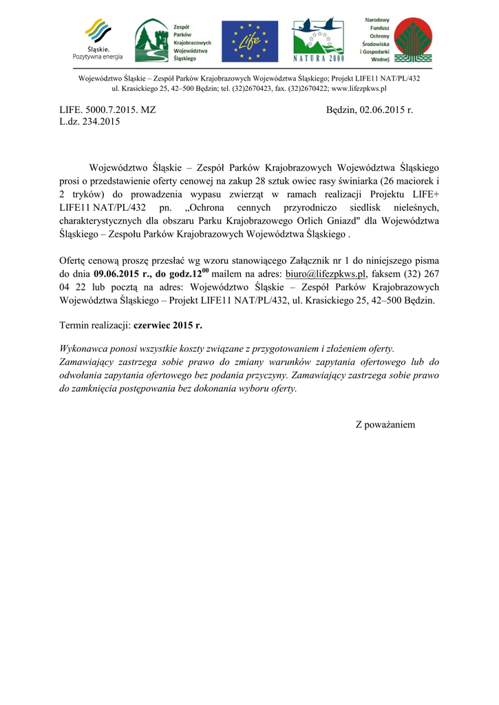 Województwo Śląskie – Zespół Parków Krajobrazowych Województwa Śląskiego; Projekt LIFE11 NAT/PL/432 ul. Krasickiego 25, 42–500 Będzin; tel. (32)2670423, fax. (32)2670422; www.lifezpkws.pl LIFE. 5000.7.2015. MZ L.dz. 234.2015 Będzin, 02.06.2015 r. Województwo Śląskie – Zespół Parków Krajobrazowych Województwa Śląskiego prosi o przedstawienie oferty cenowej na zakup 28 sztuk owiec rasy świniarka (26 maciorek i 2 tryków) do prowadzenia wypasu zwierząt w ramach realizacji Projektu LIFE+ LIFE11 NAT/PL/432 pn. „Ochrona cennych przyrodniczo siedlisk nieleśnych, charakterystycznych dla obszaru Parku Krajobrazowego Orlich Gniazd" dla Województwa Śląskiego – Zespołu Parków Krajobrazowych Województwa Śląskiego . Ofertę cenową proszę przesłać wg wzoru stanowiącego Załącznik nr 1 do niniejszego pisma do dnia 09.06.2015 r., do godz.1200 mailem na adres: [email protected], faksem (32) 267 04 22 lub pocztą na adres: Województwo Śląskie – Zespół Parków Krajobrazowych Województwa Śląskiego – Projekt LIFE11 NAT/PL/432, ul. Krasickiego 25, 42–500 Będzin. Termin realizacji: czerwiec 2015 r. Wykonawca ponosi wszystkie koszty związane z przygotowaniem i złożeniem oferty. Zamawiający zastrzega sobie prawo do zmiany warunków zapytania ofertowego lub do odwołania zapytania ofertowego bez podania przyczyny. Zamawiający zastrzega sobie prawo do zamknięcia postępowania bez dokonania wyboru oferty. Z poważaniem Województwo Śląskie – Zespół Parków Krajobrazowych Województwa Śląskiego; Projekt LIFE11 NAT/PL/432 ul. Krasickiego 25, 42–500 Będzin; tel. (32)2670423, fax. (32)2670422; www.lifezpkws.pl Załącznik nr 1 OFERTA CENOWA Zakup 28 sztuk owiec rasy świniarka (26 maciorek i 2 tryków) niezbędnych do właściwego prowadzenia wypasu zwierząt w ramach realizacji Projektu LIFE+ LIFE11 NAT/PL/432 pn. „Ochrona cennych przyrodniczo siedlisk nieleśnych, charakterystycznych dla obszaru Parku Krajobrazowego Orlich Gniazd" dla Województwa Śląskiego – Zespołu Parków Krajobrazowych Województwa Śląskiego. Sprzedawane zwierzęta powinny wieku od 1 do 3 lat. Planowany sposób wykorzystania zakupionych zwierząt to wypas prowadzony na siedliskach nieleśnych, na obszarze czterech Ostoi NATURA 2000 w Parku Krajobrazowym Orlich Gniazd. W cenie zakupu właściciel zwierząt – sprzedawca powinien zapewnić dowóz zwierząt do gospodarstw wskazanych przez Pracownika Zamawiającego oraz dokonać trwałego oznakowania owiec (np. w formie kolczyka) zawierającego nazwę, numer i logotypy Projektu (załącznik nr 2). Nie przewiduje się rozpatrywania ofert częściowych. Nazwa oferenta: Adres oferenta: Rasa owcy: Koszty zakupu Cena jednostkowa netto VAT w % Cena jednostkowa brutto MACIORKA TRYK ŁĄCZNY KOSZT ZAKUPU 28 SZT. OWIEC (26 MACIOREK, 2 TRYKI) Forma płatności Termin płatności od daty wystawienia FV Łączna cena netto oferty Przelew 30 dni. Łączna cena brutto oferty Wymogi formalne do złożenia oferty o zgłoszeniu się do ARiMR w celu uzyskania numeru producenta; rejestracji siedziby stada; prawidłowym oznakowaniu zwierząt i zgłoszeniu ich do rejestru (owca powinna posiadać kolczyk z numerem); zgłaszaniu zdarzenia dotyczącego zwierząt gospodarskich oznakowanych; prowadzeniu księgi rejestracji w każdej siedzibie stada, odrębnej dla poszczególnych gatunków zwierząt gospodarskich oznakowanych; prowadzeniu spisu owiec w stadzie co najmniej raz na 12 miesięcy. Termin realizacji: czerwiec 2015 r. – dokładny termin zostanie przekazany telefonicznie ……………………………………………………… (data i podpis) Województwo Śląskie – Zespół Parków Krajobrazowych Województwa Śląskiego; Projekt LIFE11 NAT/PL/432 ul. Krasickiego 25, 42–500 Będzin; tel. (32)2670423, fax. (32)2670422; www.lifezpkws.pl Załącznik nr 2 ELEMENTY SKŁADOWE KONIECZNE DO UMIESZCZENIA W RAMACH TRWAŁEGO OZNAKOWANIA ZWIERZĄT: Tekst: Projekt Life+ LIFE11 NAT/PL/432 Logotypy: Tekst dodatkowy (w miarę możliwości): „Ochrona cennych przyrodniczo siedlisk nieleśnych, charakterystycznych dla obszaru Parku Krajobrazowego Orlich Gniazd” Projekt wykonania kolczyków proszę przesłać na adres e-mail: [email protected] celem akceptacji przez Pracownika Projektu. ……………………………………………………… (data i podpis)