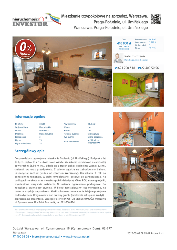 Mieszkanie trzypokojowe na sprzedaż, Warszawa, Praga-Południe, ul. Umińskiego Warszawa, Praga-Południe, ul. Umińskiego Cena 410 000 zł lub 1 782 zł miesięcznie Powierzchnia Cena za metr Liczba pokoi Piętro 56.8 m2 7 218 zł 3 15 / 15 Rafał Turczanik Doradca ds. nieruchomości 691 700 314 22 400 50 56 Informacje ogólne Nr oferty 30697 Powierzchnia 56.8 m2 Województwo Mazowieckie Winda tak Miasto Warszawa Balkon tak Dzielnica Praga-Południe Materiał budowy wielka płyta Liczba pokoi 3 Typ kuchni widna oddzielna Piętro 15 Pięter w budynku 15 Forma własności spółdzielcze własnościowe Szczegółowy opis Do sprzedaży trzypokojowe mieszkanie Gocławiu (ul. Umińskiego). Budynek z lat 80-tych, piętro 15 z 15, dwie nowe windy. Mieszkanie rozkładowe o całkowitej powierzchni 56,80 m kw., składa się z trzech pokoi, oddzielnej widnej kuchni, łazienki, wc oraz przedpokoju. Z salonu wyjście na zabudowany balkon. Ekspozycja: zachód (widok na centrum Warszawy). Mieszkanie 1 rok po generalnym remoncie, w pełni umeblowane, gotowe do zamieszkania. Na podłogach terakota oraz mozaika (pokój dziecięcy). Okna PCV, nowe grzejniki, wymienione wszystkie instalacje. W łazience ogrzewanie podłogowe. Do mieszkania przynależy piwnica. W bloku zainstalowany jest monitoring, na parterze znajduje się portiernia. Klatki schodowe po remoncie. Miejsce postojowe pod budynkiem. Uregulowany stan prawny gruntu (możliwość zakupu na kredyt). Zapraszam na prezentację. Szczegóły oferty: INVESTOR NIERUCHOMOŚCI Warszawa ul. Cynamonowa 19 - Rafał Turczanik, tel. 691-700-314. Nota prawna: Informacje dotyczące opisu nieruchomości podane są przez właściciela, mają charakter wyłącznie informacyjny i mogą podlegać aktualizacji. Oferta dotycząca nieruchomości stanowi zaproszenie do rokowań zgodnie z art. 71 Kodeksu Cywilnego i nie stanowi oferty określonej w art. 66 i następnych KC. Oddział Warszawa, ul. Cynamonowa 19 (Cynamonowy Dom), 02-777 Warszawa 77 400 01 76 • [email protected] • www.investor.net.pl 2017-03-08 08:05:41 Strona 1 z 1