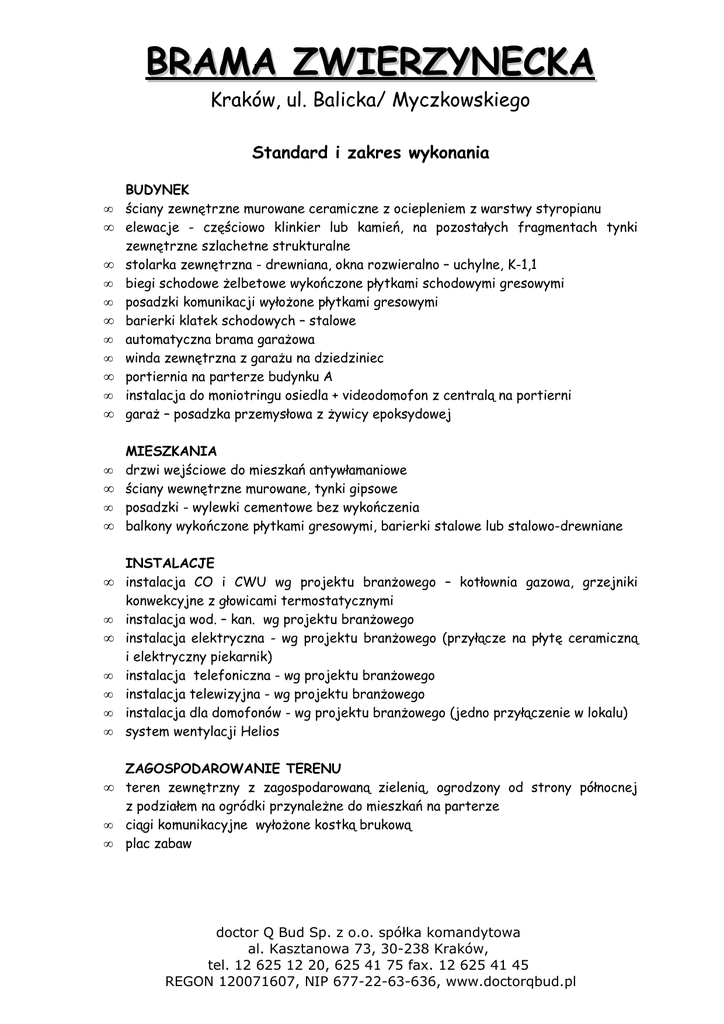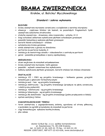 BRAMA ZWIERZYNECKA Kraków, ul. Balicka/ Myczkowskiego Standard i zakres wykonania • • • • • • • • • • • • • • • • • • • • • • • • • BUDYNEK ściany zewnętrzne murowane ceramiczne z ociepleniem z warstwy styropianu elewacje - częściowo klinkier lub kamień, na pozostałych fragmentach tynki zewnętrzne szlachetne strukturalne stolarka zewnętrzna - drewniana, okna rozwieralno – uchylne, K-1,1 biegi schodowe żelbetowe wykończone płytkami schodowymi gresowymi posadzki komunikacji wyłożone płytkami gresowymi barierki klatek schodowych – stalowe automatyczna brama garażowa winda zewnętrzna z garażu na dziedziniec portiernia na parterze budynku A instalacja do moniotringu osiedla + videodomofon z centralą na portierni garaż – posadzka przemysłowa z żywicy epoksydowej MIESZKANIA drzwi wejściowe do mieszkań antywłamaniowe ściany wewnętrzne murowane, tynki gipsowe posadzki - wylewki cementowe bez wykończenia balkony wykończone płytkami gresowymi, barierki stalowe lub stalowo-drewniane INSTALACJE instalacja CO i CWU wg projektu branżowego – kotłownia gazowa, grzejniki konwekcyjne z głowicami termostatycznymi instalacja wod. – kan. wg projektu branżowego instalacja elektryczna - wg projektu branżowego (przyłącze na płytę ceramiczną i elektryczny piekarnik) instalacja telefoniczna - wg projektu branżowego instalacja telewizyjna - wg projektu branżowego instalacja dla domofonów - wg projektu branżowego (jedno przyłączenie w lokalu) system wentylacji Helios ZAGOSPODAROWANIE TERENU teren zewnętrzny z zagospodarowaną zielenią, ogrodzony od strony północnej z podziałem na ogródki przynależne do mieszkań na parterze ciągi komunikacyjne wyłożone kostką brukową plac zabaw doctor Q Bud Sp. z o.o. spółka komandytowa al. Kasztanowa 73, 30-238 Kraków, tel. 12 625 12 20, 625 41 75 fax. 12 625 41 45 REGON 120071607, NIP 677-22-63-636, www.doctorqbud.pl