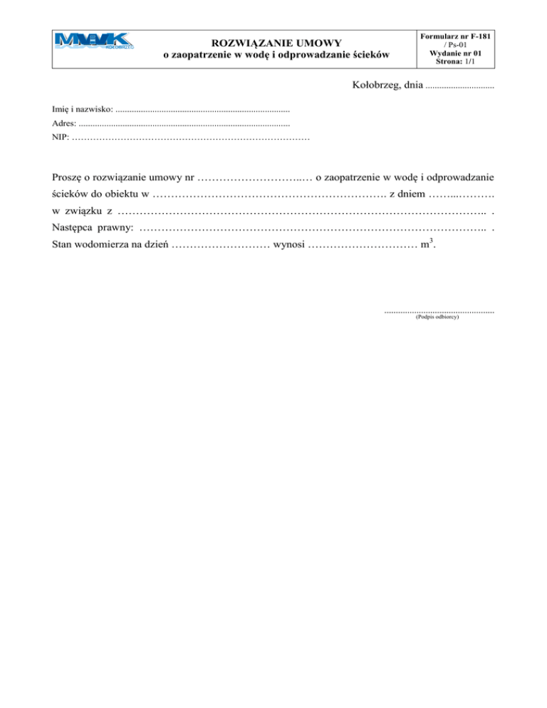 ROZWIĄZANIE UMOWY o zaopatrzenie w wodę i odprowadzanie ścieków Formularz nr F-181 / Ps-01 Wydanie nr 01 Strona: 1/1 Kołobrzeg, dnia .............................. Imię i nazwisko: ............................................................................ Adres: ............................................................................................ NIP: …………………………………………………………………… Proszę o rozwiązanie umowy nr ………………………..… o zaopatrzenie w wodę i odprowadzanie ścieków do obiektu w ………………………………………………………. z dniem ……...………. w związku z ……………………………………………………………………………………….. . Następca prawny: ………………………………………………………………………………….. . Stan wodomierza na dzień ……………………… wynosi ………………………… m3. ................................................ (Podpis odbiorcy)
