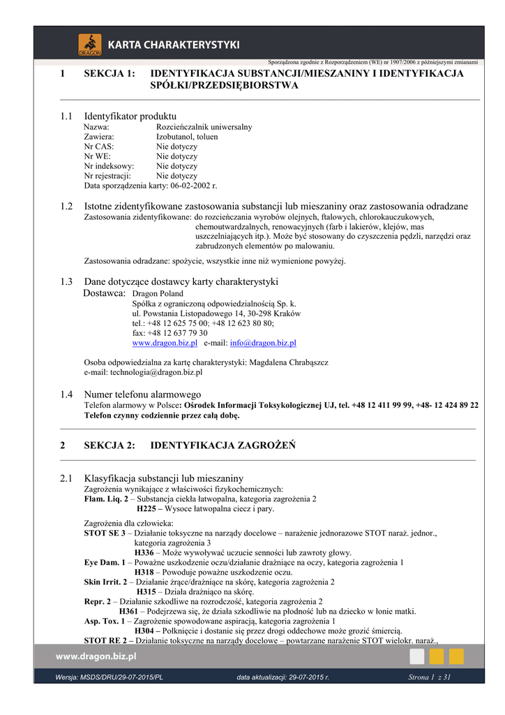 Sporządzona zgodnie z Rozporządzeniem (WE) nr 1907/2006 z późniejszymi zmianami 1 SEKCJA 1: IDENTYFIKACJA SUBSTANCJI/MIESZANINY I IDENTYFIKACJA SPÓŁKI/PRZEDSIĘBIORSTWA ___________________________________________________________________________________________________ 1.1 Identyfikator produktu Nazwa: Rozcieńczalnik uniwersalny Zawiera: Izobutanol, toluen Nr CAS: Nie dotyczy Nr WE: Nie dotyczy Nr indeksowy: Nie dotyczy Nr rejestracji: Nie dotyczy Data sporządzenia karty: 06-02-2002 r. 1.2 Istotne zidentyfikowane zastosowania substancji lub mieszaniny oraz zastosowania odradzane Zastosowania zidentyfikowane: do rozcieńczania wyrobów olejnych, ftalowych, chlorokauczukowych, chemoutwardzalnych, renowacyjnych (farb i lakierów, klejów, mas uszczelniających itp.). Może być stosowany do czyszczenia pędzli, narzędzi oraz zabrudzonych elementów po malowaniu. Zastosowania odradzane: spożycie, wszystkie inne niż wymienione powyżej. 1.3 Dane dotyczące dostawcy karty charakterystyki Dostawca: Dragon Poland Spółka z ograniczoną odpowiedzialnością Sp. k. ul. Powstania Listopadowego 14, 30-298 Kraków tel.: +48 12 625 75 00; +48 12 623 80 80; fax: +48 12 637 79 30 www.dragon.biz.pl e-mail: [email protected] Osoba odpowiedzialna za kartę charakterystyki: Magdalena Chrabąszcz e-mail: [email protected] 1.4 Numer telefonu alarmowego Telefon alarmowy w Polsce: Ośrodek Informacji Toksykologicznej UJ, tel. +48 12 411 99 99, +48- 12 424 89 22 Telefon czynny codziennie przez całą dobę. __________________________________________________________________________________________________ 2 SEKCJA 2: IDENTYFIKACJA ZAGROŻEŃ __________________________________________________________________________________________________ 2.1 Klasyfikacja substancji lub mieszaniny Zagrożenia wynikające z właściwości fizykochemicznych: Flam. Liq. 2 – Substancja ciekła łatwopalna, kategoria zagrożenia 2 H225 – Wysoce łatwopalna ciecz i pary. Zagrożenia dla człowieka: STOT SE 3 – Działanie toksyczne na narządy docelowe – narażenie jednorazowe STOT naraż. jednor., kategoria zagrożenia 3 H336 – Może wywoływać uczucie senności lub zawroty głowy. Eye Dam. 1 – Poważne uszkodzenie oczu/działanie drażniące na oczy, kategoria zagrożenia 1 H318 – Powoduje poważne uszkodzenie oczu. Skin Irrit. 2 – Działanie żrące/drażniące na skórę, kategoria zagrożenia 2 H315 – Działa drażniąco na skórę. Repr. 2 – Działanie szkodliwe na rozrodczość, kategoria zagrożenia 2 H361 – Podejrzewa się, że działa szkodliwie na płodność lub na dziecko w łonie matki. Asp. Tox. 1 – Zagrożenie spowodowane aspiracją, kategoria zagrożenia 1 H304 – Połknięcie i dostanie się przez drogi oddechowe może grozić śmiercią. STOT RE 2 – Działanie toksyczne na narządy docelowe – powtarzane narażenie STOT wielokr. naraż., ___________________________________________________________________________________________________ Wersja: MSDS/DRU/29-07-2015/PL data aktualizacji: 29-07-2015 r. Strona 1 z 31 Sporządzona zgodnie z Rozporządzeniem (WE) nr 1907/2006 z późniejszymi zmianami kategoria zagrożenia 2 H373 – Może powodować uszkodzenie narządów poprzez długotrwałe lub narażenie powtarzane. Zagrożenia dla środowiska: Nie jest klasyfikowany. 2.2 Elementy oznakowania Piktogram: GHS02 GHS05 Hasło ostrzegawcze: NIEBEZPIECZEŃSTWO GHS07 GHS08 Zwroty wskazujące rodzaj zagrożenia: H225 – Wysoce łatwopalna ciecz i pary. H304 – Połknięcie i dostanie się przez drogi oddechowe może grozić śmiercią. H315 – Działa drażniąco na skórą. H318 – Powoduje poważne uszkodzenie oczu. H336 – Może wywoływać uczucie senności lub zawroty głowy. H361 – Podejrzewa się, że działa szkodliwie na płodność lub na dziecko w łonie matki. H373 – Może powodować uszkodzenie narządów poprzez długotrwałe lub narażenie powtarzane. Zwroty określające warunki bezpiecznego stosowania: P102 – Chronić przed dziećmi. P210 – Przechowywać z dala od źródeł ciepła/iskrzenia/otwartego ognia/gorących powierzchni. Palenie wzbronione. P301+P310 – W PRZYPADKU POŁKNIĘCIA: Natychmiast skontaktować się z OŚRODKIEM ZATRUĆ lub z lekarzem. P304+P340 – W PRZYPADKU DOSTANIA SIĘ DO DRÓG ODDECHOWYCH: wyprowadzić lub wynieść poszkodowanego na świeże powietrze i zapewnić warunki do odpoczynku w pozycji umożliwiającej swobodne oddychanie. P305+P351+P338 – W PRZYPADKU DOSTANIA SIĘ DO OCZU: ostrożnie płukać wodą przez kilka minut. Wyjąć soczewki kontaktowe, jeżeli są i można je łatwo usunąć. Nadal płukać. P501 – Zawartość/pojemnik usuwać do firmy posiadającej odpowiednie uprawnienia zgodnie z krajowymi przepisami. 2.3 Inne zagrożenia Żadna z substancji wchodzących w skład mieszaniny nie spełnia kryteriów PBT lub vPvB zgodnie z załącznikiem XIII do rozporządzenia (WE) nr 1907/2006. Może tworzyć mieszaniny wybuchowe z powietrzem. __________________________________________________________________________________________________ 3 SEKCJA 3: SKŁAD / INFORMACJA O SKŁADNIKACH ___________________________________________________________________________________________________ 3.1 Substancje Nie dotyczy. 3.2 Mieszaniny Nazwa substancji: Nr indeksowy: Toluen 601-021-00-3 nr rejestracji: 01-2119471310-51-XXXX nr CAS 108-88-3 nr WE 203-625-9 uł. masowy w % 0 – 40 ___________________________________________________________________________________________________ Wersja: MSDS/DRU/29-07-2015/PL data aktualizacji: 29-07-2015 r. Strona 2 z 31 Sporządzona zgodnie z Rozporządzeniem (WE) nr 1907/2006 z późniejszymi zmianami Zagrożenia wynikające z właściwości fizykochemicznych: Flam. Liq. 2 – Substancja ciekła łatwopalna, kategoria zagrożenia 3 H225 – Wysoce łatwopalna ciecz i pary. Zagrożenia dla człowieka: Repr. 2 – Działanie szkodliwe na rozrodczość, kategoria zagrożenia 2 H361 – Podejrzewa si