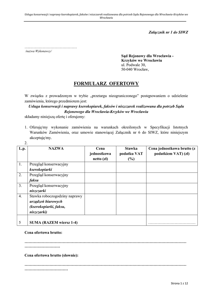 FORMULARZ OFERTOWY - Sąd Rejonowy dla Wrocławia