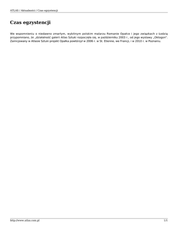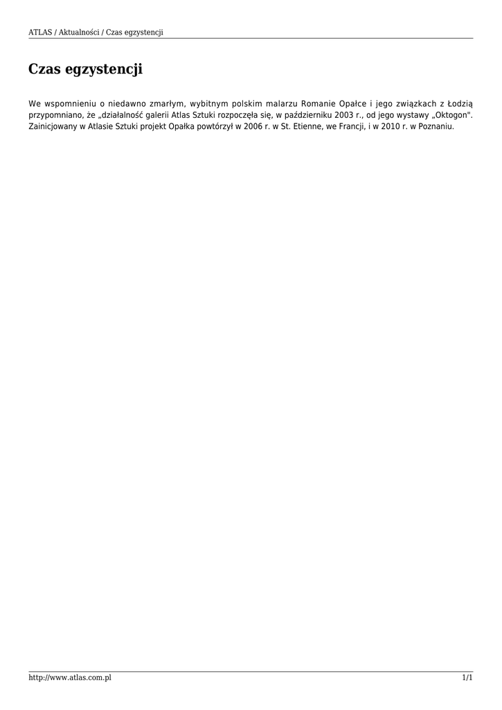 ATLAS / Aktualności / Czas egzystencji Czas egzystencji We wspomnieniu o niedawno zmarłym, wybitnym polskim malarzu Romanie Opałce i jego związkach z Łodzią przypomniano, że „działalność galerii Atlas Sztuki rozpoczęła się, w październiku 2003 r., od jego wystawy „Oktogon". Zainicjowany w Atlasie Sztuki projekt Opałka powtórzył w 2006 r. w St. Etienne, we Francji, i w 2010 r. w Poznaniu. http://www.atlas.com.pl 1/1