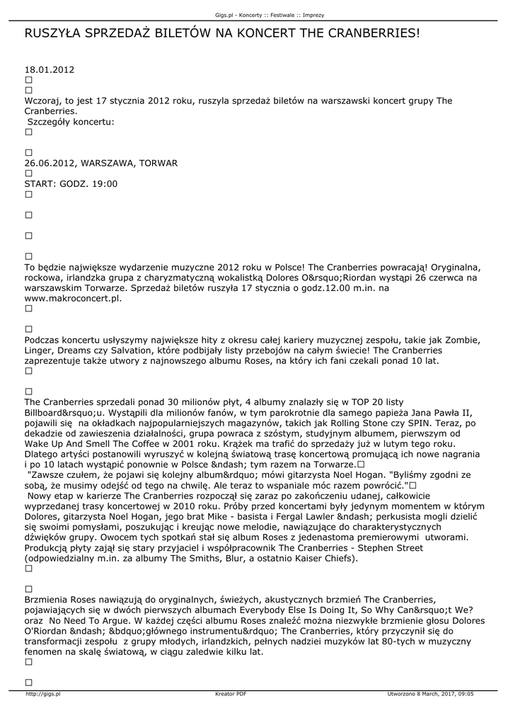 Gigs.pl - Koncerty :: Festiwale :: Imprezy RUSZYŁA SPRZEDAŻ BILETÓW NA KONCERT THE CRANBERRIES! 18.01.2012 Wczoraj, to jest 17 stycznia 2012 roku, ruszyla sprzedaż biletów na warszawski koncert grupy The Cranberries. Szczegóły koncertu: 26.06.2012, WARSZAWA, TORWAR START: GODZ. 19:00 To będzie największe wydarzenie muzyczne 2012 roku w Polsce! The Cranberries powracają! Oryginalna, rockowa, irlandzka grupa z charyzmatyczną wokalistką Dolores O’Riordan wystąpi 26 czerwca na warszawskim Torwarze. Sprzedaż biletów ruszyła 17 stycznia o godz.12.00 m.in. na www.makroconcert.pl. Podczas koncertu usłyszymy największe hity z okresu całej kariery muzycznej zespołu, takie jak Zombie, Linger, Dreams czy Salvation, które podbijały listy przebojów na całym świecie! The Cranberries zaprezentuje także utwory z najnowszego albumu Roses, na który ich fani czekali ponad 10 lat. The Cranberries sprzedali ponad 30 milionów płyt, 4 albumy znalazły się w TOP 20 listy Billboard’u. Wystąpili dla milionów fanów, w tym parokrotnie dla samego papieża Jana Pawła II, pojawili się na okładkach najpopularniejszych magazynów, takich jak Rolling Stone czy SPIN. Teraz, po dekadzie od zawieszenia działalności, grupa powraca z szóstym, studyjnym albumem, pierwszym od Wake Up And Smell The Coffee w 2001 roku. Krążek ma trafić do sprzedaży już w lutym tego roku. Dlatego artyści postanowili wyruszyć w kolejną światową trasę koncertową promującą ich nowe nagrania i po 10 latach wystąpić ponownie w Polsce – tym razem na Torwarze. "Zawsze czułem, że pojawi się kolejny album” mówi gitarzysta Noel Hogan. "Byliśmy zgodni ze sobą, że musimy odejść od tego na chwilę. Ale teraz to wspaniale móc razem powrócić." Nowy etap w karierze The Cranberries rozpoczął się zaraz po zakończeniu udanej, całkowicie wyprzedanej trasy koncertowej w 2010 roku. Próby przed koncertami były jedynym momentem w którym Dolores, gitarzysta Noel Hogan, jego brat Mike - basista i Fergal Lawler – perkusista mogli dzielić się swoimi pomysłami, poszukując i kreując nowe melodie, nawiązujące do charakterystycznych dźwięków grupy. Owocem tych spotkań stał się album Roses z jedenastoma premierowymi utworami. Produkcją płyty zajął się stary przyjaciel i współpracownik The Cranberries - Stephen Street (odpowiedzialny m.in. za albumy The Smiths, Blur, a ostatnio Kaiser Chiefs). Brzmienia Roses nawiązują do oryginalnych, świeżych, akustycznych brzmień The Cranberries, pojawiających się w dwóch pierwszych albumach Everybody Else Is Doing It, So Why Can’t We? oraz No Need To Argue. W każdej części albumu Roses znaleźć można niezwykłe brzmienie głosu Dolores O'Riordan – „głównego instrumentu” The Cranberries, który przyczynił się do transformacji zespołu z grupy młodych, irlandzkich, pełnych nadziei muzyków lat 80-tych w muzyczny fenomen na skalę światową, w ciągu zaledwie kilku lat. http://gigs.pl Kreator PDF Utworzono 8 March, 2017, 09:05 Gigs.pl - Koncerty :: Festiwale :: Imprezy Zespół powstał w roku 1989 i początkowo nazywał się Cranberry Saw Us. Dolores O’Riordan dołączyła do składu dwa lata później. W 1992 zadebiutowali swoim pierwszym krążkiem Everybody Else Is Doing It, So Why Can't We?, z którego pochodzą m.in. takie przeboje jak Linger, czy Dreams. Jednak największą sławę przyniósł im drugi album – No Need To Argue z 1994 roku, z którego pochodzi ich największy przebój Zombie. Później były jeszcze albumy To The Faithful Departed (1996), Bury The Hatchet (1998) i Wake Up And Smell The Coffee (2002). We wrześniu 2003 r., rozważając nagranie kolejnego albumu, zespół postanowił rozejść się na jakiś czas i pójść własnymi drogami. W trakcie tej przerwy niektórzy członkowie zespołu kontynuowali karierę solową, a inni całkowicie zawiesili działalność muzyczną. W 2009 roku Mike, Noel i Dolores wzięli udział w imprezie College w Dublinie i wykonali parę utworów The Cranberries. To spotkanie wystarczyło, aby w artystach ponownie rozbudzić miłość do wspólnego grania i tworzenia nowych utworów. W następnym roku wyruszyli w kolejną trasę koncertową podczas której wykonywali największe hity nagrane w przeciągu swojej całej kariery muzycznej. The Cranberries są pewni, że ich najnowsze dzieło usatysfakcjonuje w pełni fanów i pozwoli zdobyć rzesze nowych miłośników. Polska przekona się o tym podczas jedynego koncertu w Warszawie już w czerwcu tego roku. Źródło: Materiały promocyjne organizatora http://gigs.pl Kreator PDF Utworzono 8 March, 2017, 09:05